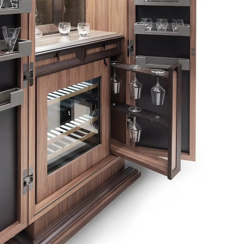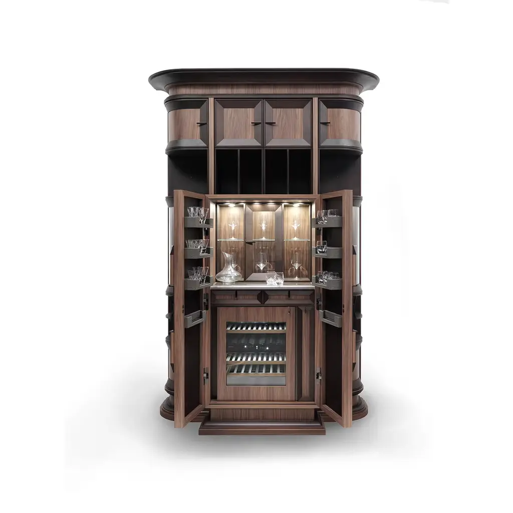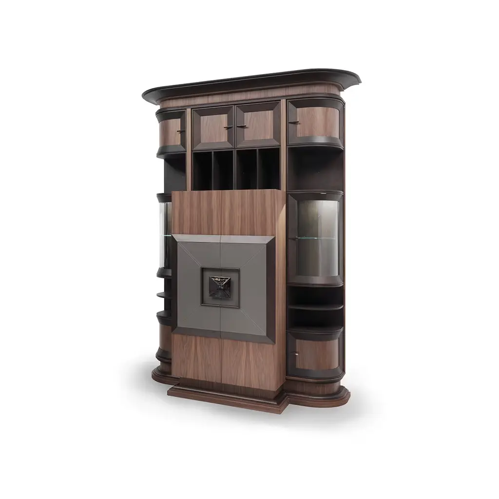This superb object of functional decor will set a lavish and exclusive tone in any interior decor thanks to its multi-functional design exuding prized flair. Combining solid wood and plywood for structural needs of lightness, the modular structure features curved sides and offers spacious compartments to keep books organized and a central unit equipped with all the necessary elements for a chic bar cabinet, including a sophisitcated lighting system.