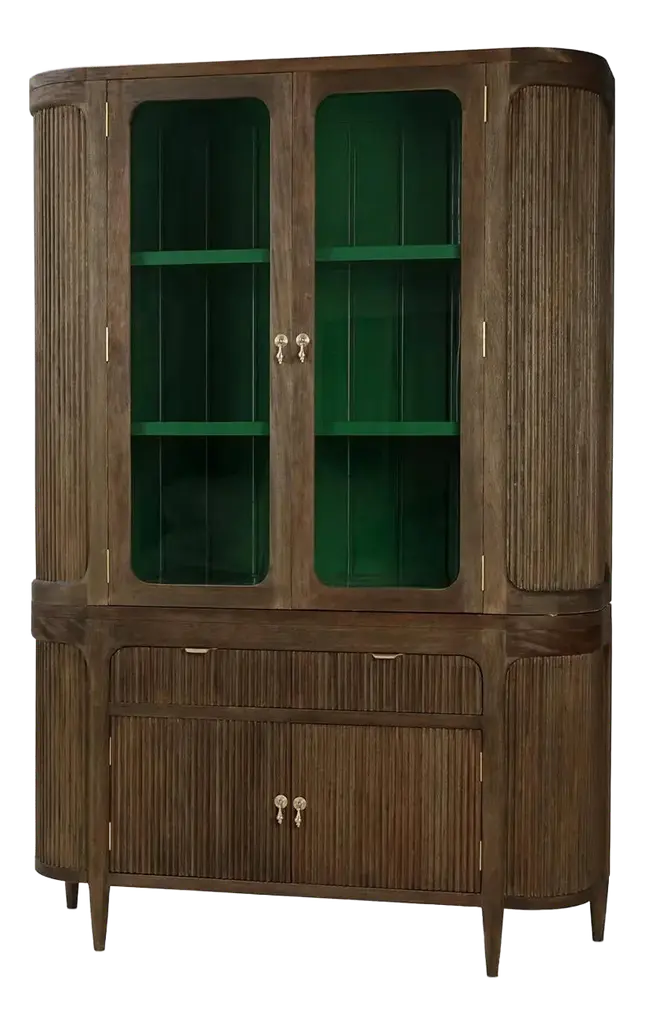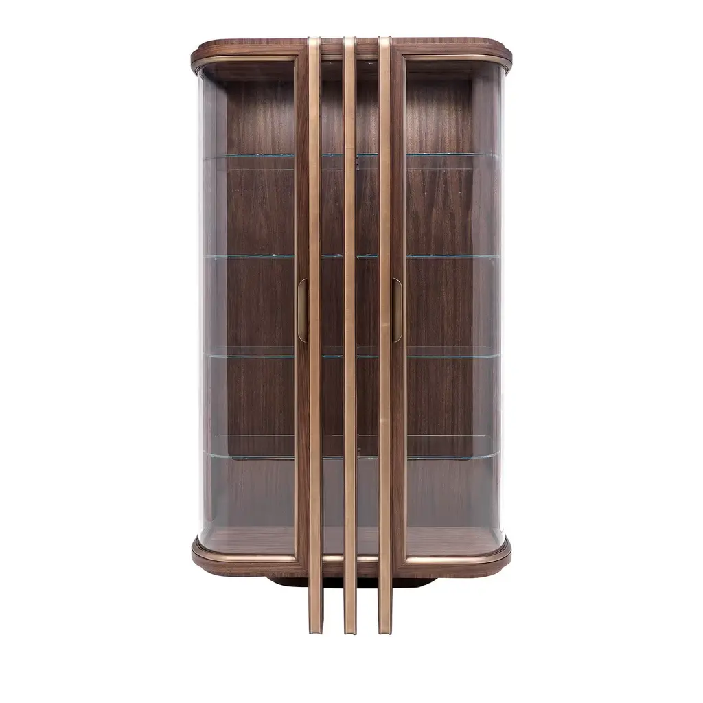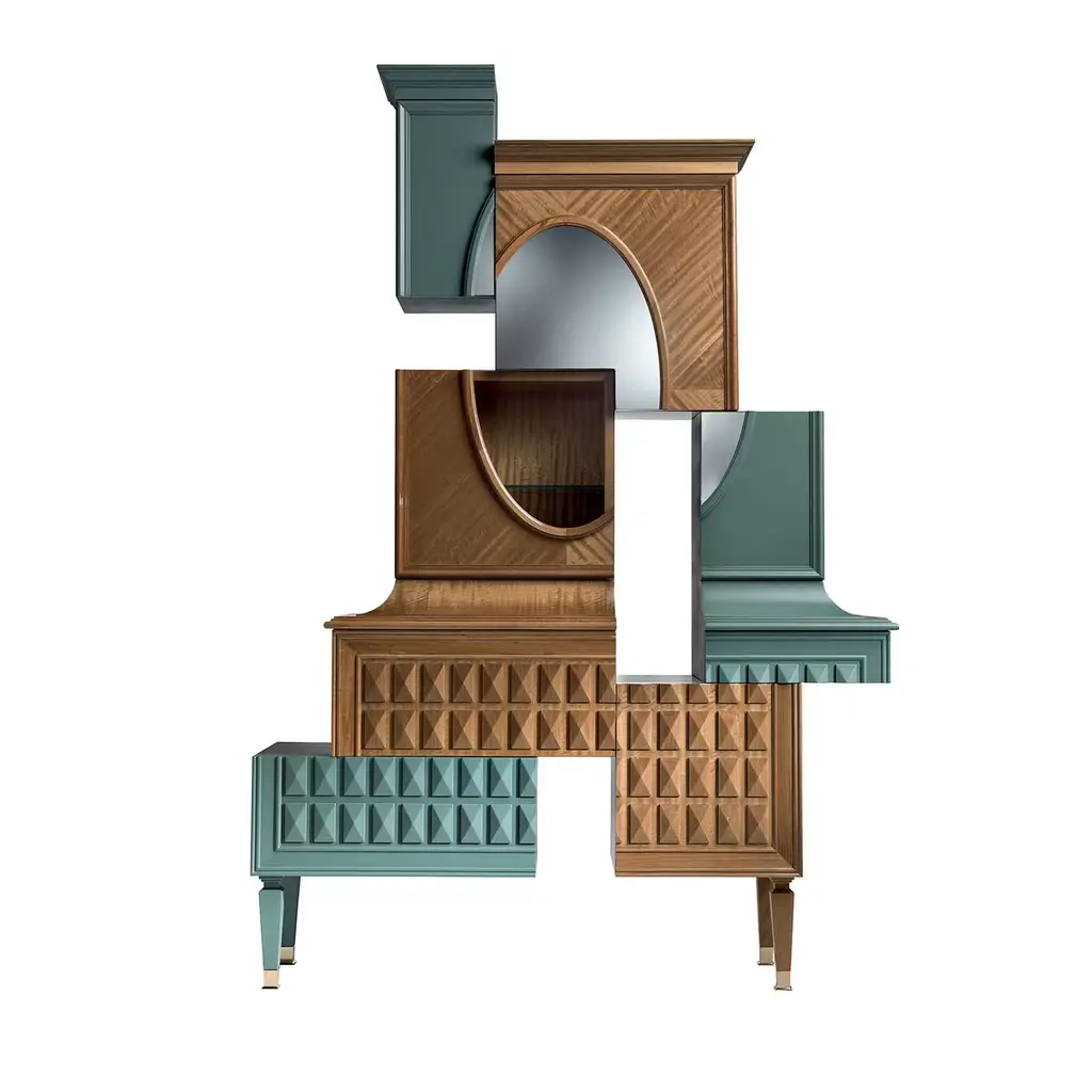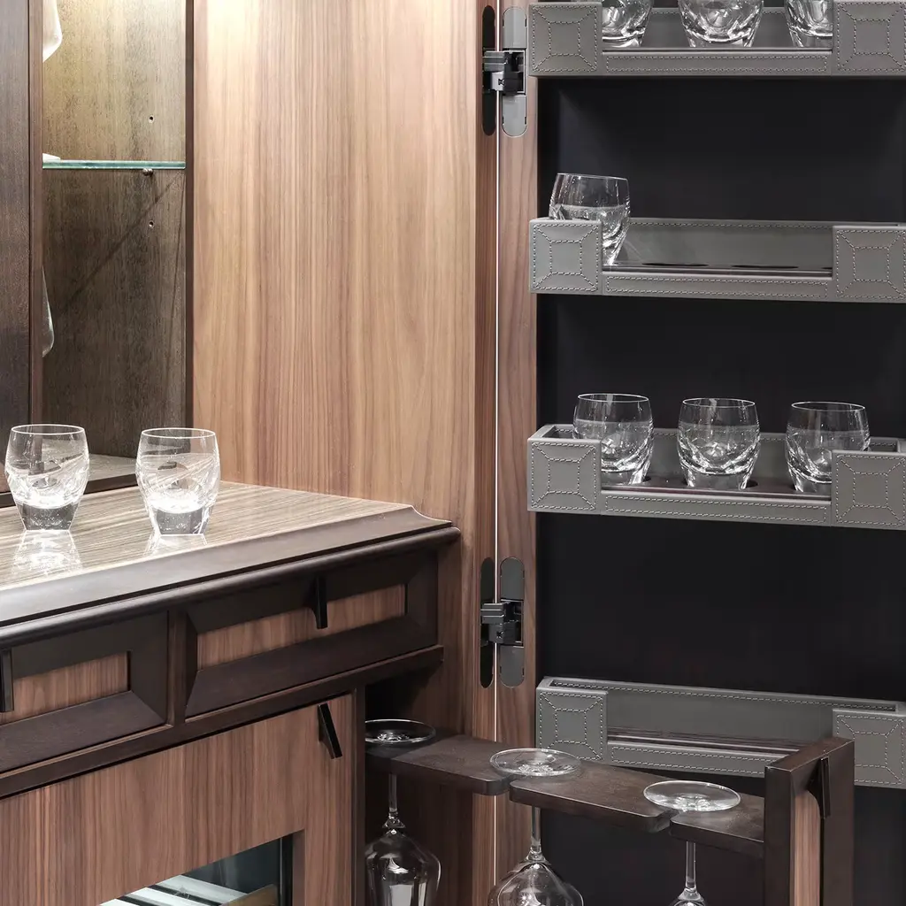 This superb object of functional decor will set a lavish and exclusive tone in any interior decor thanks to its multi-functional design exuding prized flair. Combining solid wood and plywood for structural needs of lightness, the modular structure features curved sides and offers spacious compartments to keep books organized and a central unit equipped with all the necessary elements for a chic bar cabinet, including a sophisitcated lighting system.
