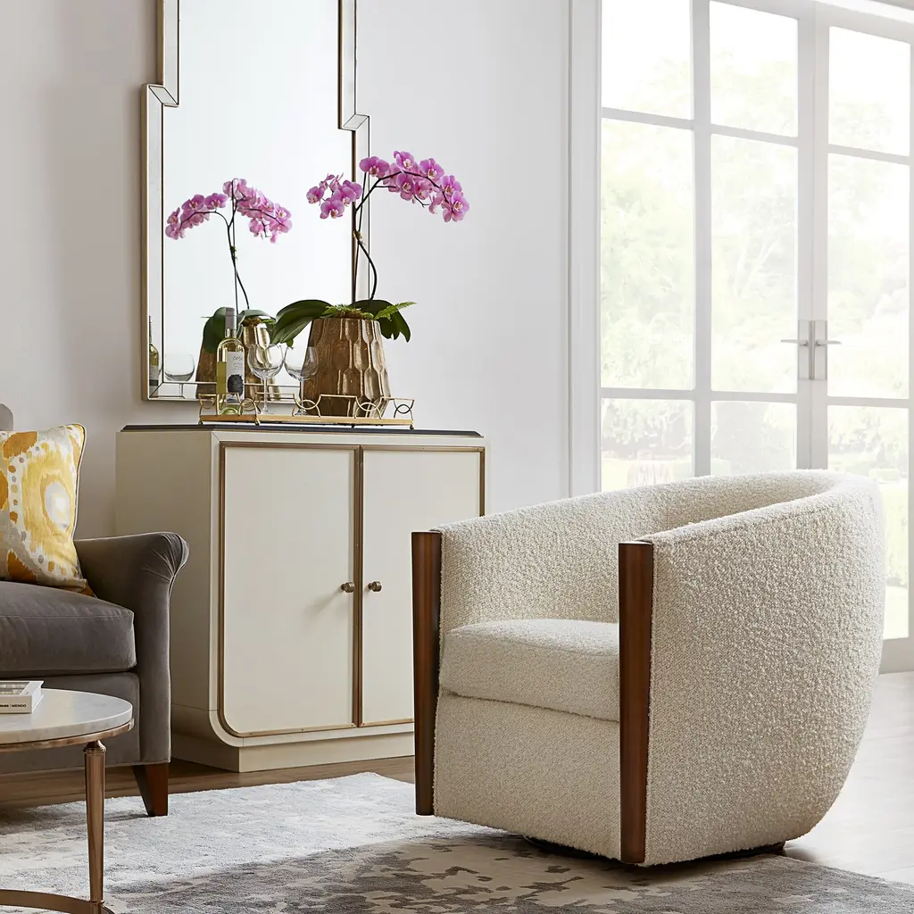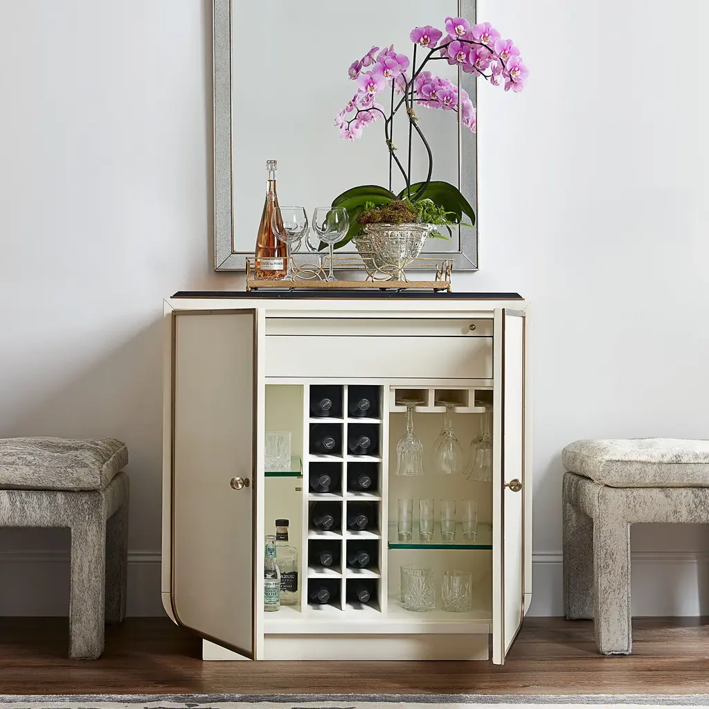 The Bowery Bar Cabinet offers an elegant spin on a contemporary shape, making it a standout piece for any home. This modern bar cabinet features a stunning ivory faux vellum finish accented by satin brass details, creating a sophisticated look that elevates your space. The functional interior is thoughtfully designed with a wine and glass rack and adjustable shelving, perfect for storing all your fine wines and spirits. Whether placed in your living room or kitchen, this bar cabinet combines style and practicality, making it an essential addition to your home. Ships In 4-5 Weeks Two doors with interior bar storage Black Nero Marquina Marble top Brass accents Beech wood and veneers with Faux Vellum finish This image is for illustrative purposes only. The colors shown are accurate within the constraints of lighting, photography, and the color accuracy of your screen.