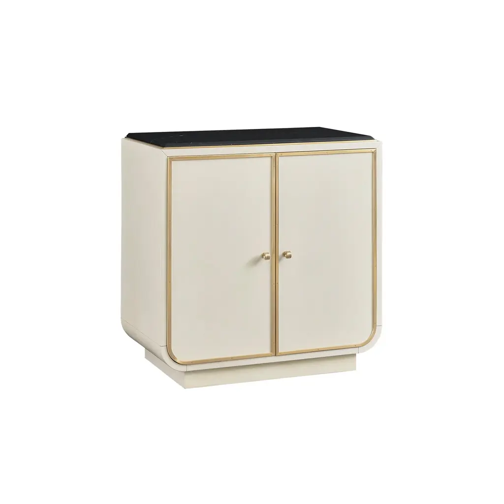 The Bowery Bar Cabinet offers an elegant spin on a contemporary shape, making it a standout piece for any home. This modern bar cabinet features a stunning ivory faux vellum finish accented by satin brass details, creating a sophisticated look that elevates your space. The functional interior is thoughtfully designed with a wine and glass rack and adjustable shelving, perfect for storing all your fine wines and spirits. Whether placed in your living room or kitchen, this bar cabinet combines style and practicality, making it an essential addition to your home. Ships In 4-5 Weeks Two doors with interior bar storage Black Nero Marquina Marble top Brass accents Beech wood and veneers with Faux Vellum finish This image is for illustrative purposes only. The colors shown are accurate within the constraints of lighting, photography, and the color accuracy of your screen.