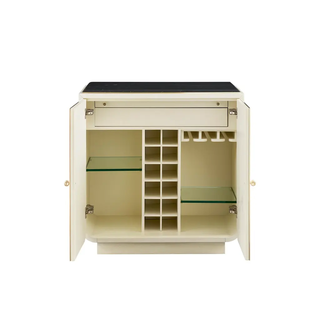 The Bowery Bar Cabinet offers an elegant spin on a contemporary shape, making it a standout piece for any home. This modern bar cabinet features a stunning ivory faux vellum finish accented by satin brass details, creating a sophisticated look that elevates your space. The functional interior is thoughtfully designed with a wine and glass rack and adjustable shelving, perfect for storing all your fine wines and spirits. Whether placed in your living room or kitchen, this bar cabinet combines style and practicality, making it an essential addition to your home. Ships In 4-5 Weeks Two doors with interior bar storage Black Nero Marquina Marble top Brass accents Beech wood and veneers with Faux Vellum finish This image is for illustrative purposes only. The colors shown are accurate within the constraints of lighting, photography, and the color accuracy of your screen.