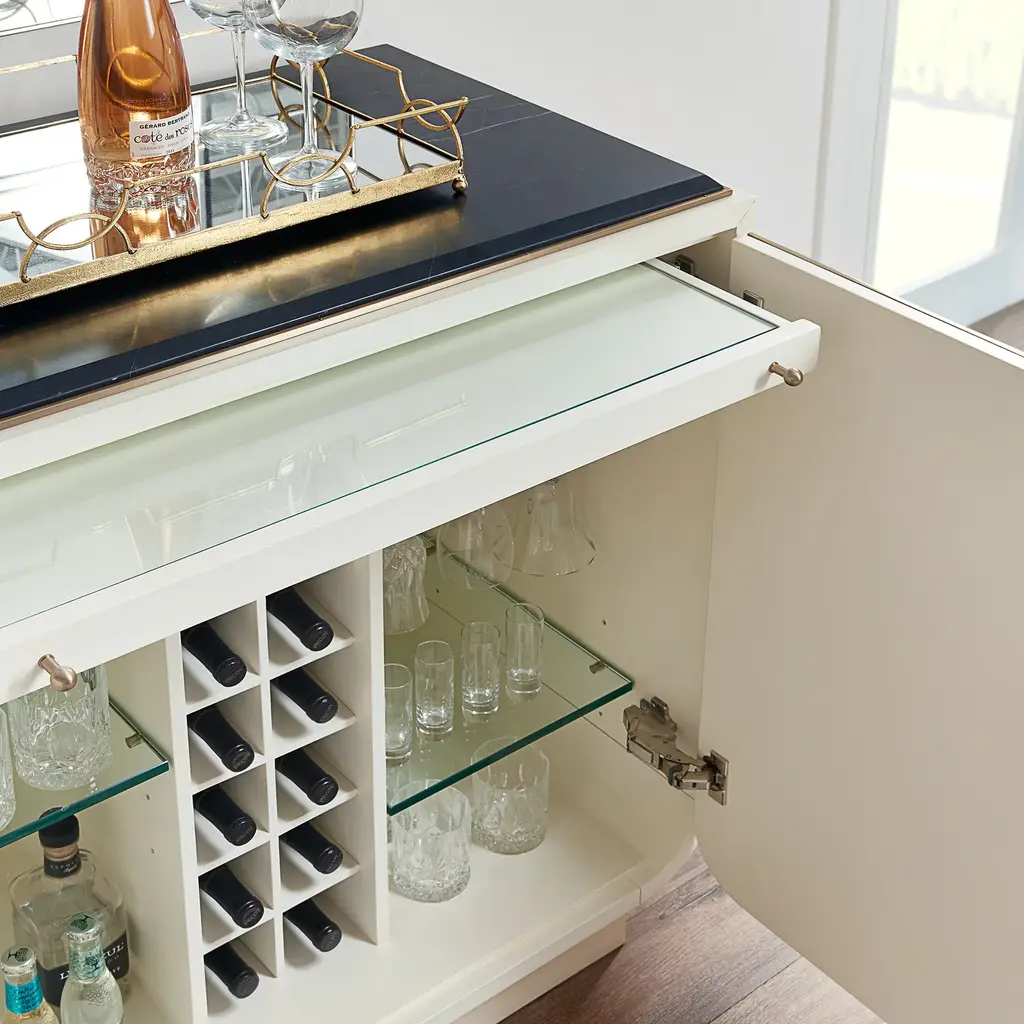 The Bowery Bar Cabinet offers an elegant spin on a contemporary shape, making it a standout piece for any home. This modern bar cabinet features a stunning ivory faux vellum finish accented by satin brass details, creating a sophisticated look that elevates your space. The functional interior is thoughtfully designed with a wine and glass rack and adjustable shelving, perfect for storing all your fine wines and spirits. Whether placed in your living room or kitchen, this bar cabinet combines style and practicality, making it an essential addition to your home. Ships In 4-5 Weeks Two doors with interior bar storage Black Nero Marquina Marble top Brass accents Beech wood and veneers with Faux Vellum finish This image is for illustrative purposes only. The colors shown are accurate within the constraints of lighting, photography, and the color accuracy of your screen.