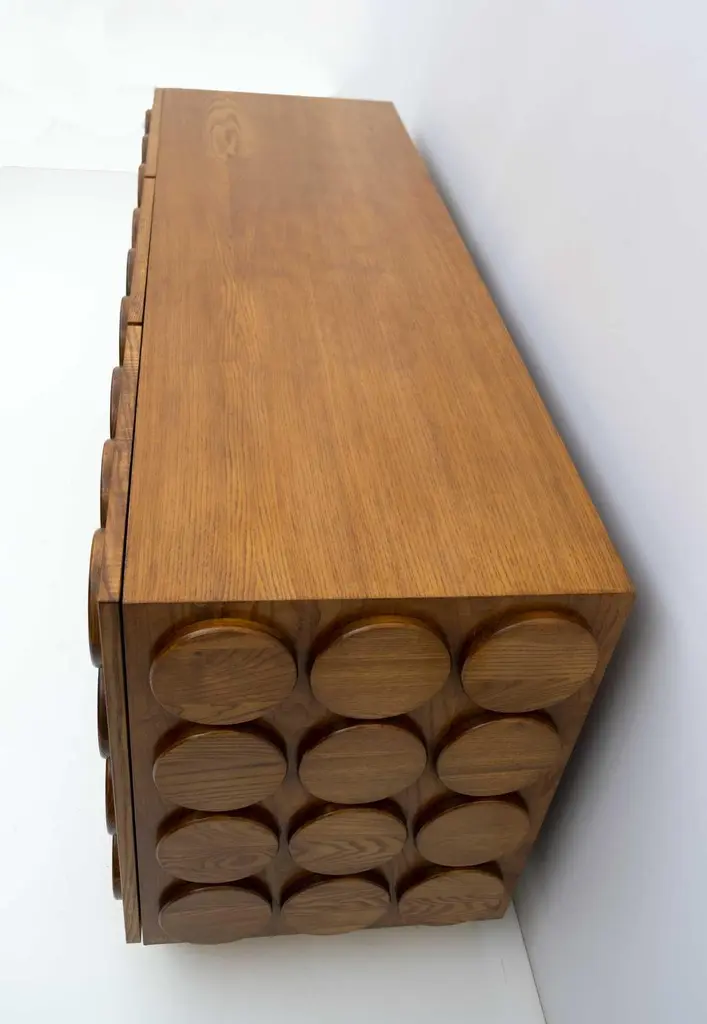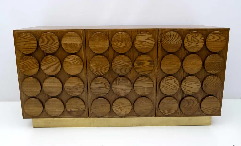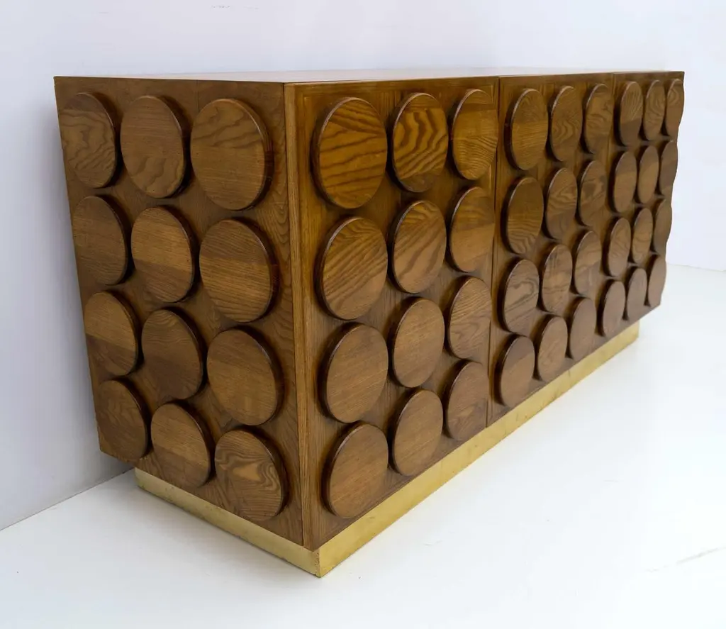 Brutalist-style three-door bar cabinet in chestnut wood. With geometric and harmonious lines, the piece of furniture is also embellished by the underlying brass band.
