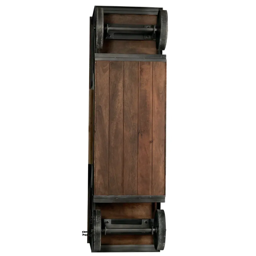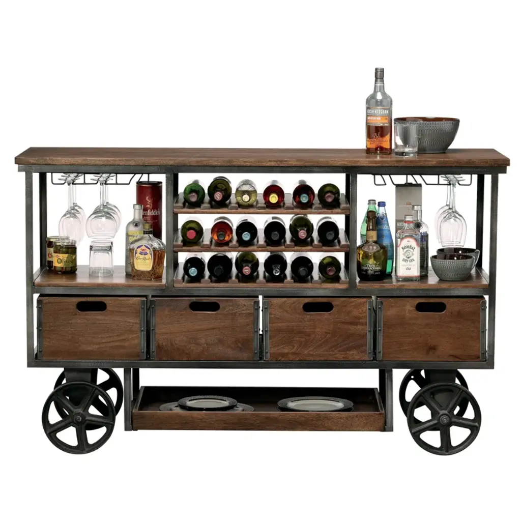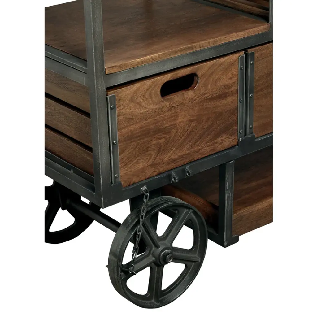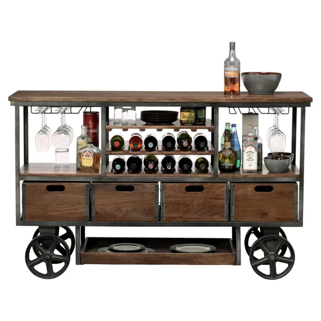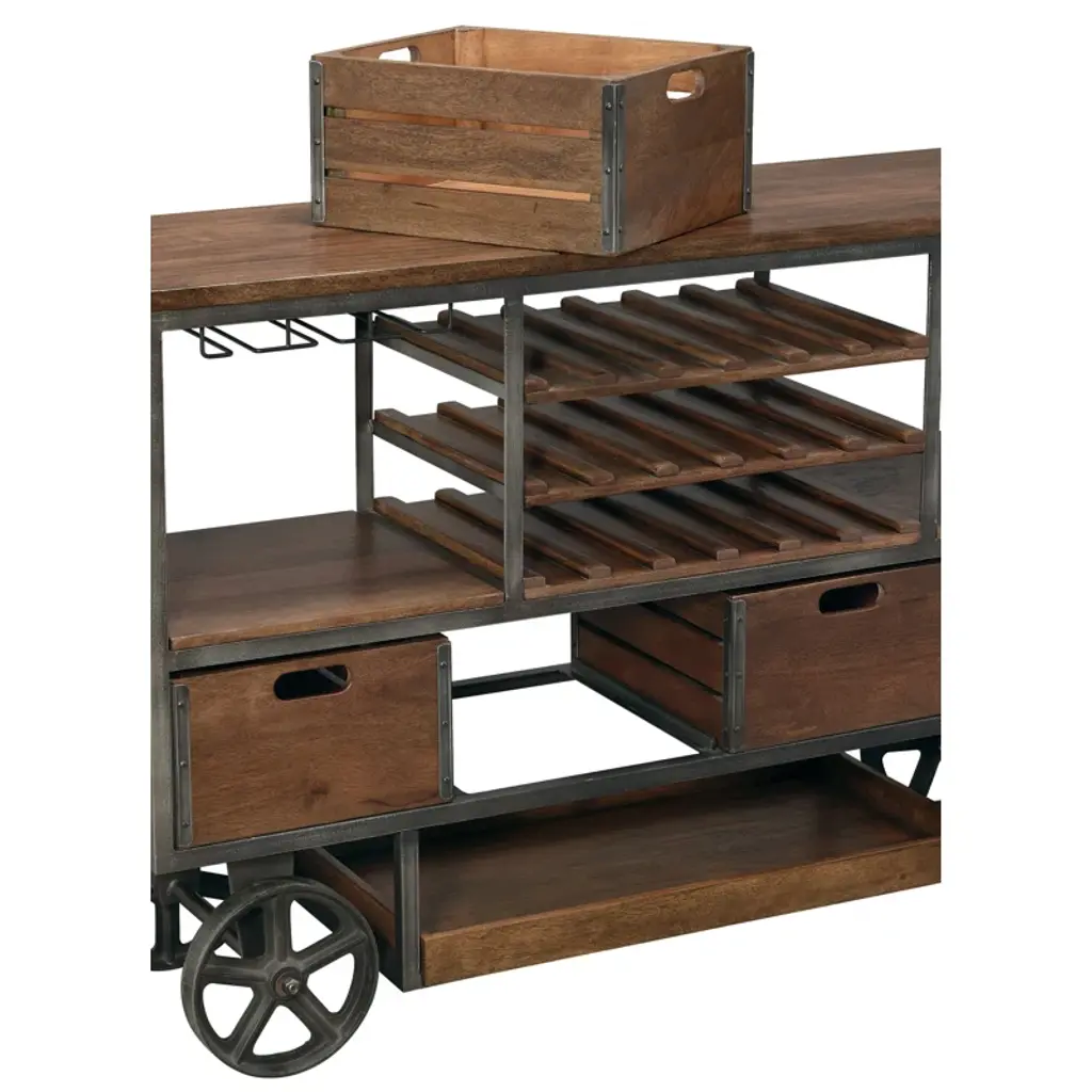 Antique wheeled bar cart features a brown wood finish on select hardwoods with metal components finished in aged iron. Large wooden working surface for entertaining and drink preparation. Includes metal stemware racks that hold up to 18 large wine glasses. Three wooden wine bottle shelves store up to 18 bottles of wine. Each shelf is reversible so that it can be used for alternate storage. Two fixed wooden shelves for liquor storage. Four pull-out wooden crates with cut-out hand-pull slatted side panels, and metal corner brackets for alternate storage. A lower pull-out wooden tray for glass and tumbler storage. Heavy cast iron wheels allow the cart to be moved. The reel wheel on the cart has a locking pin to keep the cart in its location. Some assembly is required.