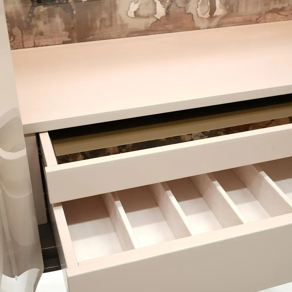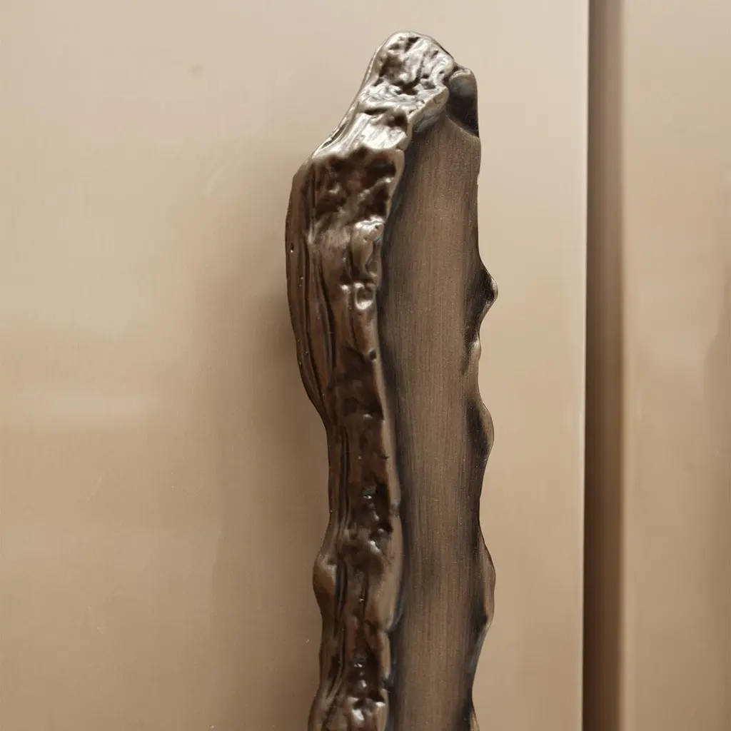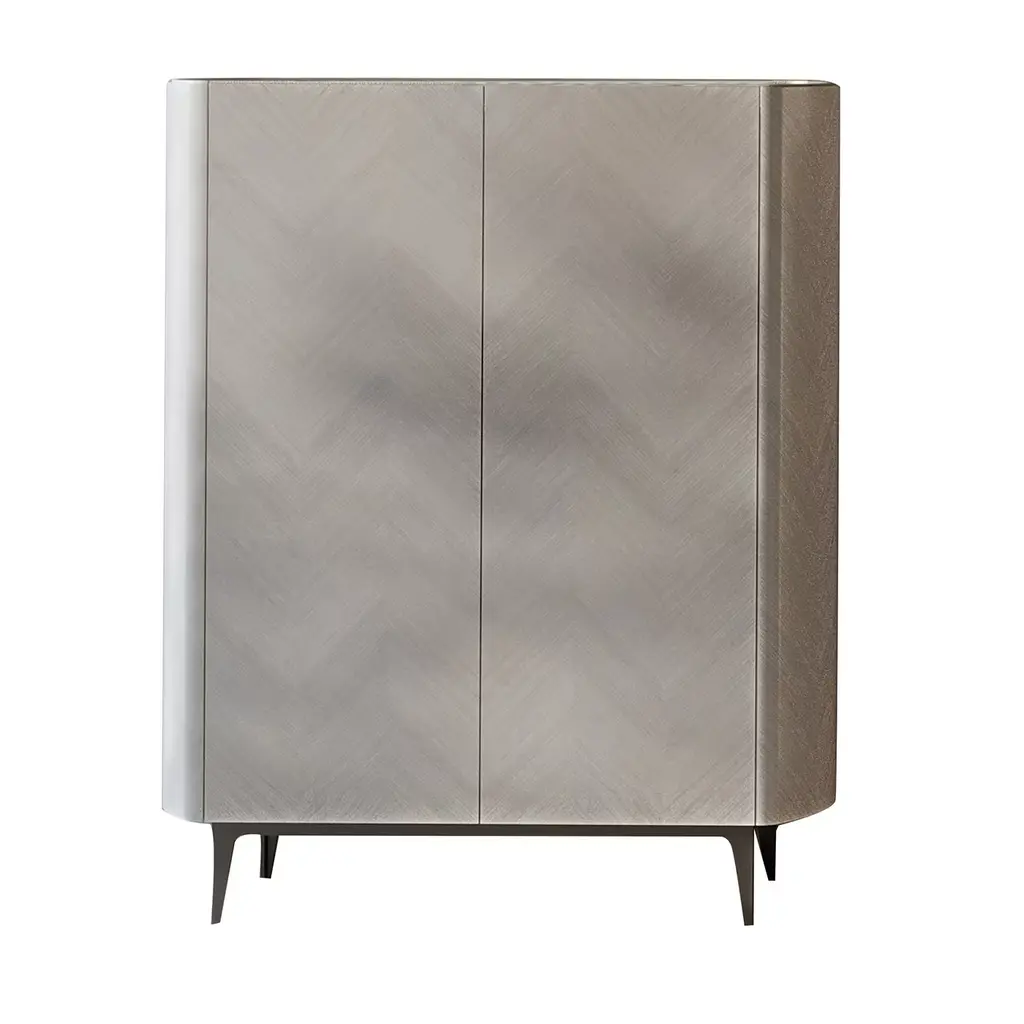 Defined by seductive curves underlining its contemporary elegance, this stylish bar cabinet stands out for the gray-stone lacquer decorating the doors with a refined shaded effect. Brushed bronzed metallic details enrich the wooden structure, while a stunning antiqued mirror as the back panel can be admired by pulling the doors. Irregular handles further stress the piece's artistic charm.