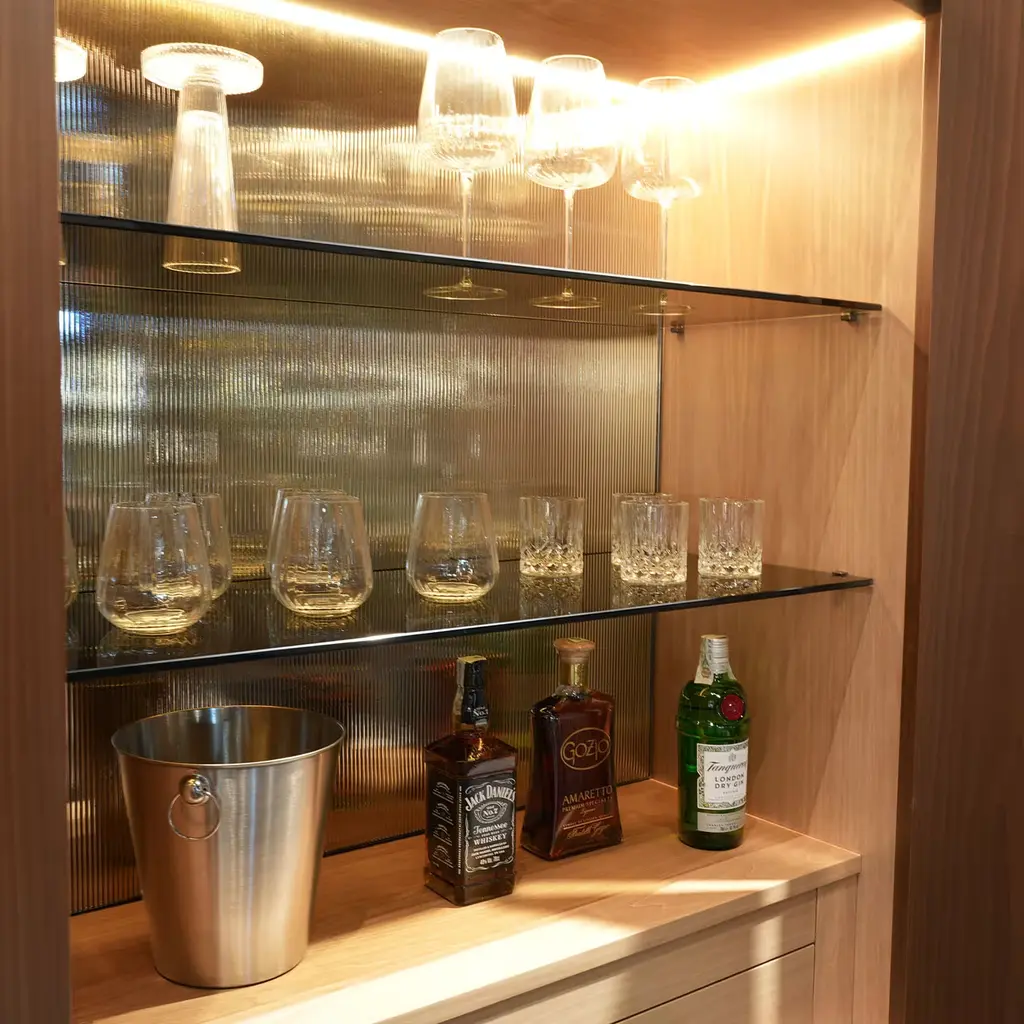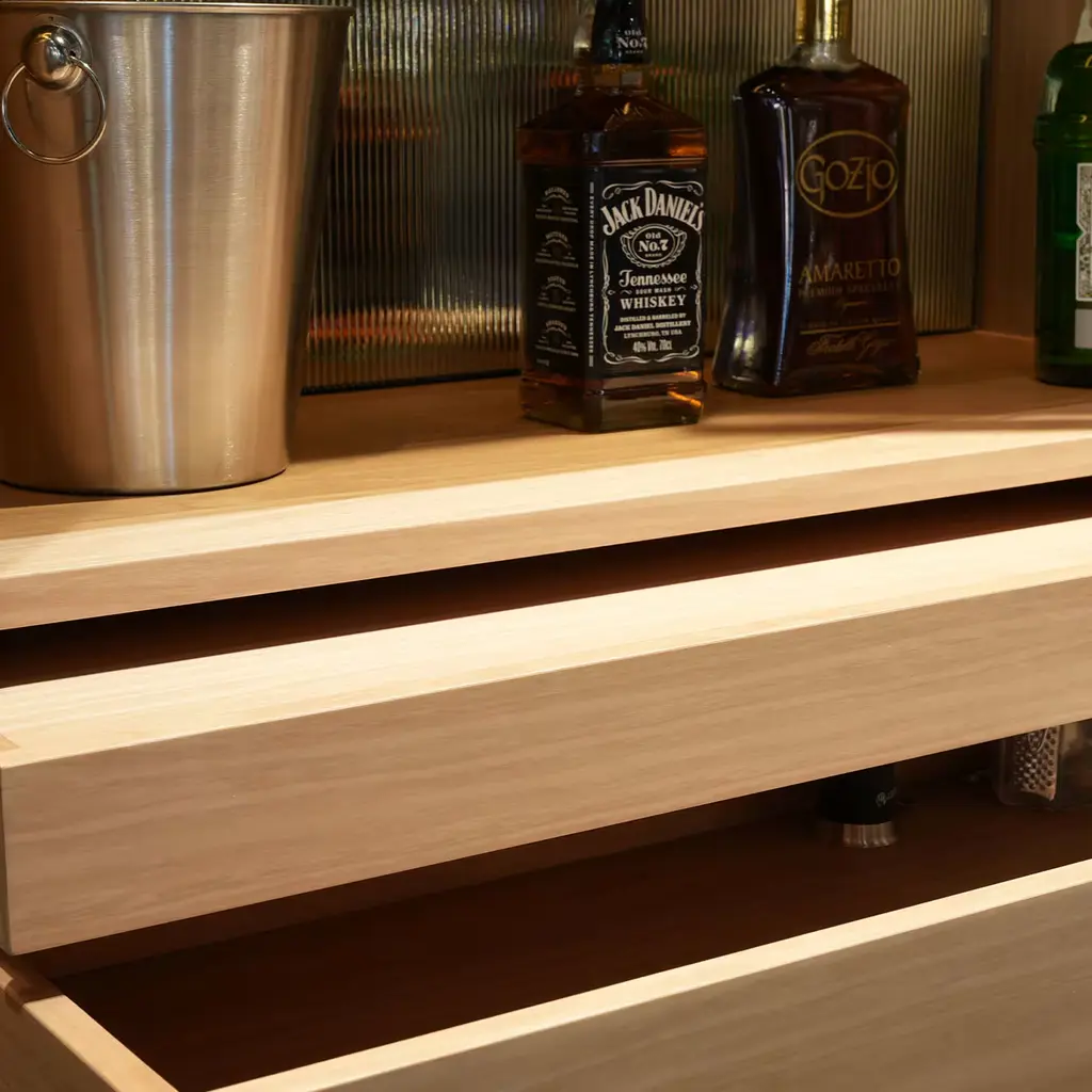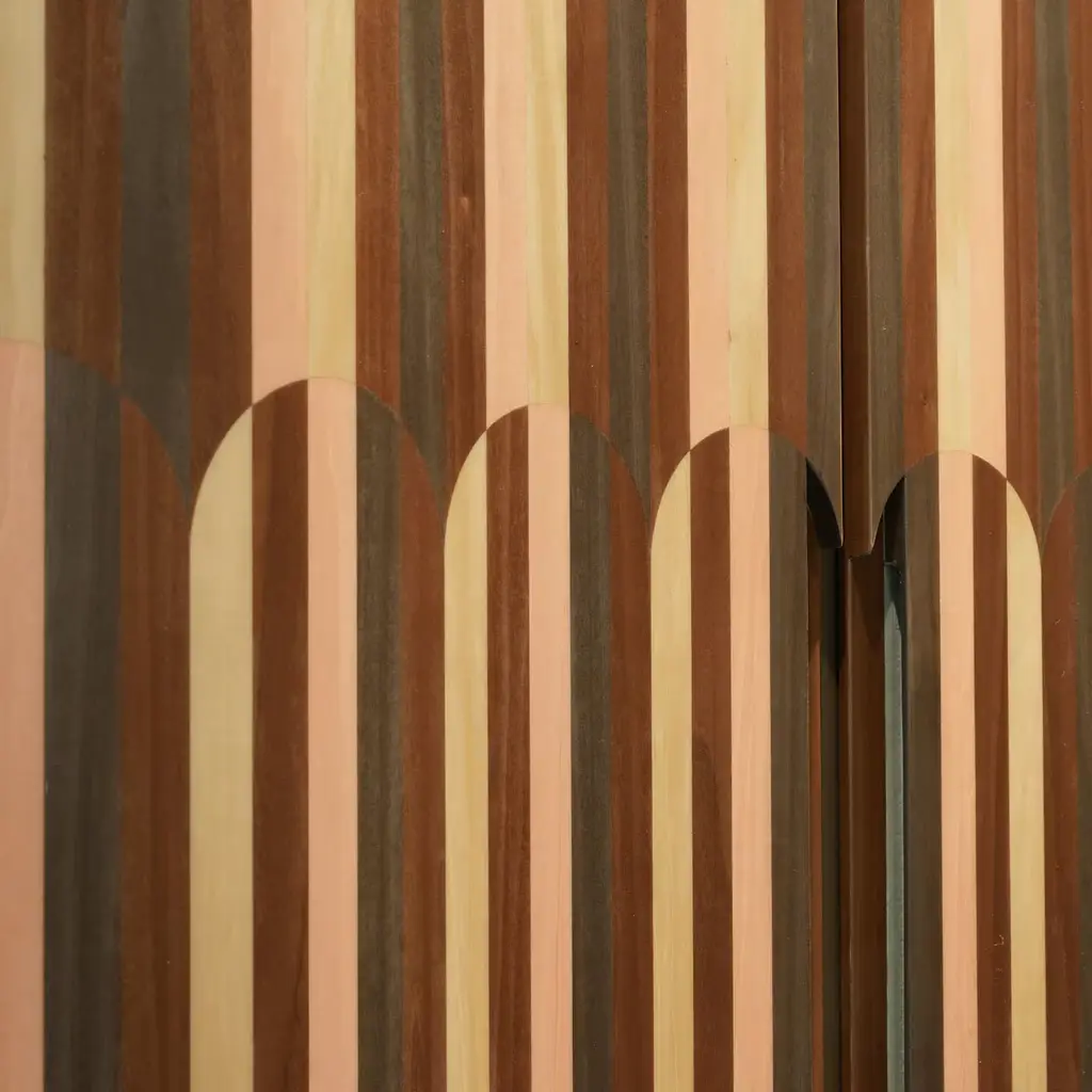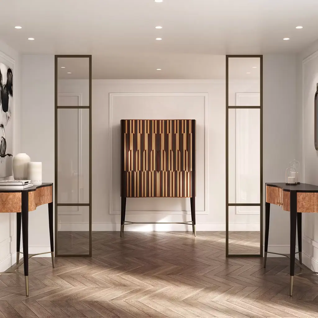 The Caleido Piume Bar Cabinet is a refined fusion of functionality and artistic design. Its two expertly crafted doors are veneered with natural wood in four different shades, creating a dynamic and elegant interplay of tones and textures. This multi-tonal composition highlights the craftsmanship and material richness of the piece. Accented with metallic elements and lacquered components, the cabinet also features a bronze mirrored back that adds depth and a subtle touch of luxury. Designed to store and display barware with style, it offers a practical yet visually striking solution for entertaining.