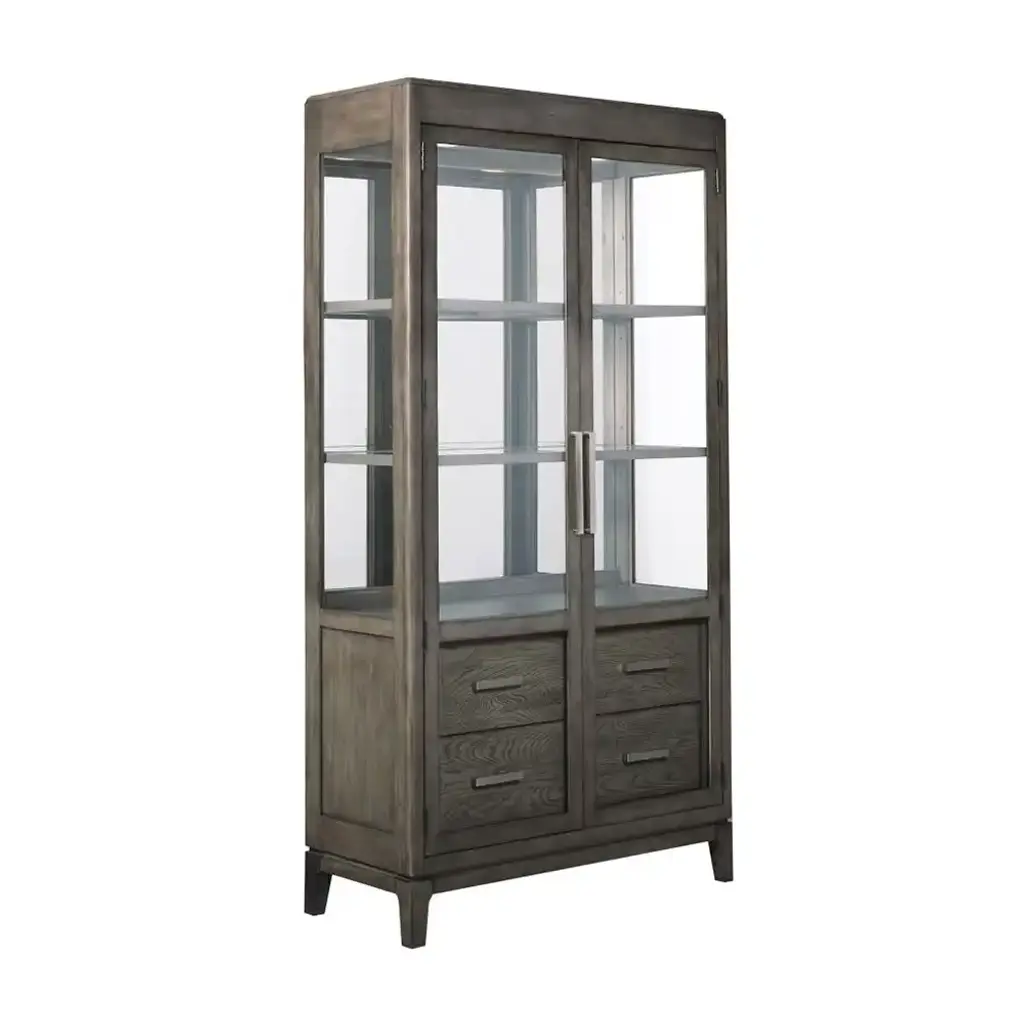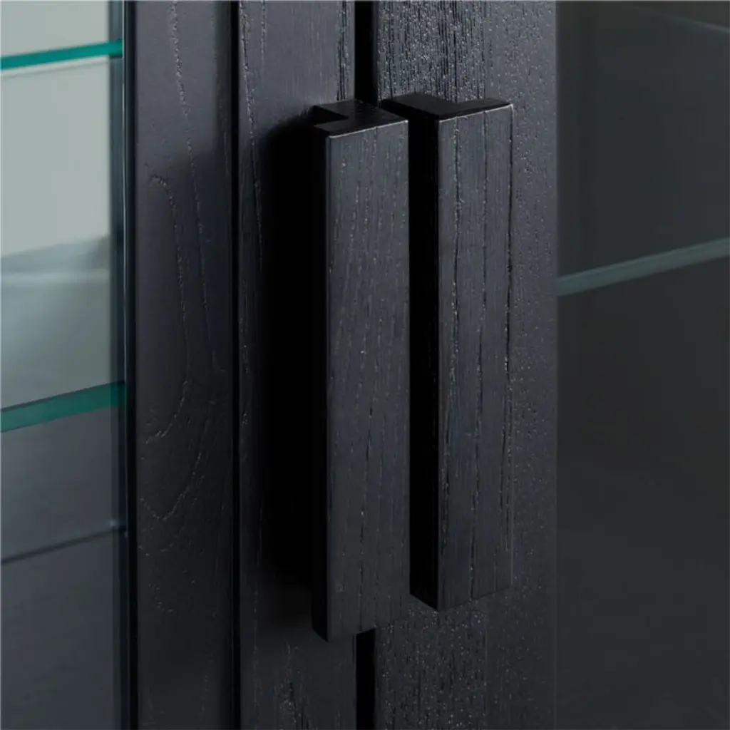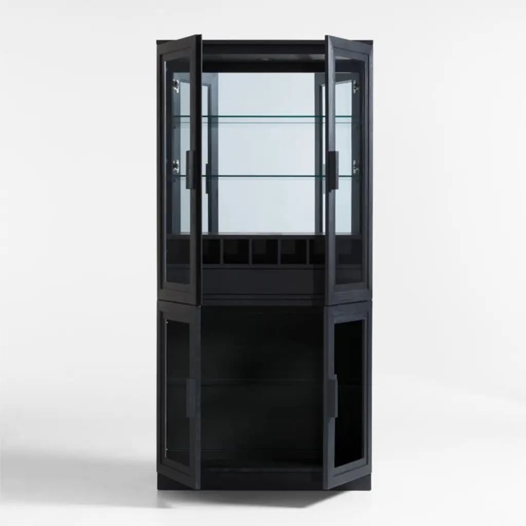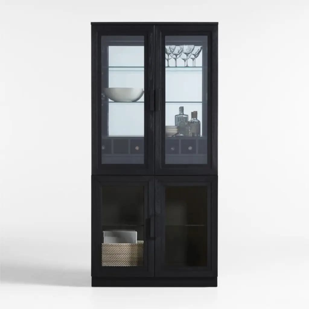 Inspired by vintage barrister cabinetry, our Calypso modular storage system lets you customize storage in style. Elm wood frames each piece in the two-piece configuration with stepped trim and a black finish to bring out the grain. On top a glass-doored bar hutch cabinet stores cocktail-hour essentials with two adjustable glass shelves, gridded wine bottle storage, a push-open drawer for bar tools and an adjustable LED light with brightness control. The glass-door cabinet base provides closed storage of extra glasses, beverages and media components. A recessed plinth base and blocky pulls add modern details to this timelessly styled black storage configuration, a Crate & Barrel exclusive.