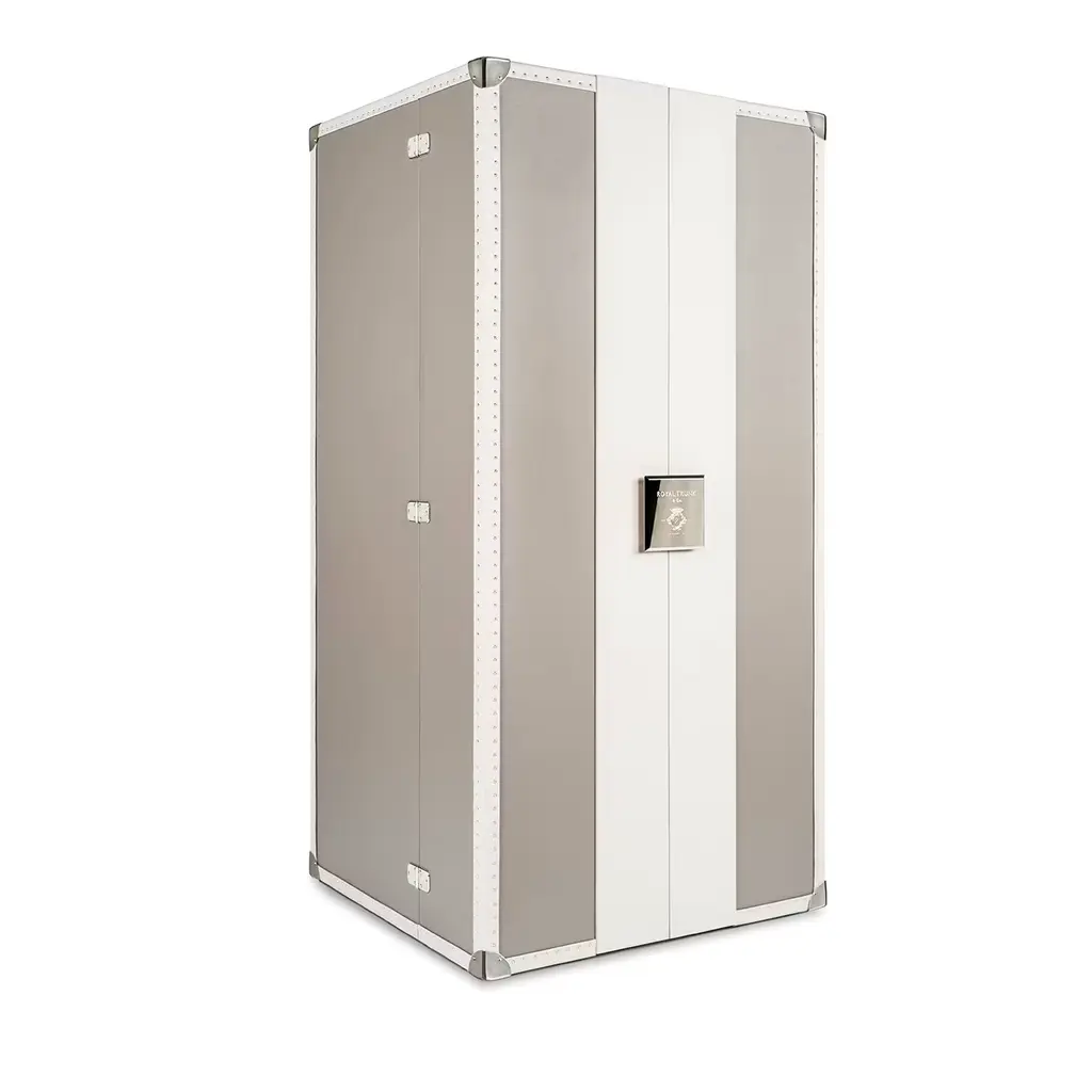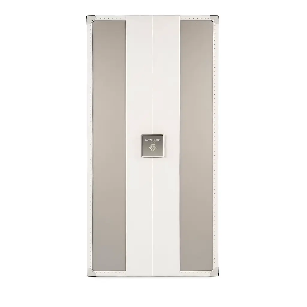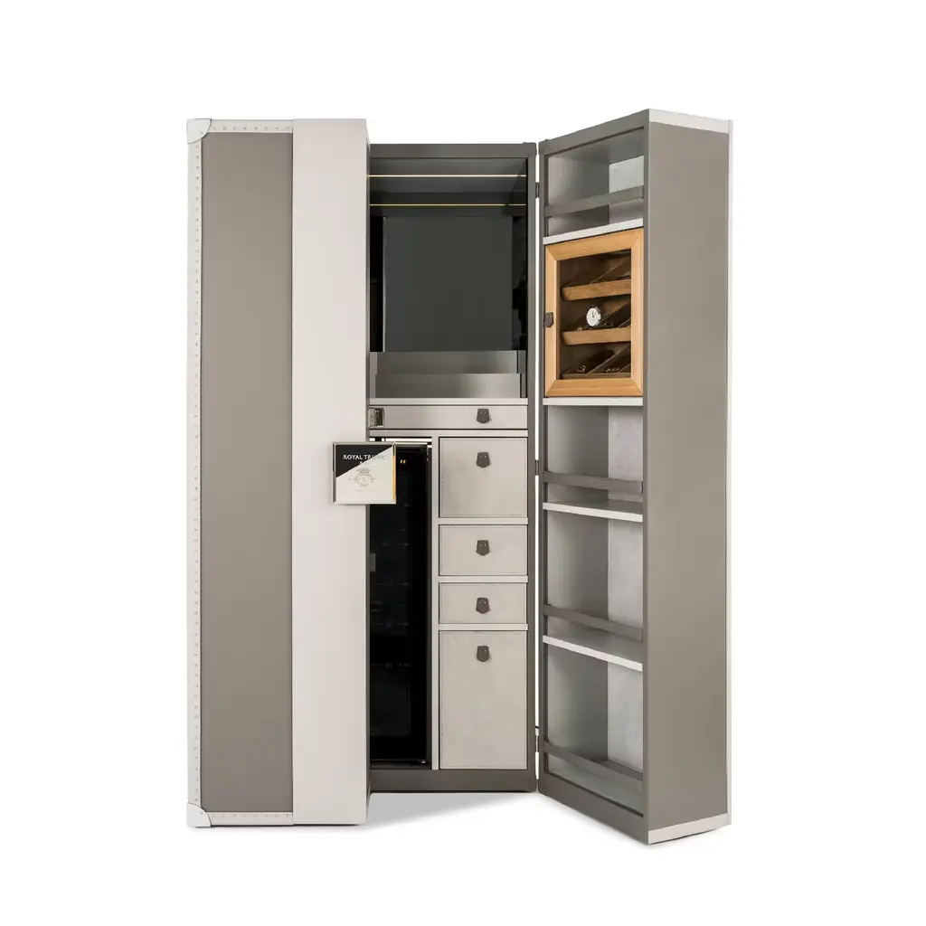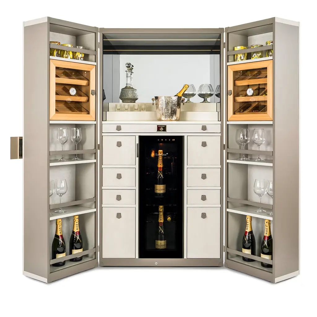 Inspired by the renowned Mediterranean island of Capri, this exclusive piece was handmade by experienced artisans to celebrate the convivial ritual of cocktail and wine in style. An elegant structure in gray leather, with two doors opening at the center, reveals a central layout enriched with mirrors and lights, designed as surface to prepare cocktails and decant wine. The lower part features drawers with a soft-closing closure on the sides and a central canteen to keep the bottles refrigerated. The doors are deep set to host dedicated shelves with leather straps to hold glasses and bottles. This luxurious piece will bring glamour and sophistication in any home. Details are customizable in rare marbles and precious woods.