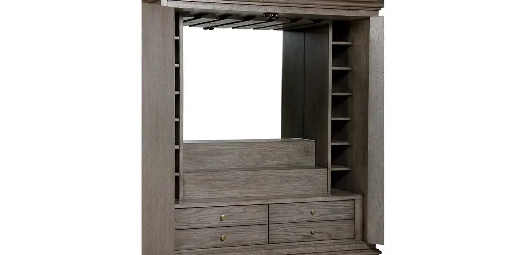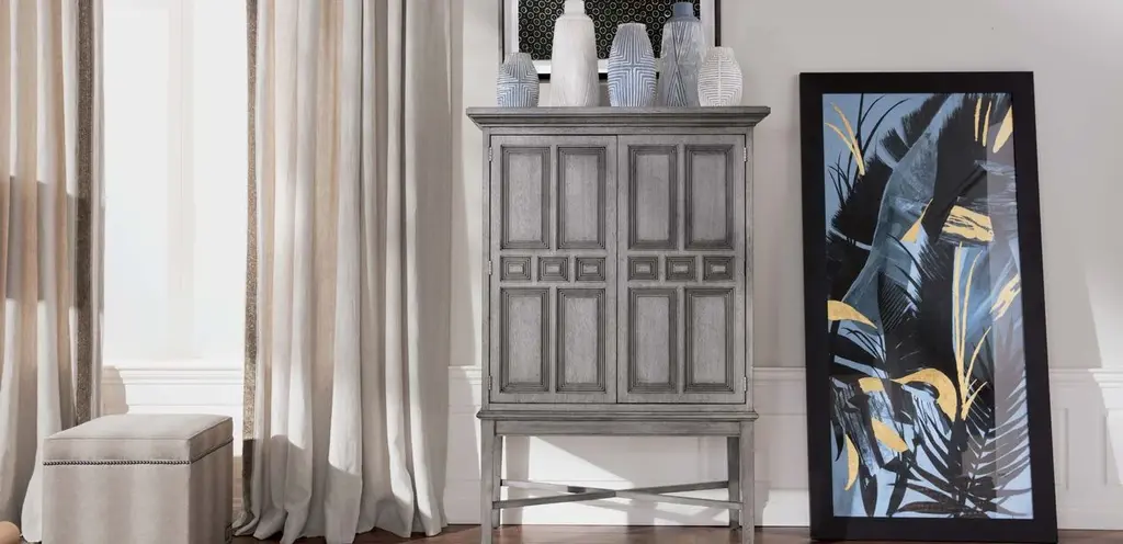 Our Carys cabinet adds an instant global vibe to any dining area, sitting room, or entertaining area, with plenty of space to store wines, spirits, stemware, glasses, shakers, and anything else you'll need to enjoy a beverage or two. When closed, it's the picture of stately elegance: classic and composed. When open, it has a casual pub feel (with a mirrored back and two drawers for napkins, bottle openers, and more), and it's always ready for a party.