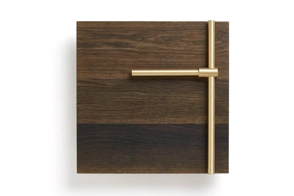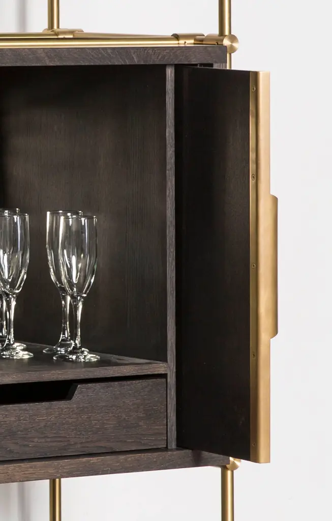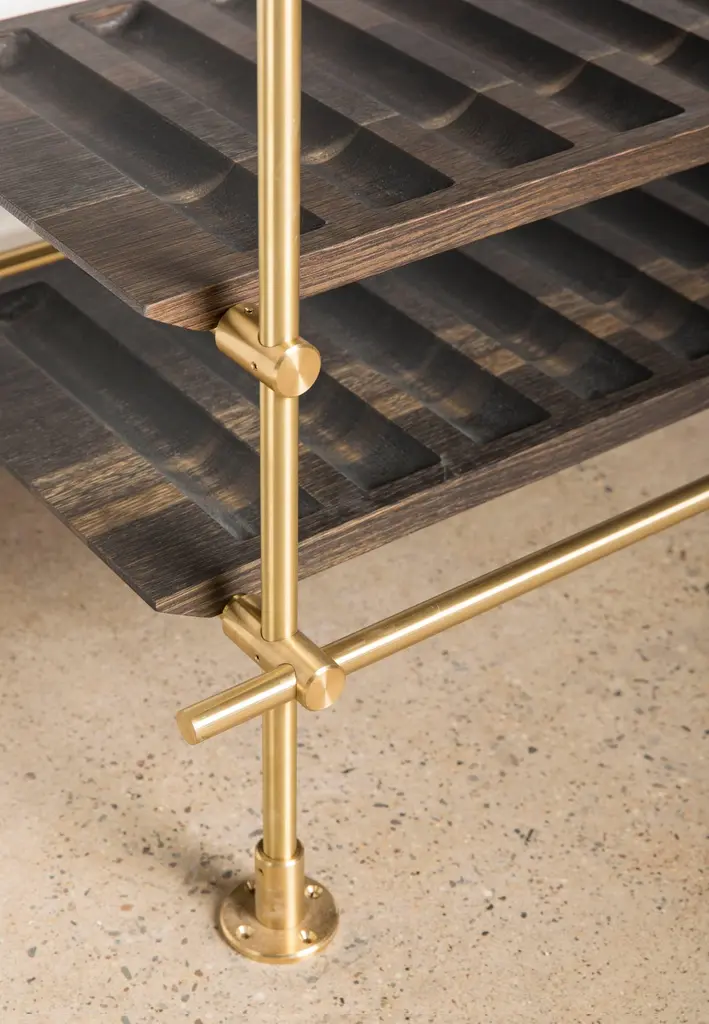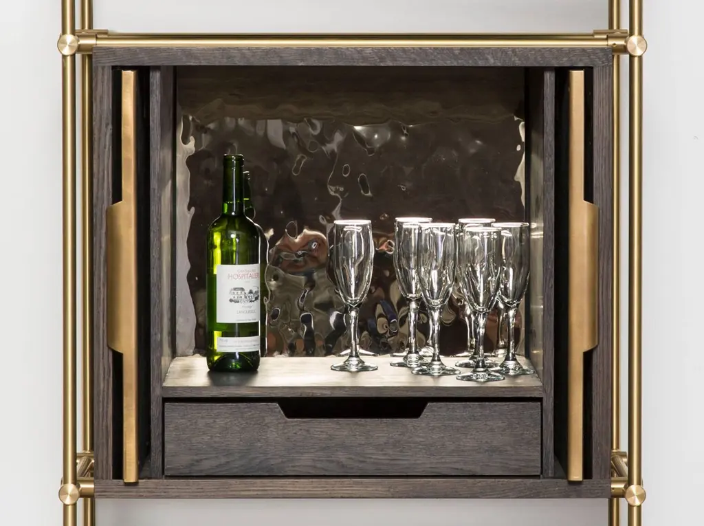 Amuneal's Collector’s Wine Unit with Bar Cabinet highlights our carved oak wine shelves as a perfect way to store and display your favorite bottles. Our precision machined brass fittings make each shelf easily adjustable and removable adding to the curated feel of the unit. The focal cabinet is constructed from solid white oak with hand-textured and polished brass doors that open and retract into the cabinet. The interior of the cabinet reveals a backer panel with the same polished and textured brass as the doors and also a leather lined drawer unit to store all of your favorite wine and bar tools. All of the wood on the units is oxidized to activate the natural tannins in the white oak to turn a rich darkened finish that highlights the character and refined beauty of the raw material. All brass fittings, pulls and tubes are hand-patinated in a warm brass finish. This unit is produced in our Philadelphia-based furniture studio and can be customized for your space.