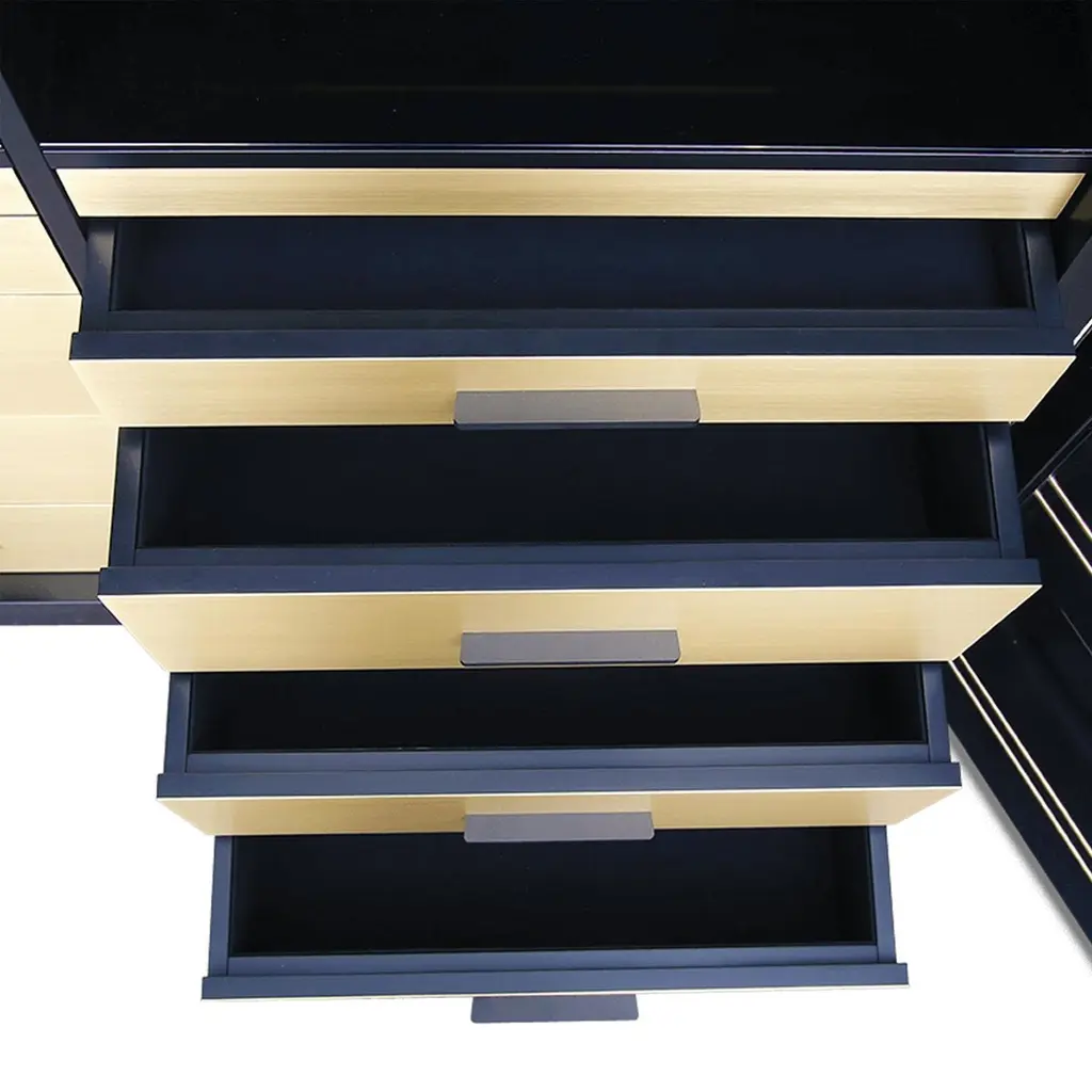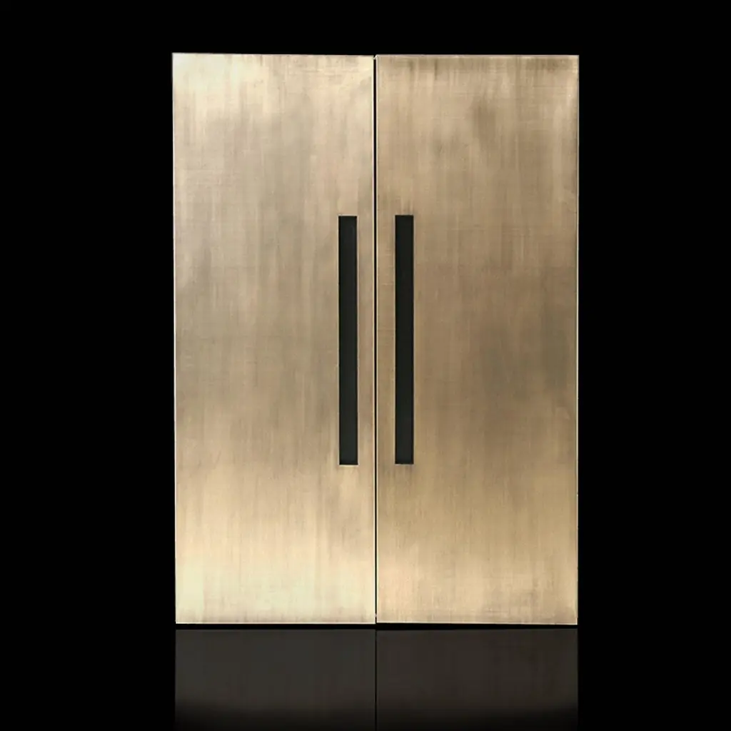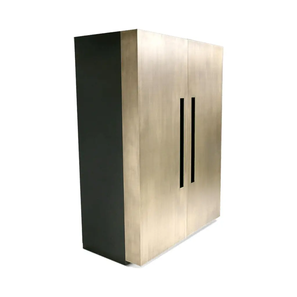 Crafted with utmost attention to detail, this bar cabinet is a unique piece of functional decor. A magnificent addition to a modern home, where it will be eye-catching and functional at the same time.This two-door drink cabinet beautifully crafted by the finest Kanttari artisans, rests on a wooden structure in crosswise brushed brass finish. Ideal for storing bottles and glassware, the cabinet features a well-organized space with 4 glass shelves and mirrored backing, 2 soft velvet drawers, interior lighting, glass holders and a fridge for wine cooling. Any interior customization possible. Pictures shown from 2 separate cabinets to distinguish the differences of possible customization. CUSTOMIZATION AVAILABLE - Different colors, materials, finishes and customized sizes available upon request. If you’re interested in a customization that is not currently listed, please contact Kanttari.BESPOKE – We do create individual and fully customized designs. Please contact Kanttari to discuss your specifications.MANUFACTURING – we fully hand-craft each piece in our workshop by our best craftsmen. Production lead time may take up to 9 - 12 weeks, bespoke items may be longer – depending on the exact specification and availability of materials chosen. For more information please contact Kanttari.SHIPPINGCarefully packaged in wooden crate.Fully insured.Request a customized shipping quote.