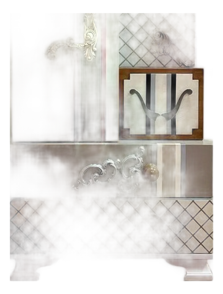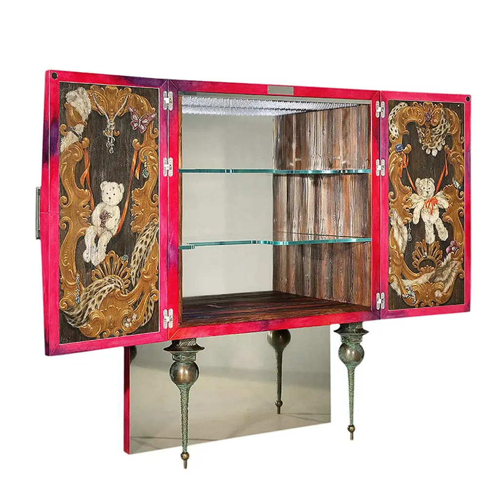 The Costantino Bar Cabinet is crafted from wood, supported by opulent cast bronze legs. Upholstered in leather with a red and purple patina treatment, this piece opens to reveal an antique larch wood finish. Hand-painted with an inner trompe l'oeil design, the doors open to reveal a mirror, LED lights and crystal shelves.