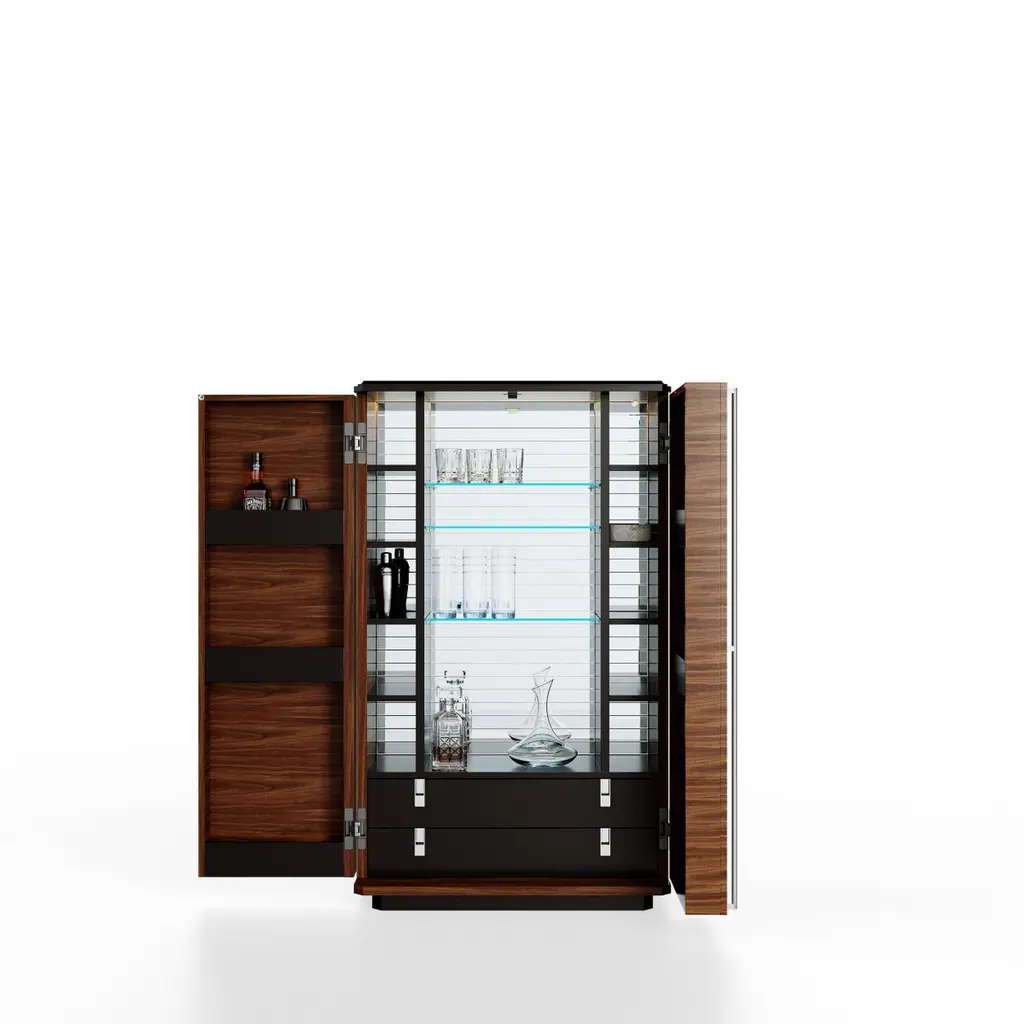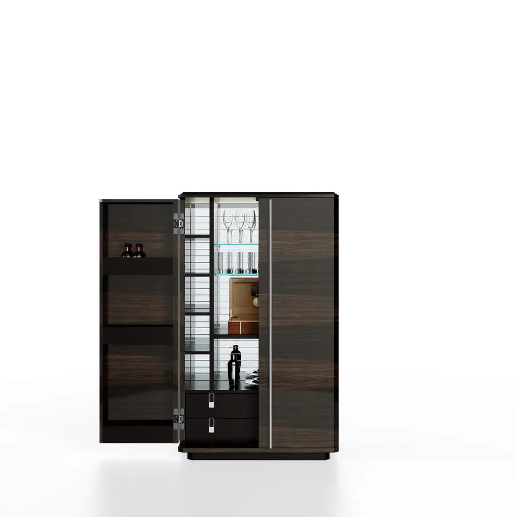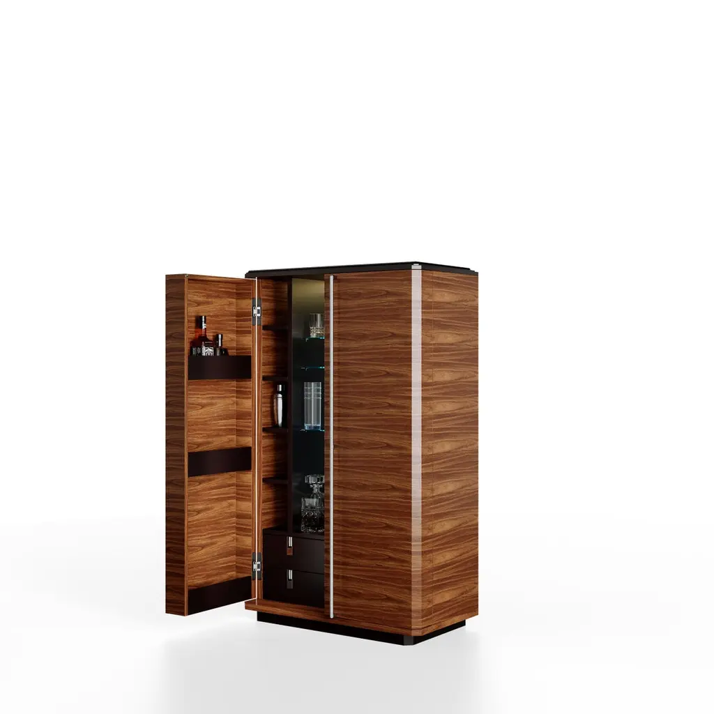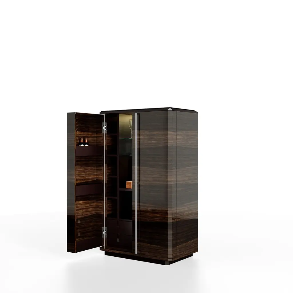 Teomondo Cabinet with Doors in Smoked Eucalyptus and Walnut by UltramobiliDimensions: W 90 x D 55 x H 150 cmMaterials: Wooden structure Bar Cabinet with doors in Smoked Eucalyptus / Eucalipto Affumicato veneer in gloss finish.Wooden structure Bar Cabinet with doors in Smoked Eucalyptus / Eucalipto Affumicato veneer in gloss finish. Back mirror with engraved horizontal lines, LED profile with sensor for turning the light on and off through the doors movement; glass shelves, 2 drawers with leather-covered bottom, pockets for bottles on the doors.Ultramobili:Tactile materials and exclusive finishes, advanced functionality and uncompromising quality define the character and soul of each creation, the best business card with which ULTRAMOBILI furnishings present themselves to the world. ULTRAMOBILI collaborates with a group of highly selected craftsmen, closely connected to their home territory, Pesaro. It is from their manufacturing skills that all the brand's furnishings take shape, in a continuous exchange of skills that focuses on design ability and the intelligence of the hands. ULTRAMOBILI employs an international team of designers who every day imagine, design and create - with talent and passion, dedication and visionary spirit - all the brand's furniture: architectural sculptures that become iconic objects and furnishings for living. ULTRAMOBILI's credo is quality without compromise. An uncompromising vision that expresses itself every day in the choice of excellent materials and finishes, in the obsessive care for every single detail, in the constant search for advanced functionality and in the incessant striving for cutting-edge, unique and unmistakable design. ULTRAMOBILI also produces tailor-made projects, ad hoc creations capable of meeting the most intimate and profound needs of those who enter the brand's universe. Bespoke furnishings that are born in close connection with the architectural envelope that houses them, and that dialogue with the surrounding environment in the volumetric relationships of their components, in the materiality and colour nuances of the materials, in the chiaroscuro effects of the volumes and in the visual communicativeness that distinguishes them.