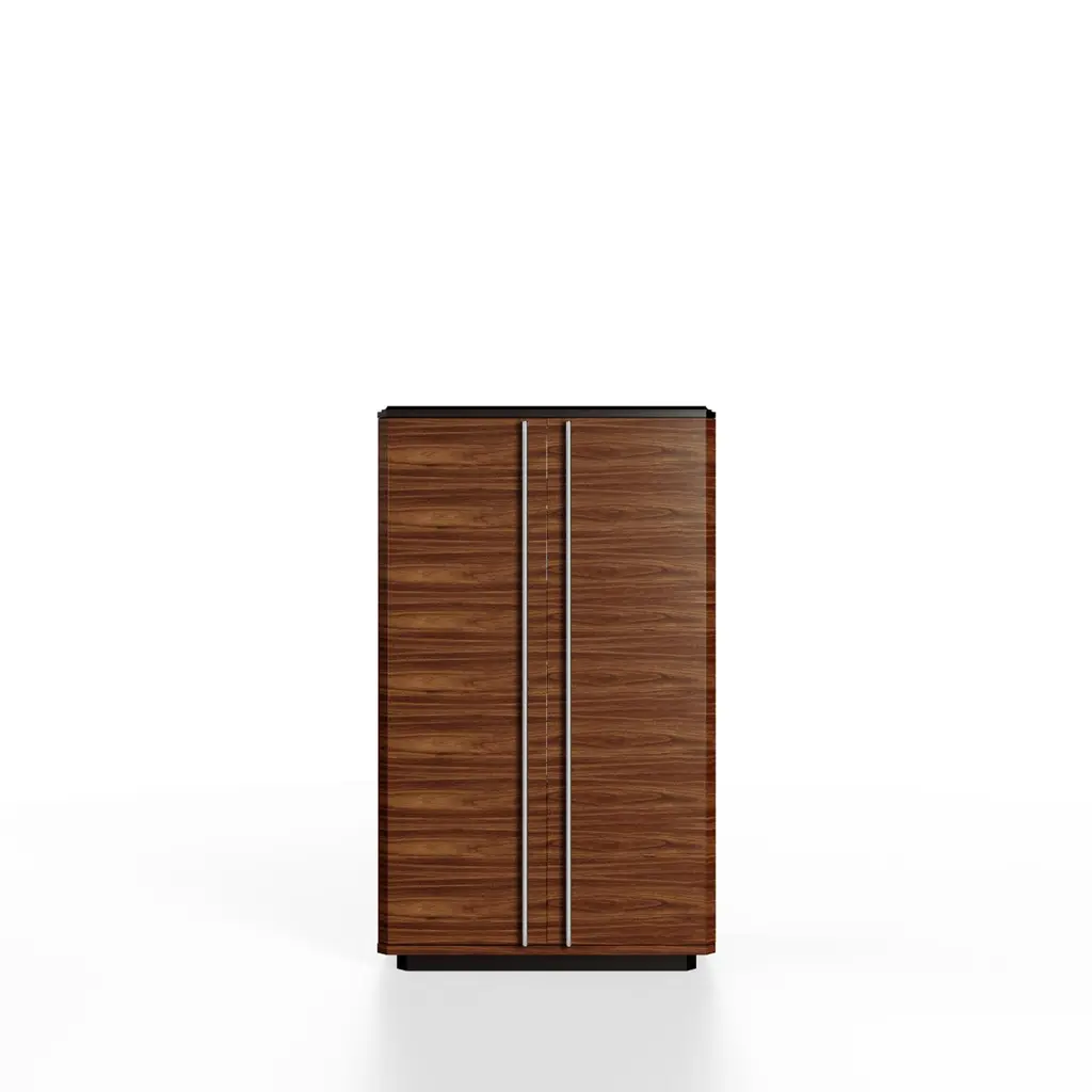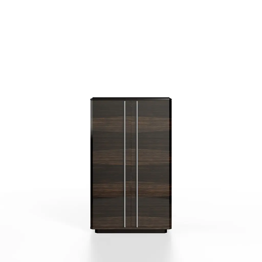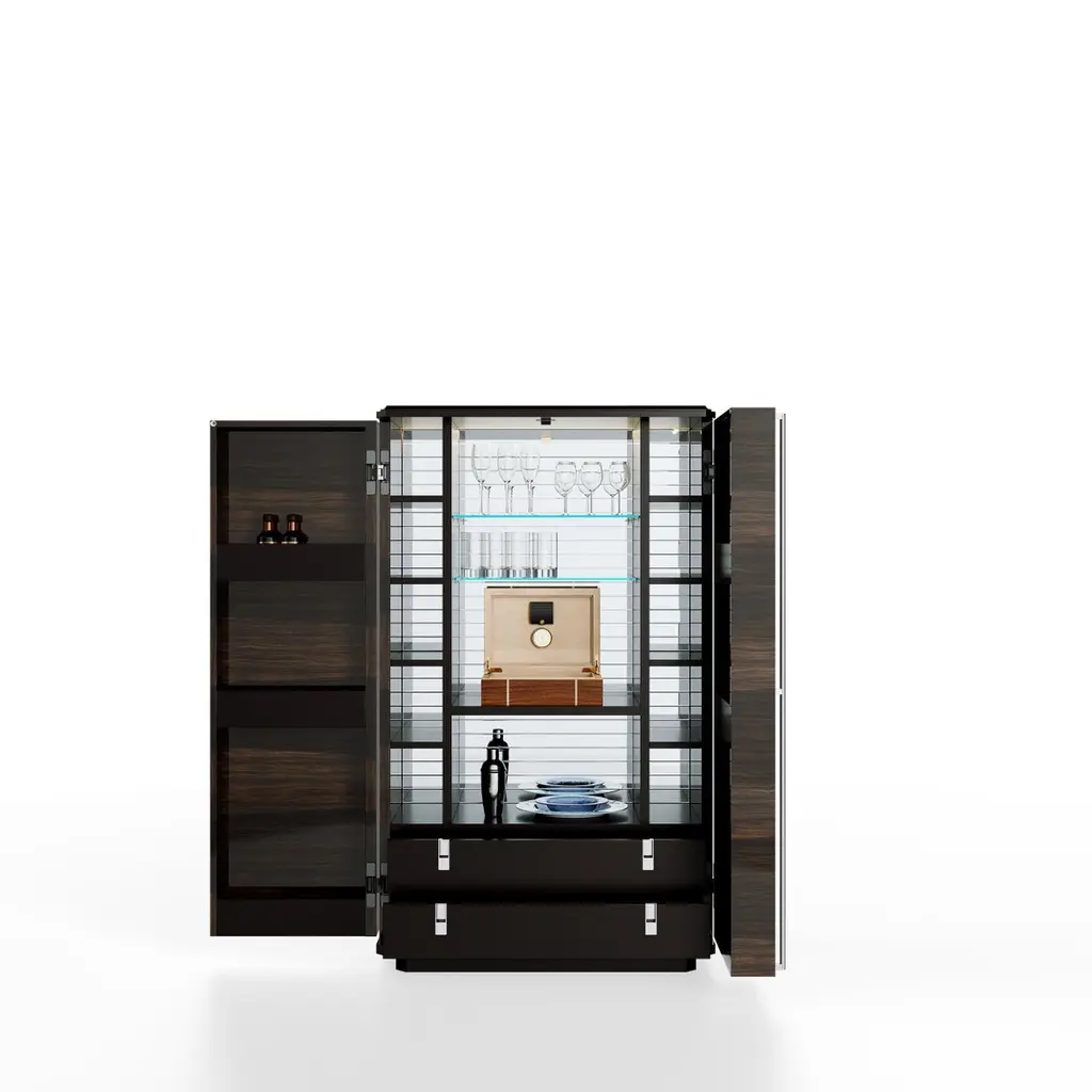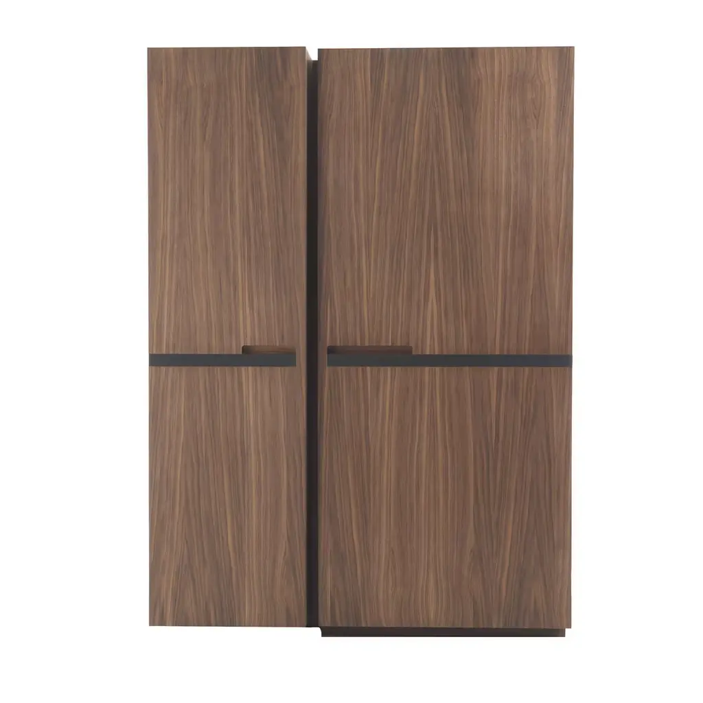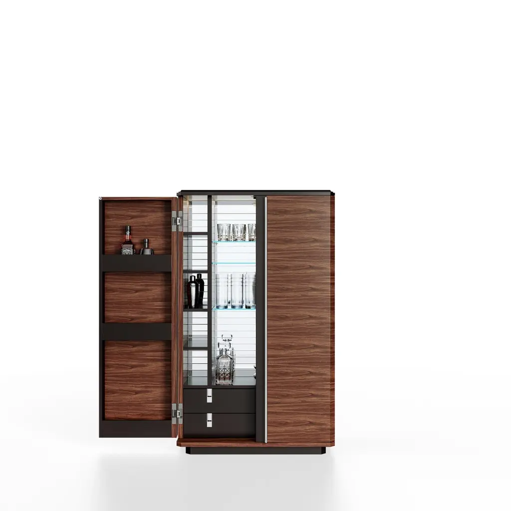 Teomondo Cabinet with Doors in Smoked Eucalyptus and Walnut by UltramobiliDimensions: W 90 x D 55 x H 150 cmMaterials: Wooden structure Bar Cabinet with doors in Smoked Eucalyptus / Eucalipto Affumicato veneer in gloss finish.Wooden structure Bar Cabinet with doors in Smoked Eucalyptus / Eucalipto Affumicato veneer in gloss finish. Back mirror with engraved horizontal lines, LED profile with sensor for turning the light on and off through the doors movement; glass shelves, 2 drawers with leather-covered bottom, pockets for bottles on the doors.Ultramobili:Tactile materials and exclusive finishes, advanced functionality and uncompromising quality define the character and soul of each creation, the best business card with which ULTRAMOBILI furnishings present themselves to the world. ULTRAMOBILI collaborates with a group of highly selected craftsmen, closely connected to their home territory, Pesaro. It is from their manufacturing skills that all the brand's furnishings take shape, in a continuous exchange of skills that focuses on design ability and the intelligence of the hands. ULTRAMOBILI employs an international team of designers who every day imagine, design and create - with talent and passion, dedication and visionary spirit - all the brand's furniture: architectural sculptures that become iconic objects and furnishings for living. ULTRAMOBILI's credo is quality without compromise. An uncompromising vision that expresses itself every day in the choice of excellent materials and finishes, in the obsessive care for every single detail, in the constant search for advanced functionality and in the incessant striving for cutting-edge, unique and unmistakable design. ULTRAMOBILI also produces tailor-made projects, ad hoc creations capable of meeting the most intimate and profound needs of those who enter the brand's universe. Bespoke furnishings that are born in close connection with the architectural envelope that houses them, and that dialogue with the surrounding environment in the volumetric relationships of their components, in the materiality and colour nuances of the materials, in the chiaroscuro effects of the volumes and in the visual communicativeness that distinguishes them.