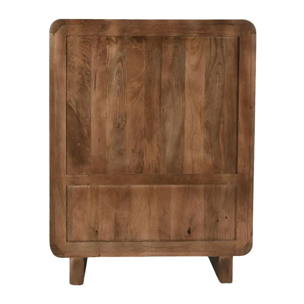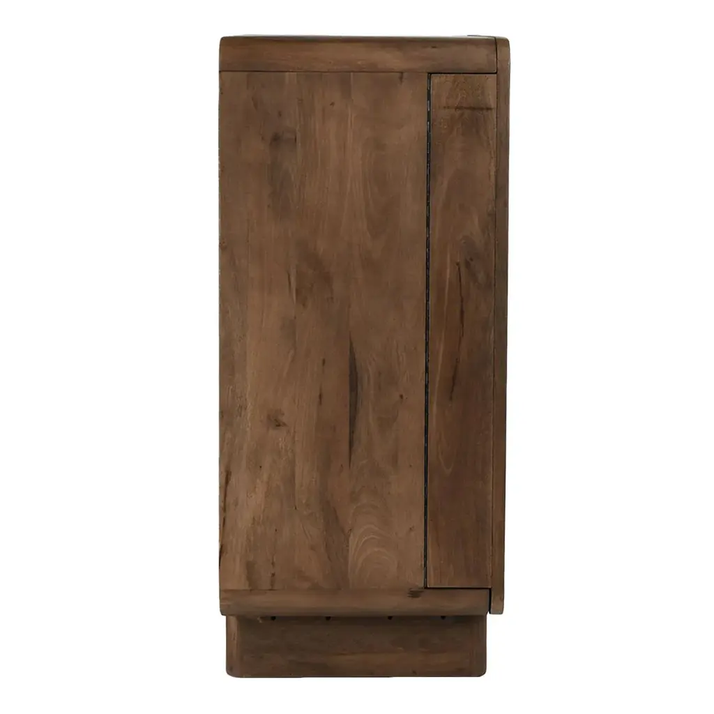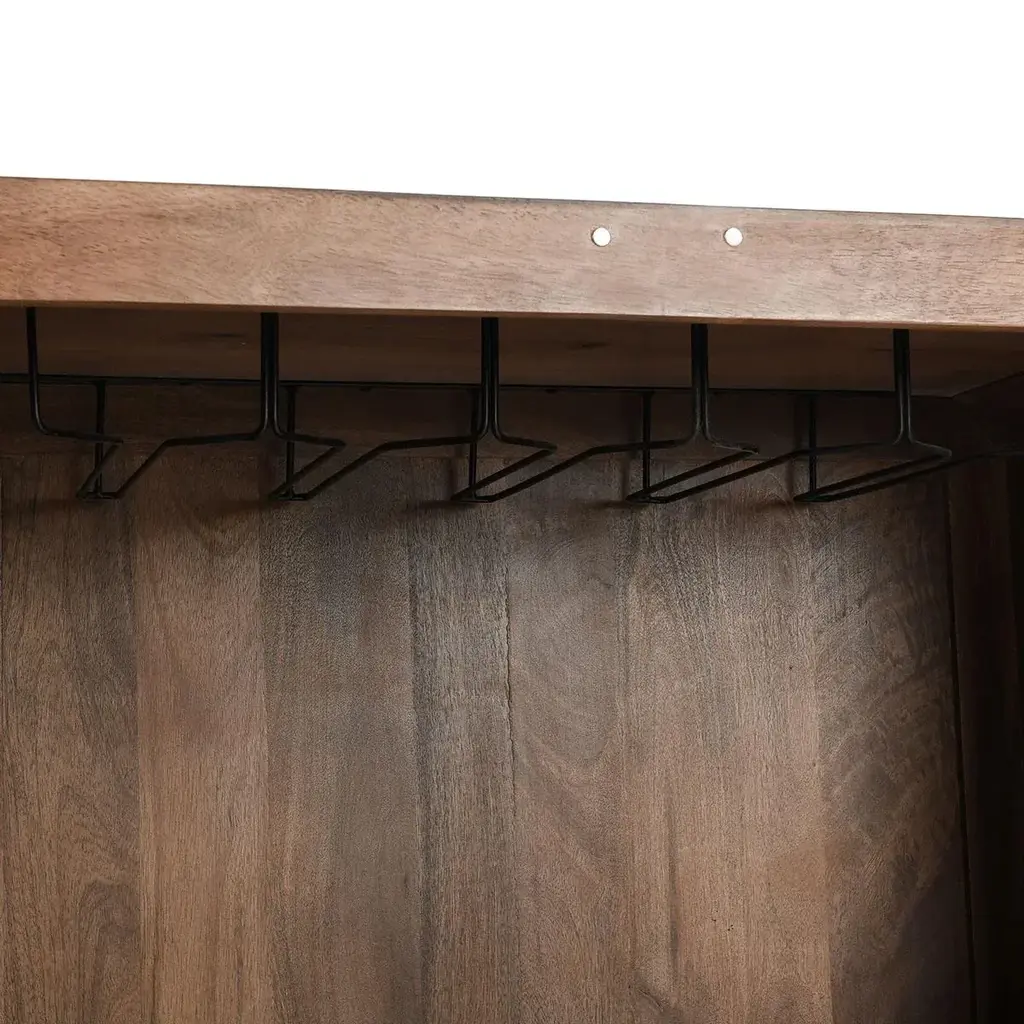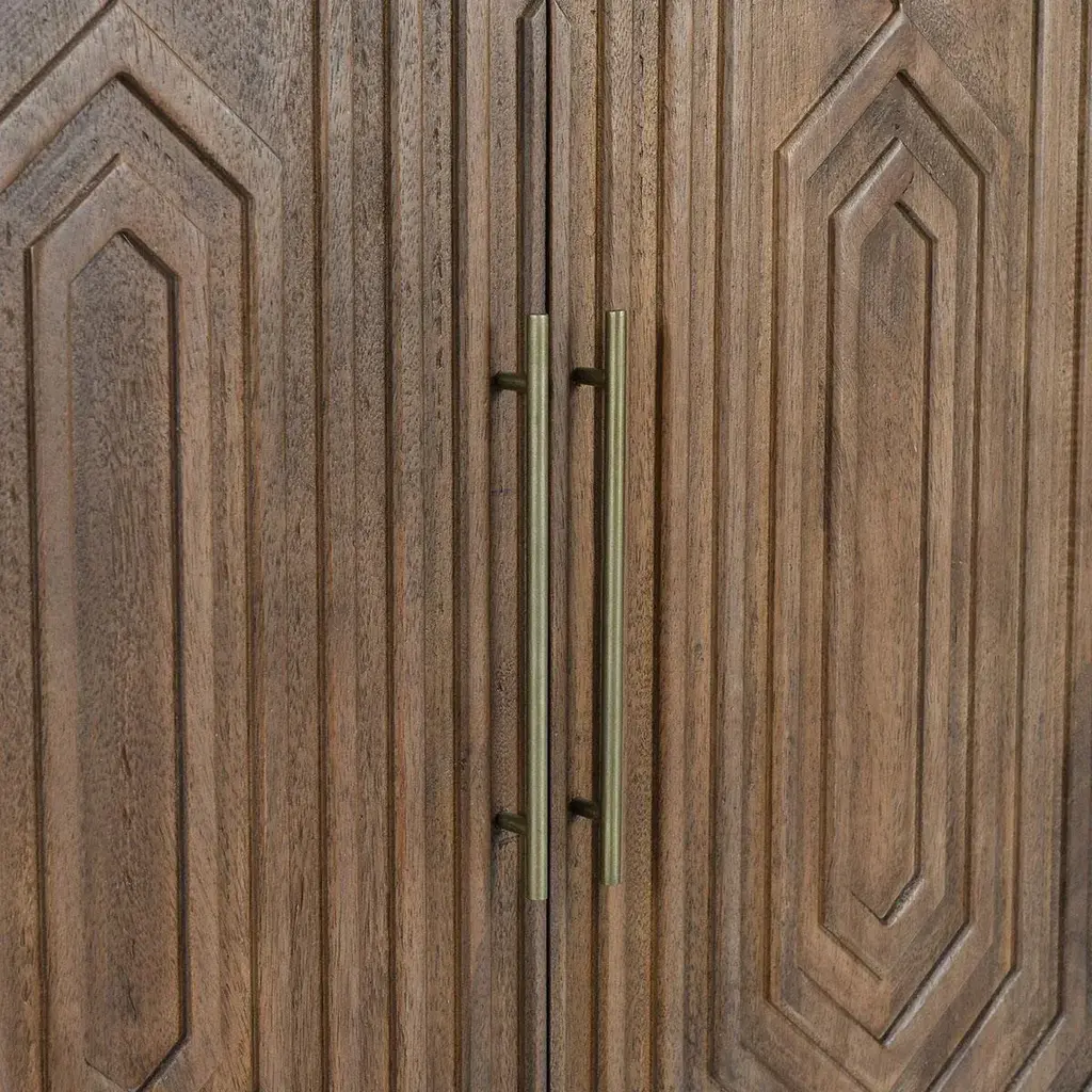 Deco style mango wood bar cabinet with beautiful carved design on two front doors. Sleek brass finish handles. Each may vary in natural wood tones, grain and natural imperfections. This cabinet weighs approx. 190 lbs.