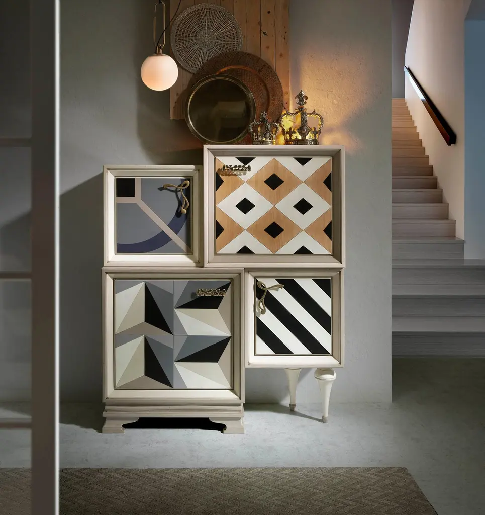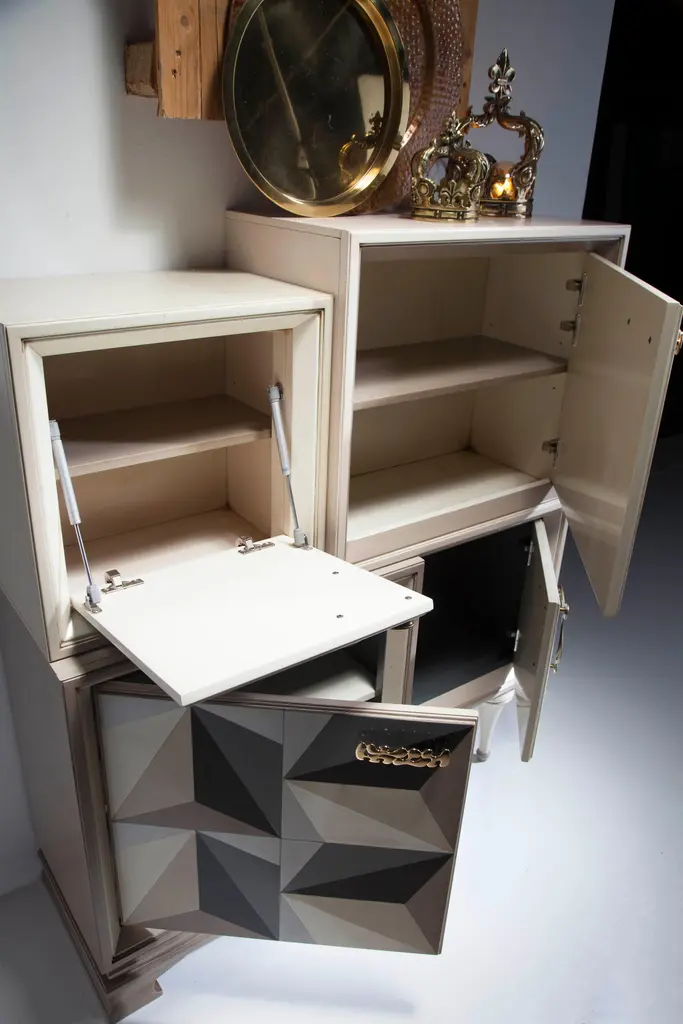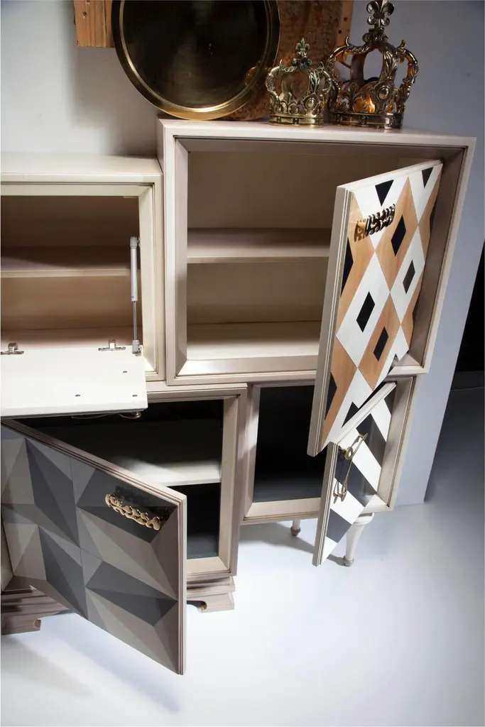 Dinastía Bar Cabinet by Lola GlamourDimensions: D 40 x W 120 x H 145 cmMaterials: Wood.Piece designed for those who fell in love with the Dynasty series but do not want to give up the color and textures of Lola Glamor. One more step that represents the natural evolution of our design line over the years. Four doors with unexpected openings and an impeccable interior make it the most versatile auxiliary wardrobe. We love it as a bar cabinet. Where would you put it?We are Félix and Désirée Ramos, brothers and product designers of our brand, Lola Glamour.We are interested in the singular, the different, the beauty, and the balance of color and materials. We have the ability to observe and the ability to translate any beautiful object into a piece of furniture.We are proud of having created our own style, a way of understanding design, which allows us to tell stories and connect with the souls of people and spaces.Lola Glamor is a Spanish company from Soria, which has designed and manufactured unique furniture in noble woods, with artisanal construction and extraordinary finishes since 1995. Artistic furniture that is customized in size and finish according to the client's needs.We offer original furnishing solutions for professionals and individuals from any country in the world, mixing materials, volumes, motifs, and colors that achieve their own style.We are, above all, the sum of a team of people who contribute their dedication and commitment to a unique level of demand, detail, and quality.