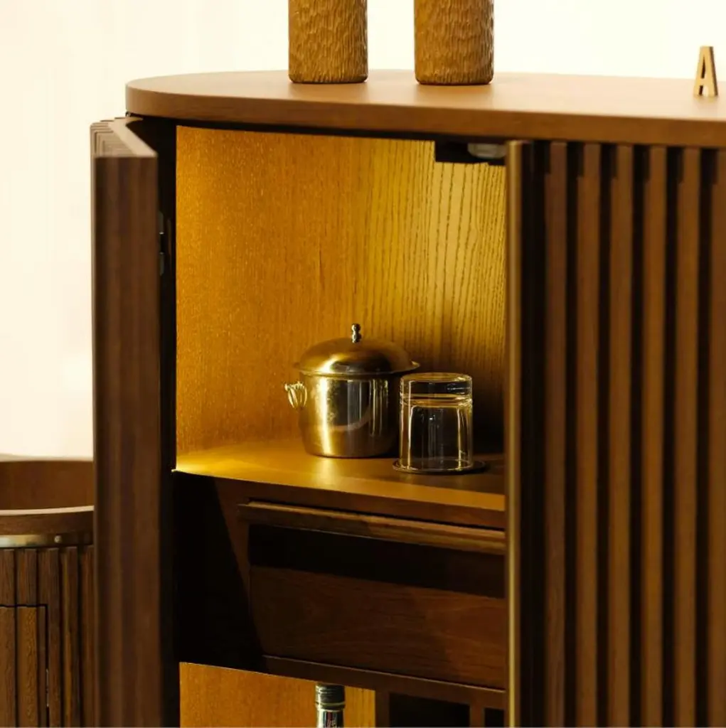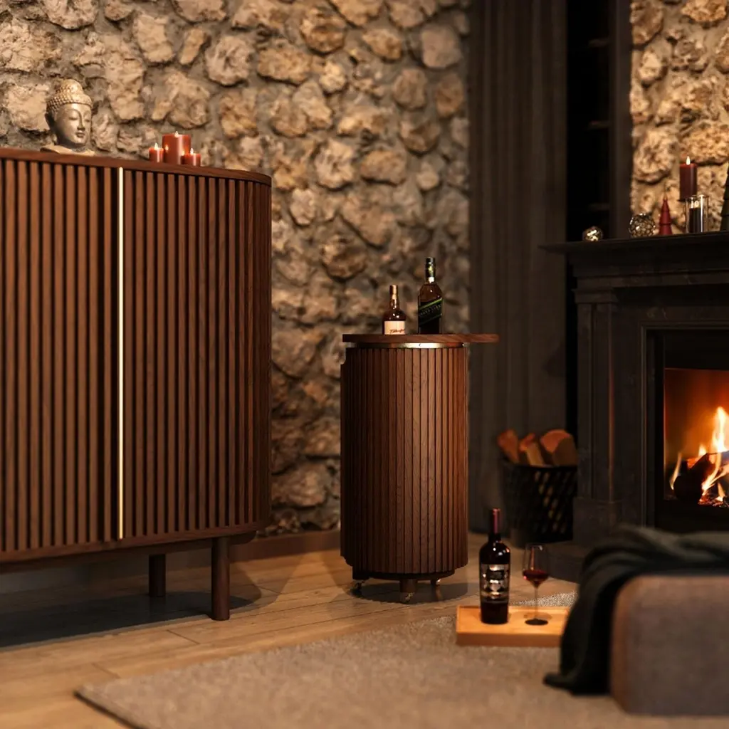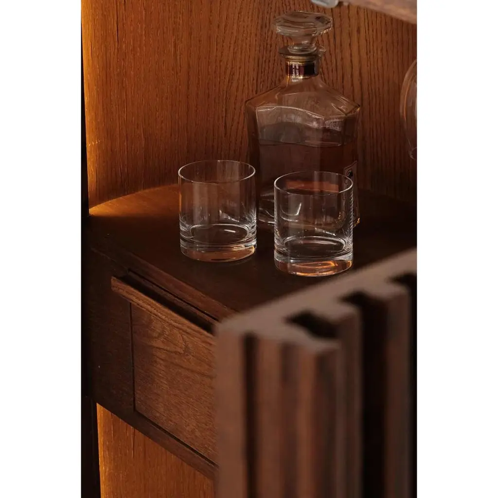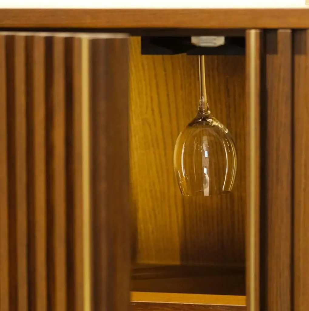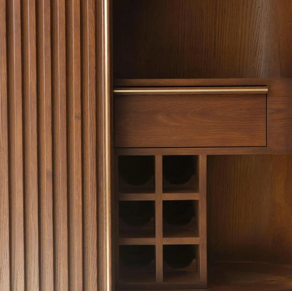 Docia bar cabinet is carefully produced entirely from oak wood. Designed with attention to the wine storage, the bar cabinet has spaces for liqueurs and glasses.There are places to put wine that are designed by paying attention to the degree of holding the wine. You can hang wine glasses inside the bar cabinet. Additionally, you can put corkscrews and necessary products in their drawers. After preparing your alcohol in the cabinet. Using hidden LED inside the cabinet helps illuminate the beverage preparation process.Solid Oak / Widht: 120 Depth: 48 Height: 125 cmOur product is made of oak wood and completely handcrafted. Each type of wood has a unique pattern, texture, shade, and vein pattern. These differences give a unique identity to each Ananas product. Capillary cracks, wormholes, and deformations caused by environmental factors (seasonal deformations) highlight the naturalness of the wood. Due to its structure, wood is not resistant to chemicals, acidic liquids, cleaning products, impact, direct flame contact, friction, or contact with high-temperature materials (cups, pots, etc.). A water-based matte varnish has been applied on the surface of the product. Thus, the longevity of the product has been ensured by eliminating any imperfection, mark, or stain that may be caused by use.We process kiln-dried wood for you (7 to 12 percent). Still, you should keep your product away from water, flame, moisture, and sunlight, the greatest enemies of wood. Thus, you can eliminate any imperfection, mark, or stain that may be caused by use.