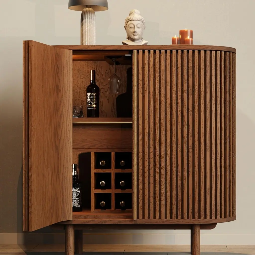 Docia Cocktail / Liquor / Bar Cabinet, Oak, Slatted Body