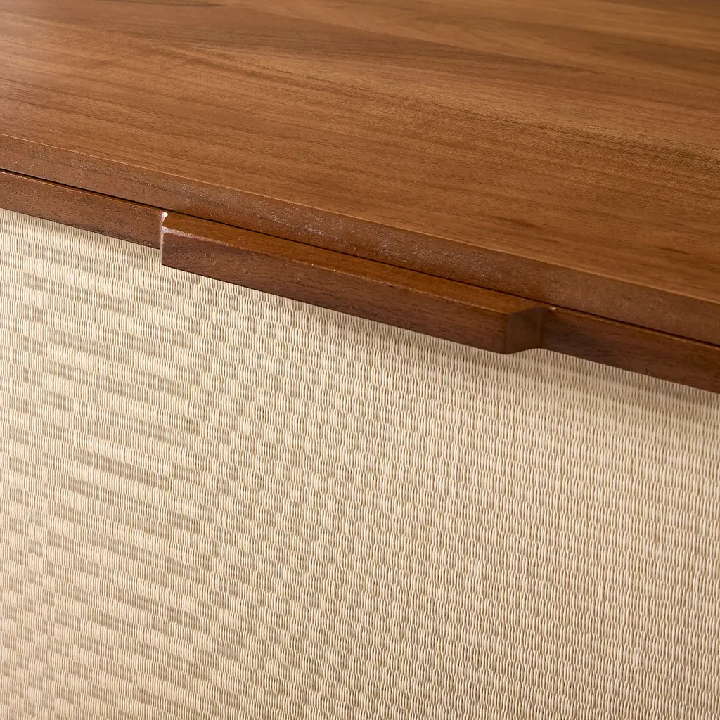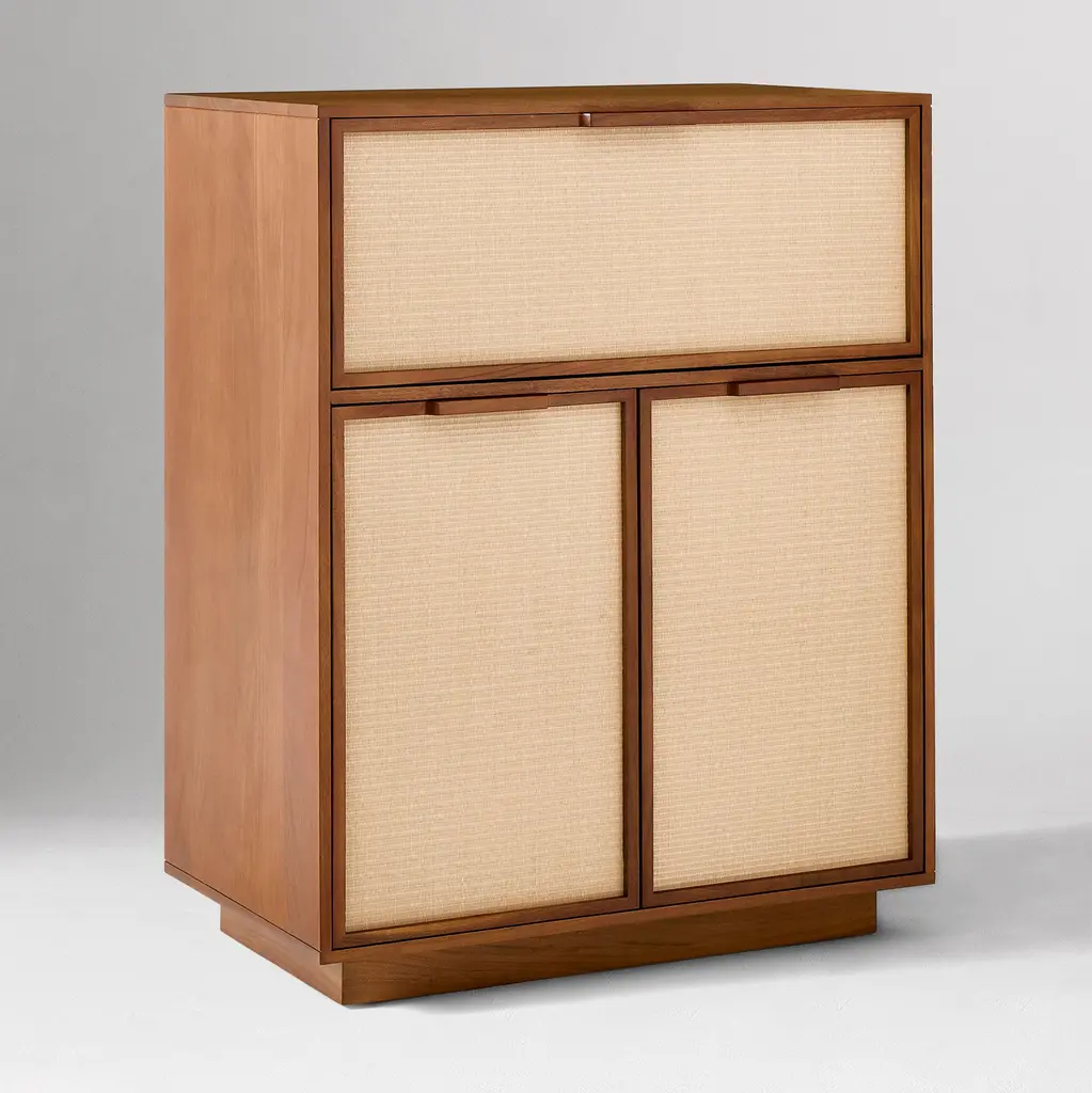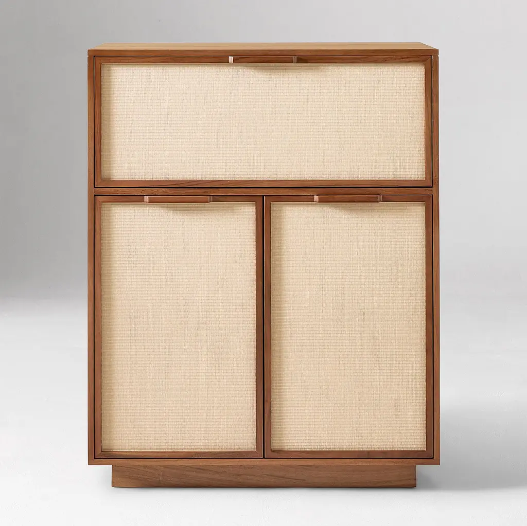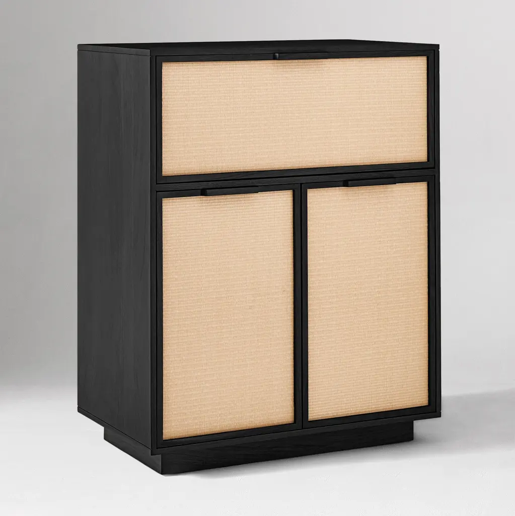 Finely woven tatami brings simple elegance to this bar cabinet. Clean geometric frame with minimalist integrated handles. Serves up storage for cocktail and barware essentials. Contract Grade, so you know it’s built to last.