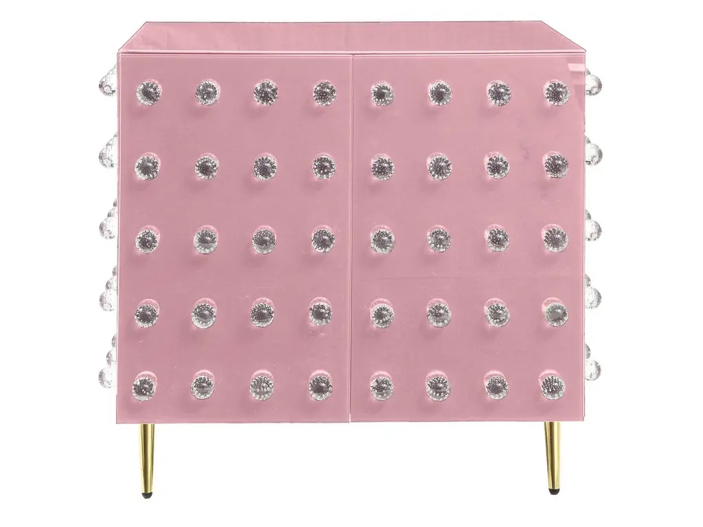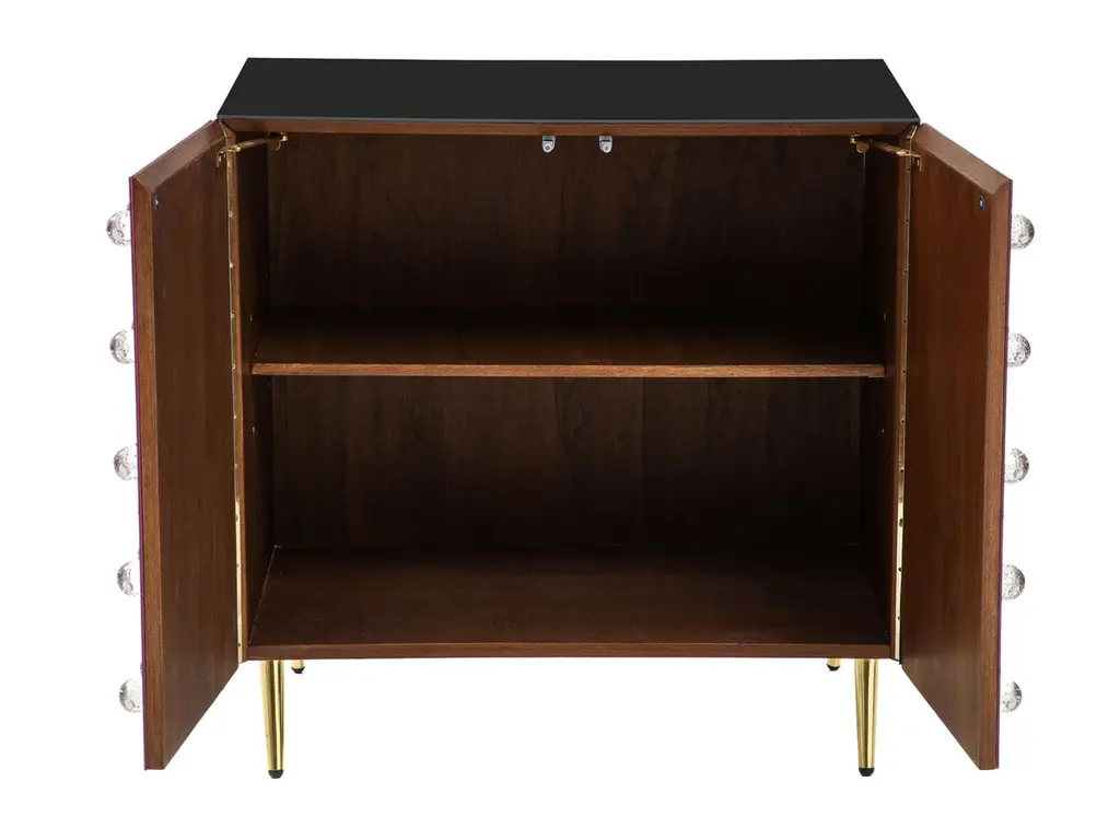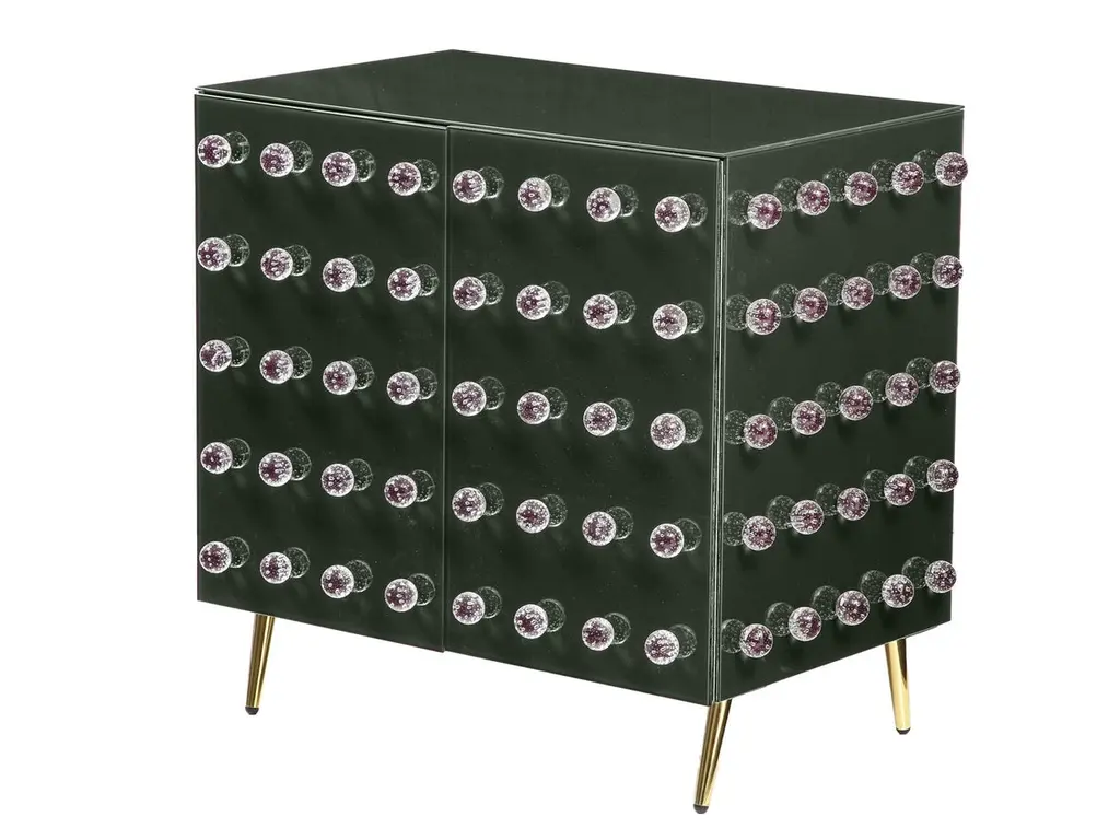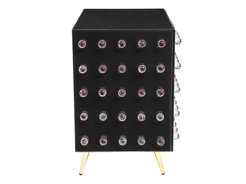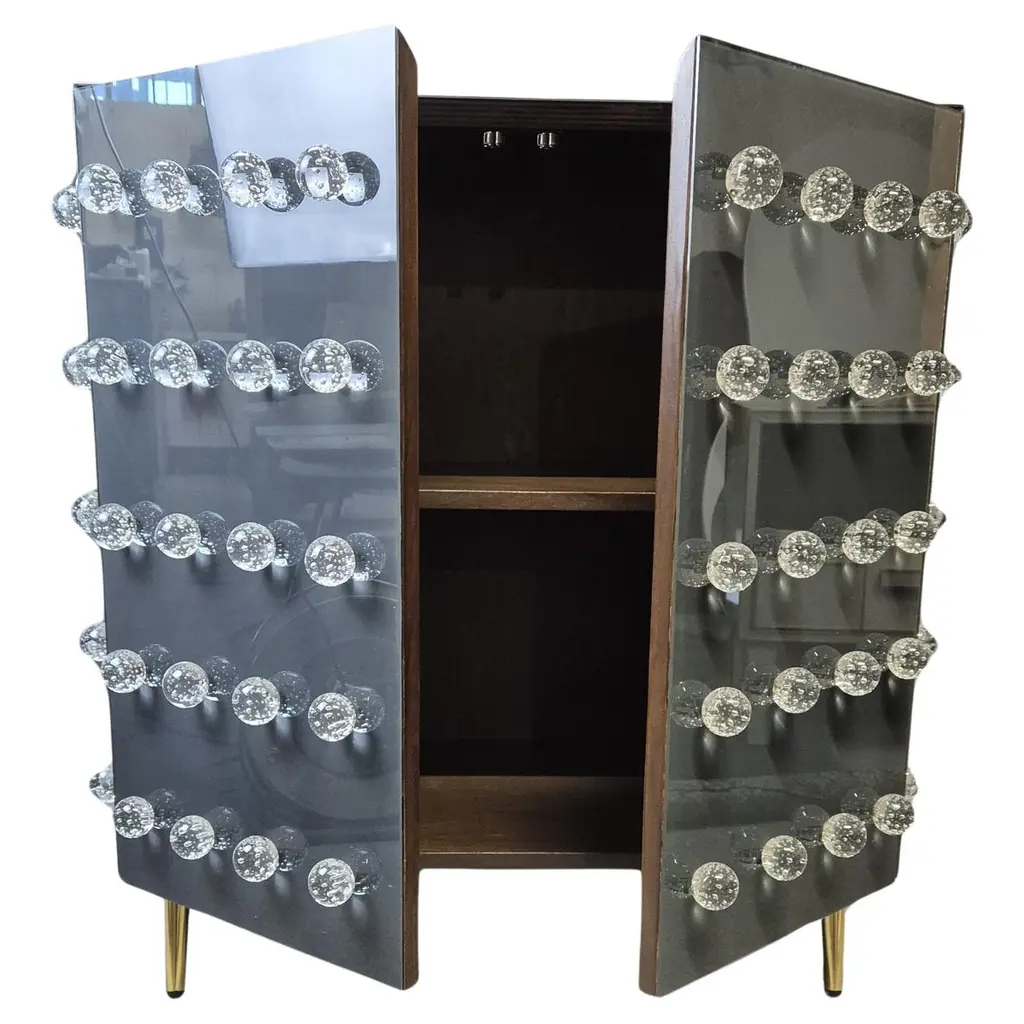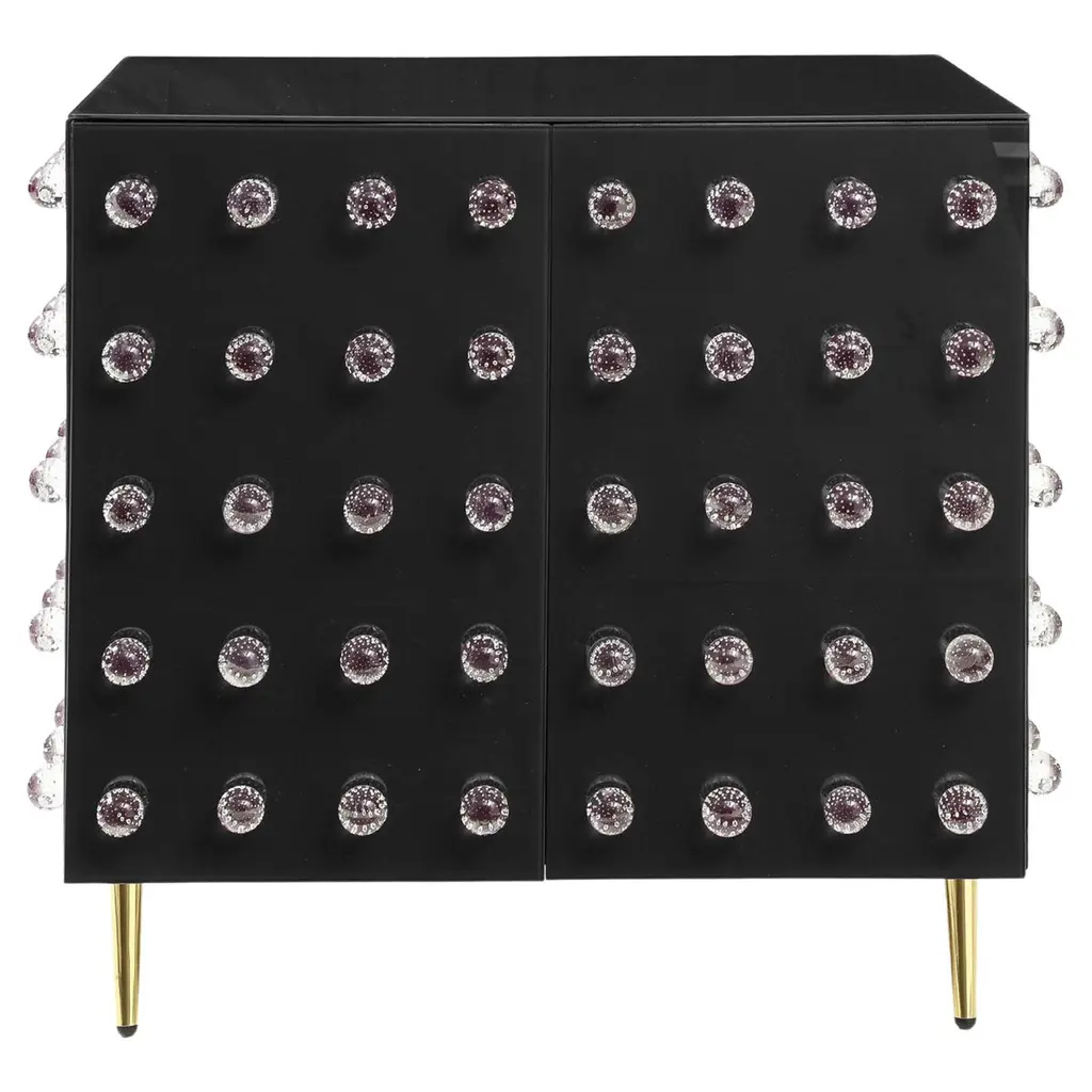 This sublime cabinet is a true work of art, handcrafted by expert Murano glassmakers blending ancient and modern styles. This cabinet features 90 exquisite Murano glass spheres decorating a rich black glass surface. Opulent brass feet complete the refined look. The structure of the cabinet is made entirely of birch trees.Crafted as a unique, one-of-a-kind piece, this mid-century modern cabinet showcases the time-honored techniques of Venetian artisans. The hand-engraved Murano glass spheres are mouth-blown using centuries-old methods passed down through generations on the island of Murano. An extraordinary statement piece, it will bring a touch of Italian glamour to your home.This handmade cabinet is made to order, allowing 3-4 weeks for the skilled craftsmen to create your bespoke treasure. A true objet d'art, it exemplifies the passion and quality of Murano's legendary glassmaking tradition.