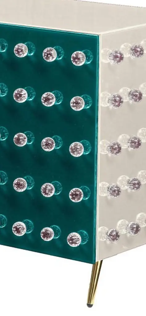 Dry bar luxury in handcrafted Murano glass made in Italy Justfurnituress DesignDiscover the exceptional Murano glass bar cabinet, a unique piece crafted by JustFurnituress that combines Italian artisanal tradition with modern and sophisticated design. This cabinet is perfect for those looking to add a touch of luxury and refinement to their space.### Key Features:- High-Quality Materials: The cabinet's structure is made from your choice of birch, poplar, or walnut wood, ensuring durability and stability. The brass legs not only provide sturdy support but also add a touch of elegance.- Unique Design: The blue and white mirrored panels give the cabinet a contemporary and bright appearance, while the 'jewel' spheres made of Murano glass catch the light and enchant guests. Each piece is handcrafted, making it unique and one-of-a-kind.- Customization: This cabinet is fully customizable in colors and styles. You can choose the wood, finish, and decorative details to create a piece that perfectly fits your decor and personal taste.- Functionality: Designed to hold a variety of alcoholic beverages, glasses, and bar accessories, this cabinet is ideal for entertaining guests. The open design encourages social interaction, making every occasion special.- Italian Craftsmanship: Each cabinet is the result of a meticulous production process that takes 5-6 weeks. This investment in design and craftsmanship ensures a quality piece that will last for years to come.### Why Choose This Cabinet?Adding this Murano glass bar cabinet, made by JustFurnituress, to your home means selecting a product that is not only functional but also a work of art. The beauty of Murano glass, combined with high-quality materials and attention to detail, makes this cabinet a distinctive element in your decor.Perfect for living rooms, dining areas, or bar zones, this cabinet will be the focal point of your entertaining occasions. Whether for an elegant dinner or an informal gathering with friends, our cabinet represents an exclusive way to enhance your space.### Contact UsDon't miss the opportunity to own a unique piece of artisanal furniture by JustFurnituress. Contact us for more information on customization options and to discover how this extraordinary Murano glass bar cabinet can transform your space. Add a touch of elegance and sophistication to your home with our bar cabinet-an investment in beauty and functionality.