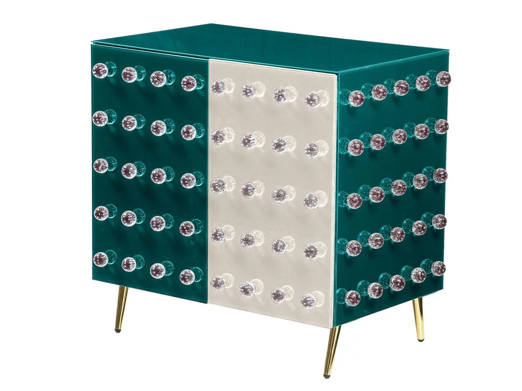 Dry bar luxury in handcrafted Murano glass made in Italy Justfurnituress DesignDiscover the exceptional Murano glass bar cabinet, a unique piece crafted by JustFurnituress that combines Italian artisanal tradition with modern and sophisticated design. This cabinet is perfect for those looking to add a touch of luxury and refinement to their space.### Key Features:- High-Quality Materials: The cabinet's structure is made from your choice of birch, poplar, or walnut wood, ensuring durability and stability. The brass legs not only provide sturdy support but also add a touch of elegance.- Unique Design: The blue and white mirrored panels give the cabinet a contemporary and bright appearance, while the 'jewel' spheres made of Murano glass catch the light and enchant guests. Each piece is handcrafted, making it unique and one-of-a-kind.- Customization: This cabinet is fully customizable in colors and styles. You can choose the wood, finish, and decorative details to create a piece that perfectly fits your decor and personal taste.- Functionality: Designed to hold a variety of alcoholic beverages, glasses, and bar accessories, this cabinet is ideal for entertaining guests. The open design encourages social interaction, making every occasion special.- Italian Craftsmanship: Each cabinet is the result of a meticulous production process that takes 5-6 weeks. This investment in design and craftsmanship ensures a quality piece that will last for years to come.### Why Choose This Cabinet?Adding this Murano glass bar cabinet, made by JustFurnituress, to your home means selecting a product that is not only functional but also a work of art. The beauty of Murano glass, combined with high-quality materials and attention to detail, makes this cabinet a distinctive element in your decor.Perfect for living rooms, dining areas, or bar zones, this cabinet will be the focal point of your entertaining occasions. Whether for an elegant dinner or an informal gathering with friends, our cabinet represents an exclusive way to enhance your space.### Contact UsDon't miss the opportunity to own a unique piece of artisanal furniture by JustFurnituress. Contact us for more information on customization options and to discover how this extraordinary Murano glass bar cabinet can transform your space. Add a touch of elegance and sophistication to your home with our bar cabinet-an investment in beauty and functionality.