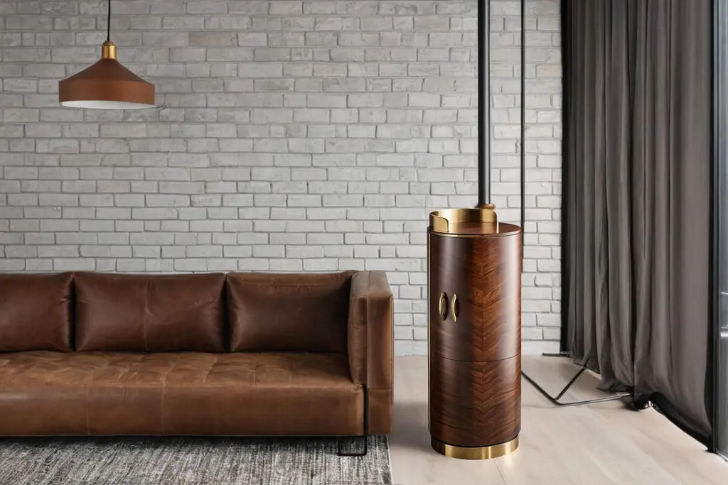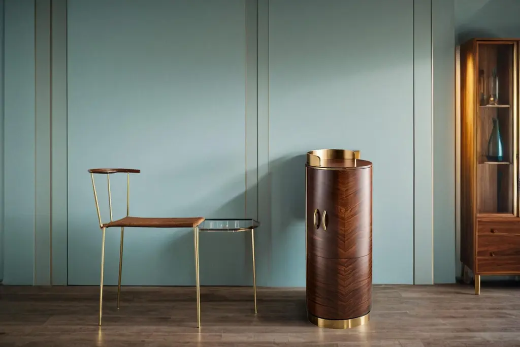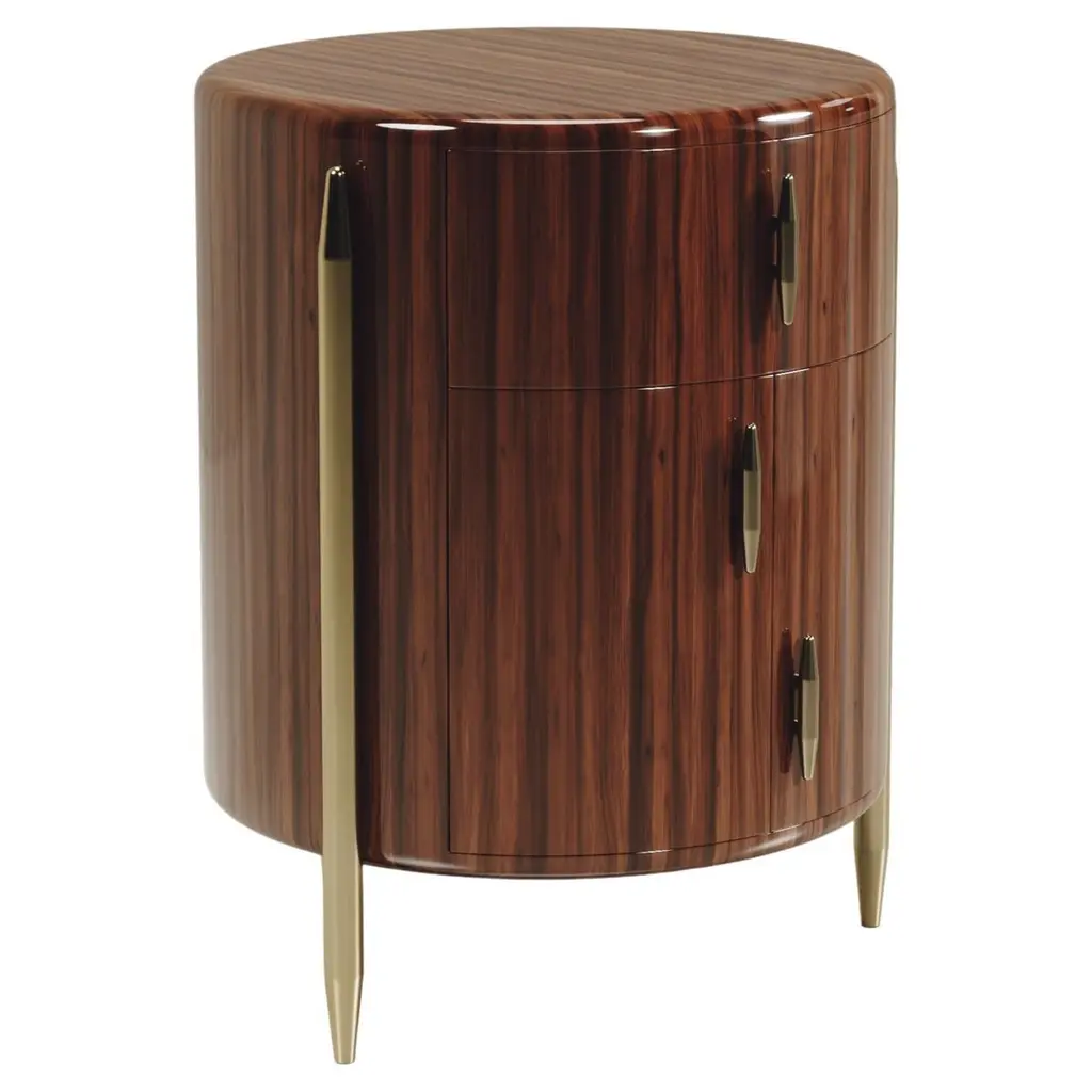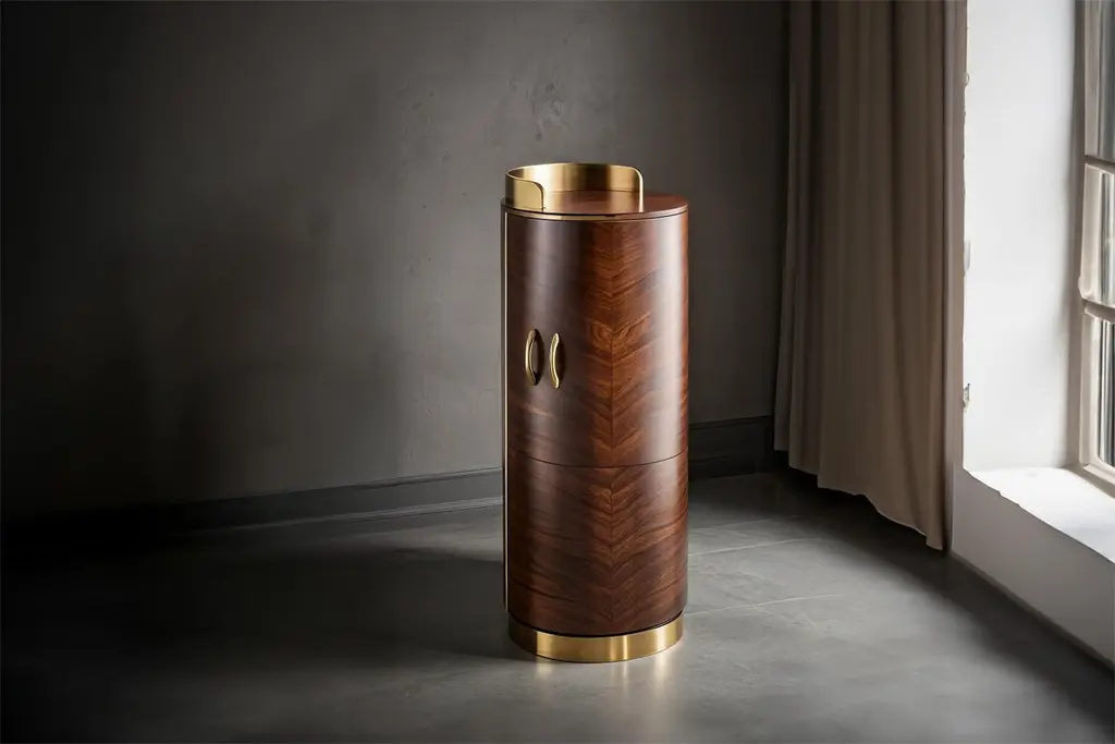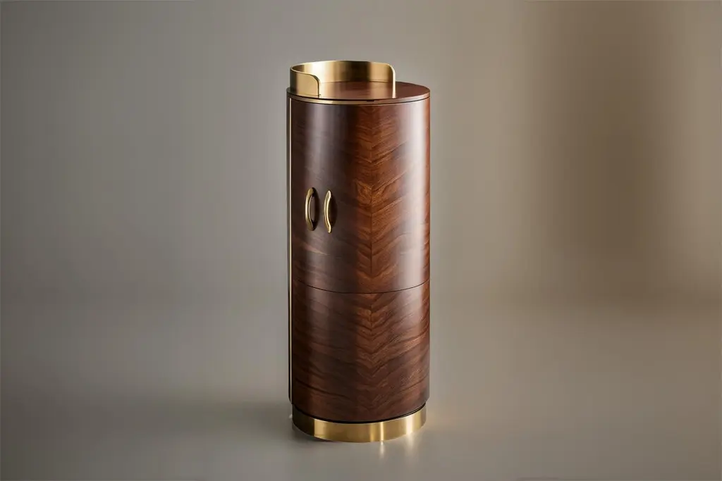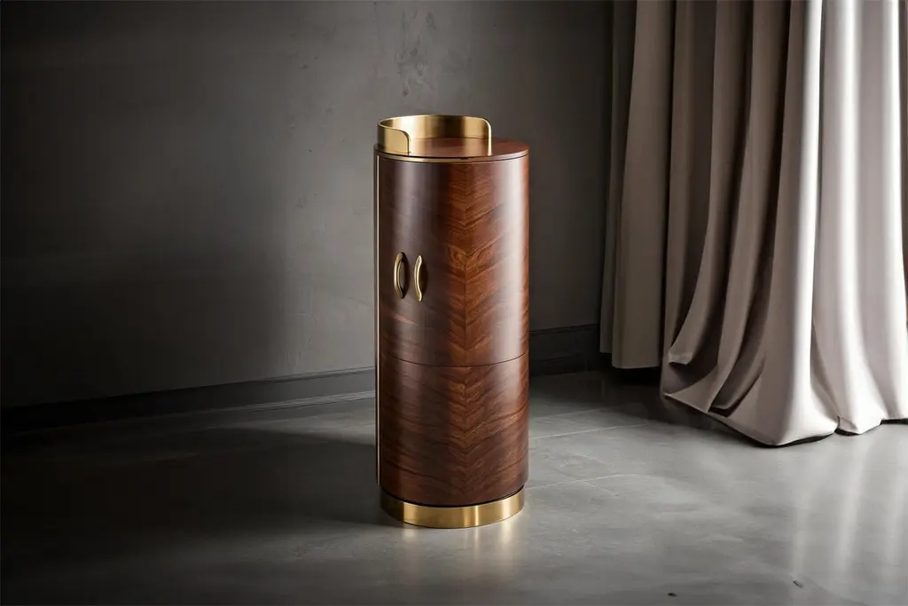 Discover the timeless elegance of Art Deco with our exquisite round bar cabinet! Handcrafted from fine walnut veneer and finished with shiny brass fittings, this bar cabinet is not only a functional piece of furniture, but also an artistic statement in your home. Its sophisticated design and high-gloss lacquered finish add a touch of luxury and glamor to any room. Perfect for lovers of sophisticated design and fine taste. Treat yourself to this stunning eye-catcher for your home decor and impress your guests on any occasion!As with all of our furniture, you are purchasing the highest quality here. The entire piece of furniture is covered with a multi-layer structure of various varnishes and primers and has a multi-layer finish. A piece of history and craftsmanship that we were able to give the old splendor of the 1920s with a lot of love and perfection.Height: 100cmWidth: 45cmDepth: 45cmStyle: Art DecoPlace of origin: GermanyPeriod: mid-20th centuryMaterials and techniques: walnut, molded glue, high-gloss lacquer, brassCondition: New. Lacquered in high gloss.If you would like the sideboard in a different size, paint color or wood, please contact us!We look forward to your ideas!