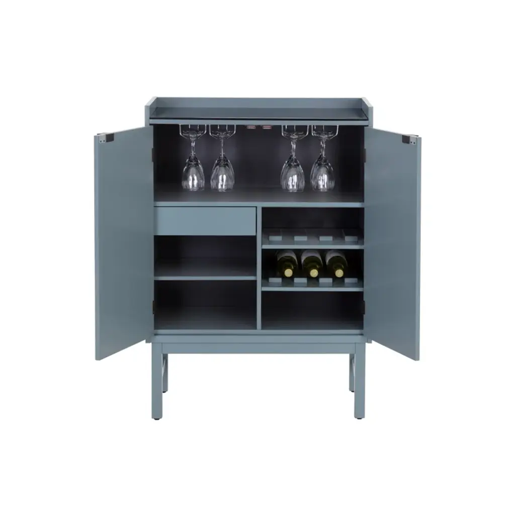 Elegant yet modern addition to your space. The Wesson Wine Cabinet Collection features a Tempered Glass Top with painted MDF and Rubberwood. This mid-century inspired piece is set atop wooden legs features a cabinet with a stemware rack and can hold 6 standard wine bottles. This piece offers minimal footprint along with the levelers on legs for a better stability. It also includes the anti-tipping kit making it a durable and stylish cabinet all together. Metal hardware in matt black finish completes the look. Available in 4 different colors. Assembly required.