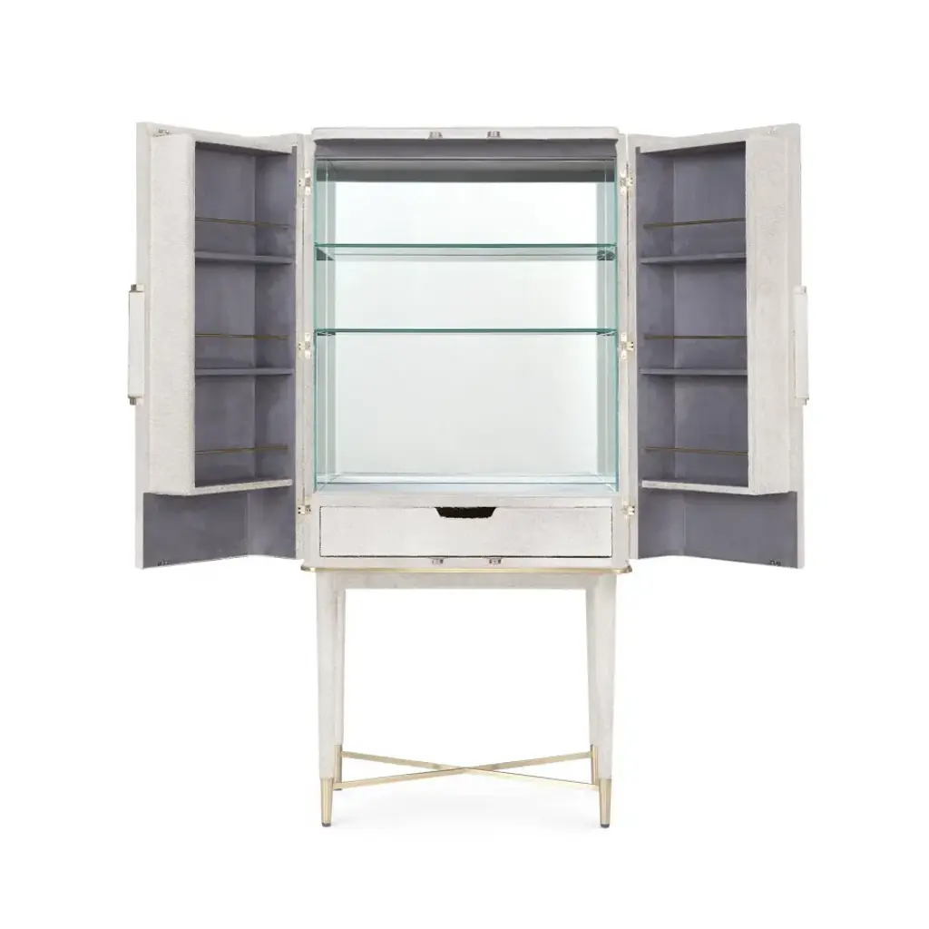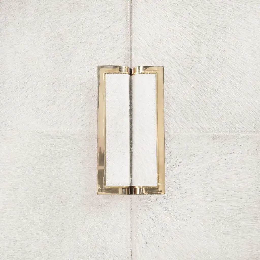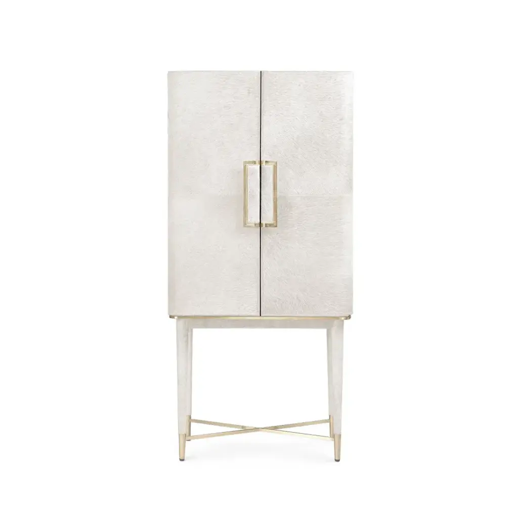 Home entertaining has never looked so fabulous. The Florian Tall Bar Cabinet is an essential piece for every host with the most, boasting a glamorous exterior and stunning reveals. A luxurious upgrade of Art Deco design, the cabinet is draped in plush white hair-on-hide with polished brass accents throughout, from its pulls to its crossbar and sabots. The wow-factor continues upon opening, where a swanky interior space boasts rich micro-suede, glass shelving, and a glittering mirrored back. With two center shelves, six fixed door shelves, and an additional hair-on-hide drawer within, the Florian provides plenty of storage for all your home bar needs. An upscale pick for any home, and especially useful in smaller spaces in need of compact storage.