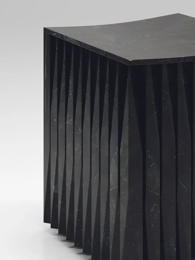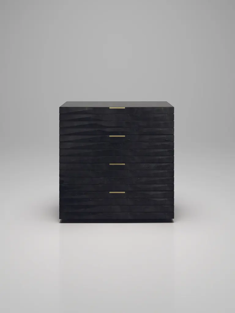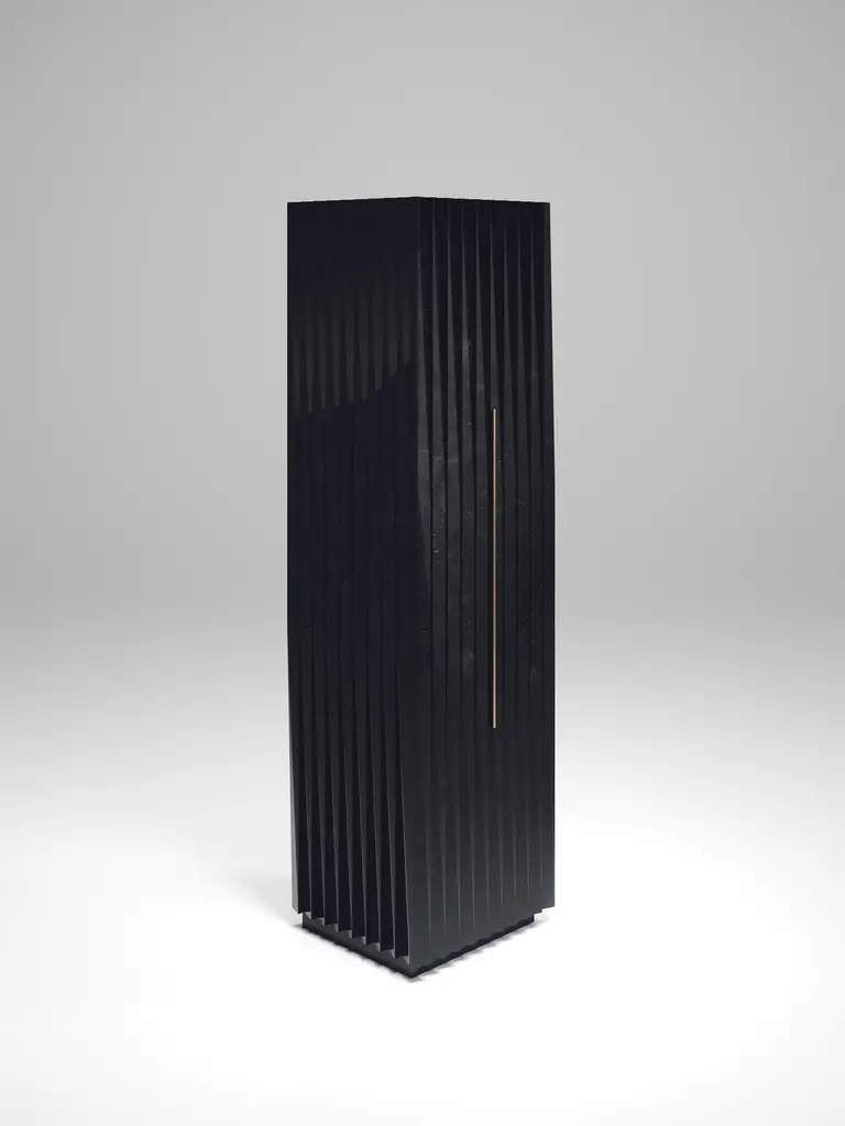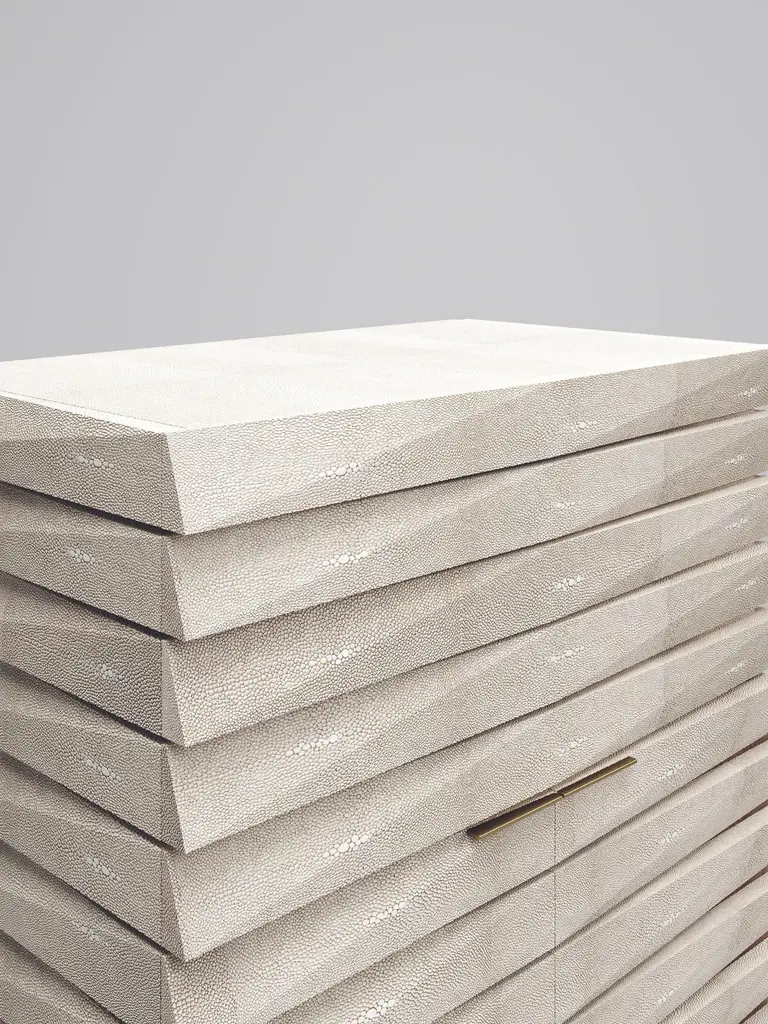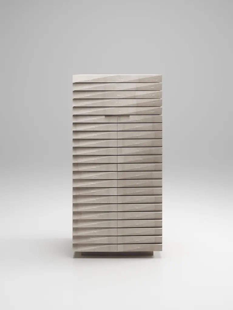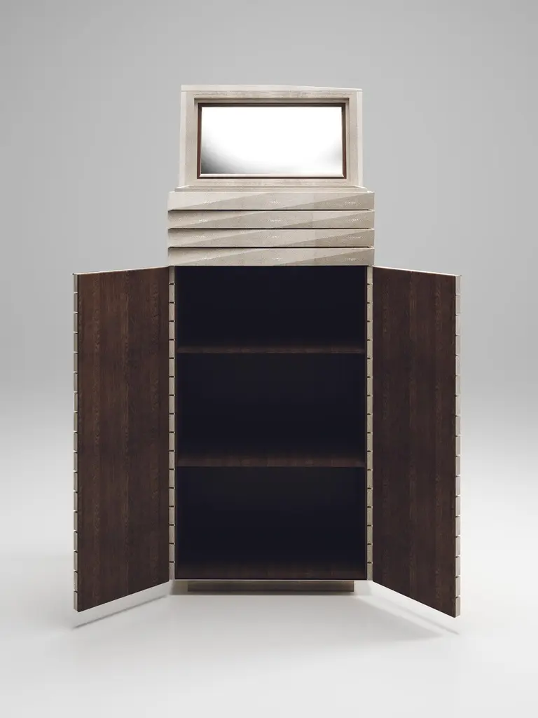 The Paris based label has distinguished themselves since their launch, with their iconic use of shagreen mixed with brass and other exotic materials. All furniture is handcrafted by skilled artisans, ultimately making each piece unique, designed in Paris and produced in the Philippines.The fluted bar cabinet by R & Y Augousti is a sleek and geometric design. The black pen shell inlaid piece provides great utility while retaining a striking aesthetic with the incredible hand craved fluted details. This piece can be used as a bar cabinet or a jewellery vanity cabinet. This design includes a mirror, 3 open shelves and a a compartment beneath the flap open mirror with a flat bronze-patina brass handle. Available as a chest of drawers, stool and cabinet as well as other finishes see images at end of slide. Custom color/sizing available on request.The dimensions of this piece are :23.5" x 13.75 x 47.5"All R & Y Augousti pieces are handmade by artisans, ultimately making each piece unique.Wipe clean with soft dry cloth.Acclaimed design duo Ria & Yiouri Augousti have established themselves since the 1990s as pioneers of modern-vintage style through their luxurious Art Deco inspired collections.The Paris based label has distinguished themselves since their launch, with their iconic use of shagreen mixed with brass and other exotic materials. All furniture is handcrafted by skilled artisans, ultimately making each piece unique. All shagreen-covered items should be kept out of direct sunlight, color variants may occur on the stingray and other exotic finishes, but this showcases the Parisian label's commitment to creating authentic luxurious products using natural components.