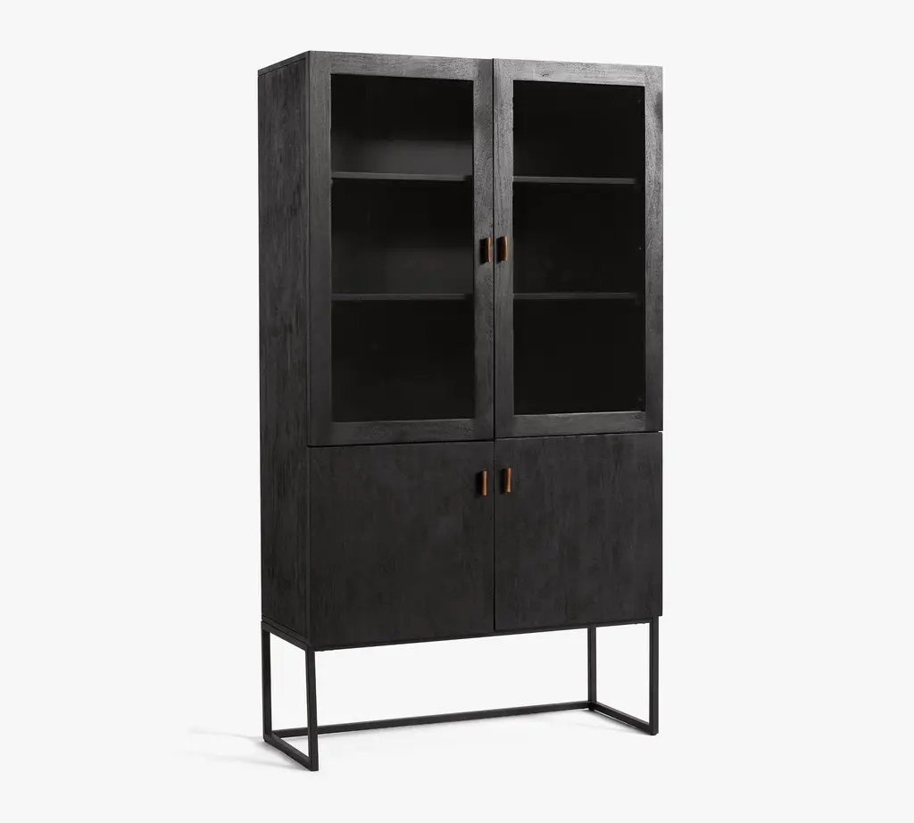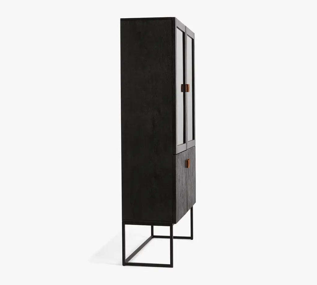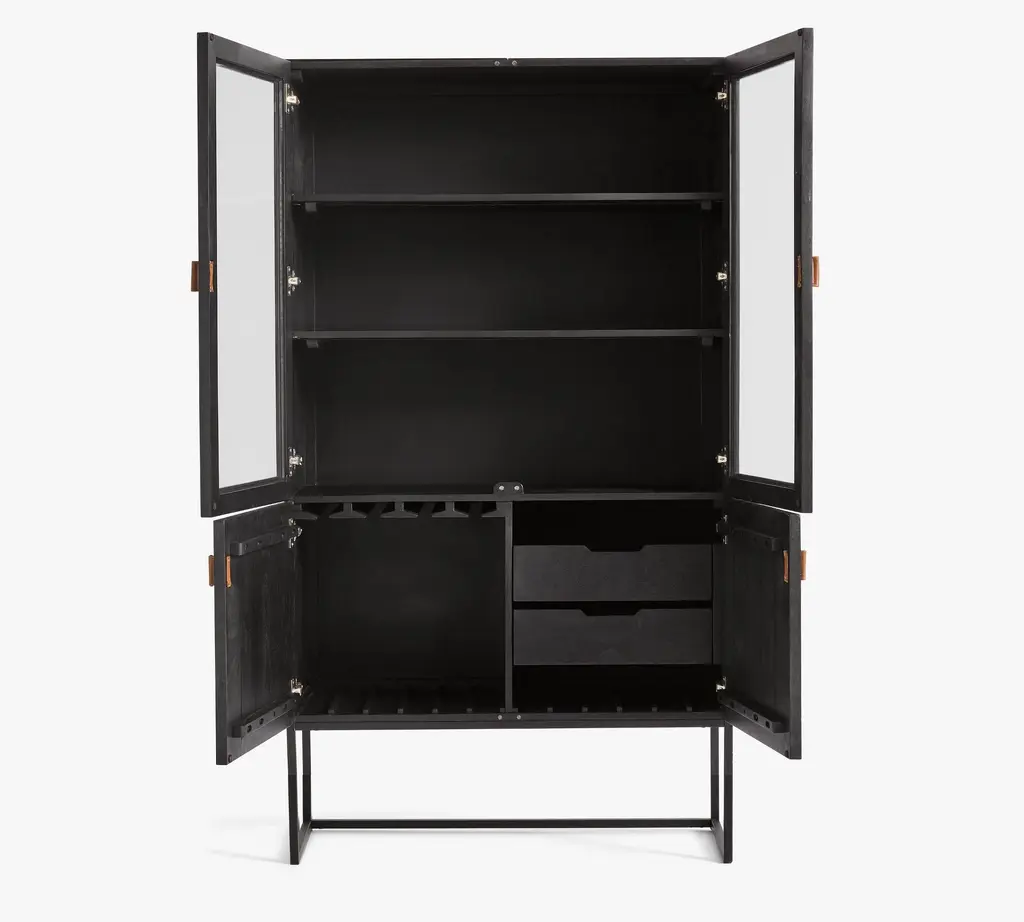 A warm mix of materials, Hardy combines the rustic look of wood with metal – the leather pull adding just the right amount of visual interest. This versatile cabinet features glass doors on top, perfect for showcasing a curated display of bottles, barware, and beautiful objects.