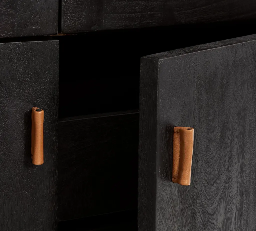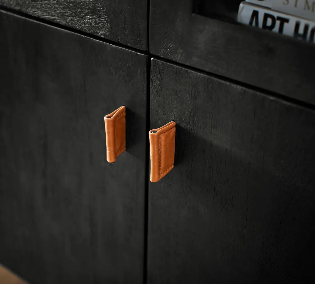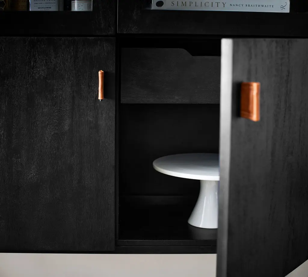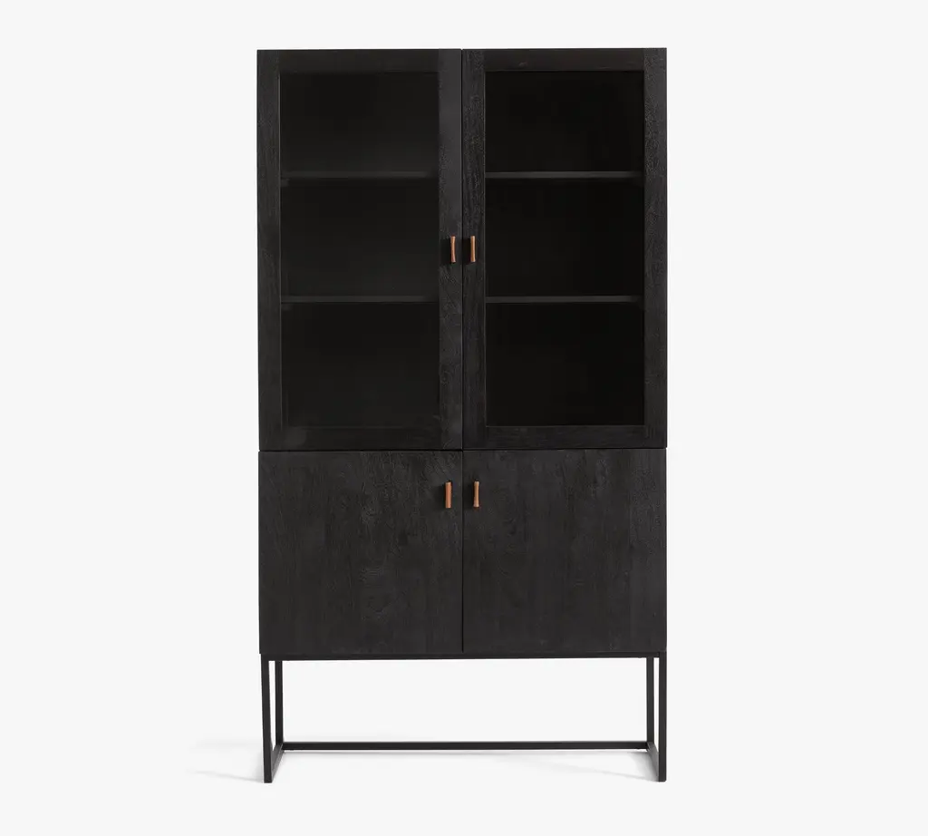 A warm mix of materials, Hardy combines the rustic look of wood with metal – the leather pull adding just the right amount of visual interest. This versatile cabinet features glass doors on top, perfect for showcasing a curated display of bottles, barware, and beautiful objects.