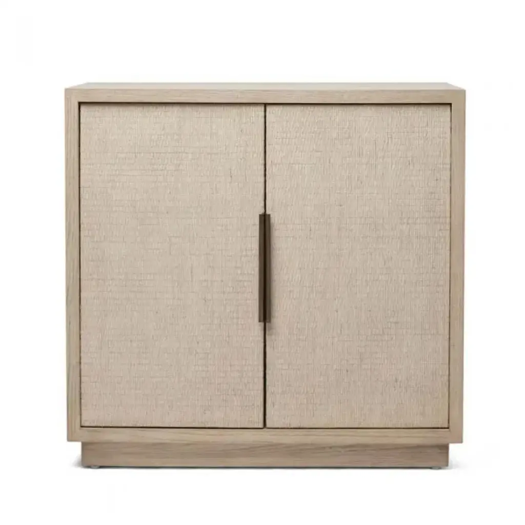 Featuring washed taupe wood with raffia insets and metal drawer pulls in satin aged bronze, the Harperly Bar Cabinet brings an organic calm to a storage must-have. This item is made of solid wood. Item will not be exactly as pictured, subtle deviations in hue after finishing can be expected as a result of natural variations in coloration of the base material.