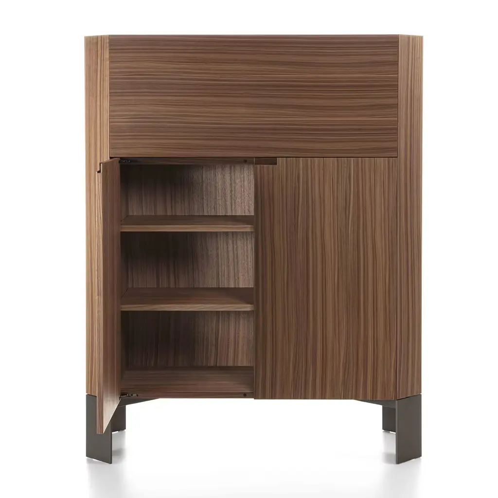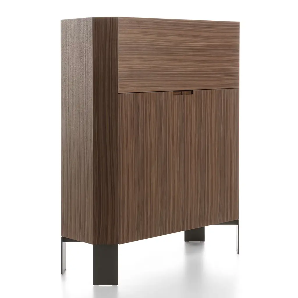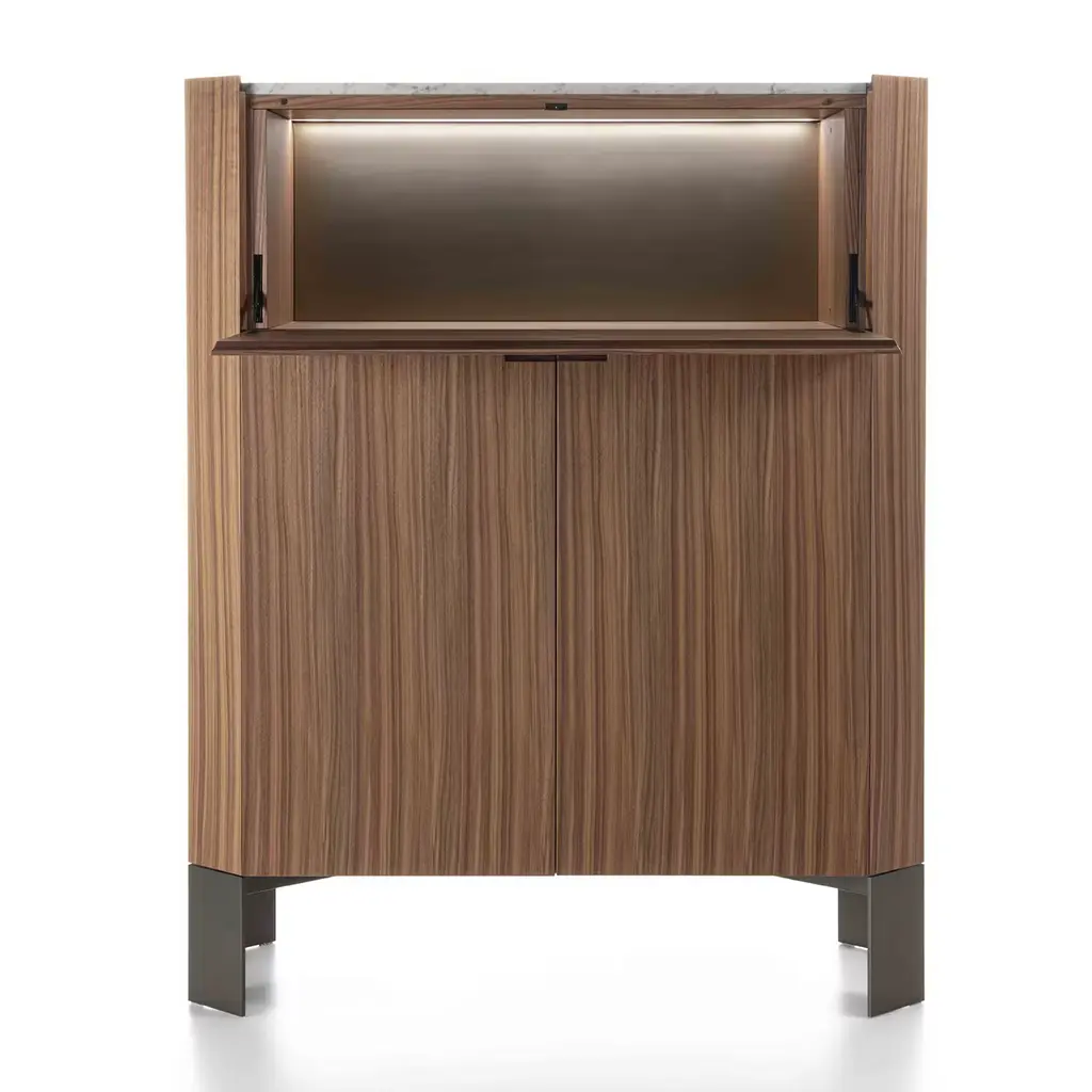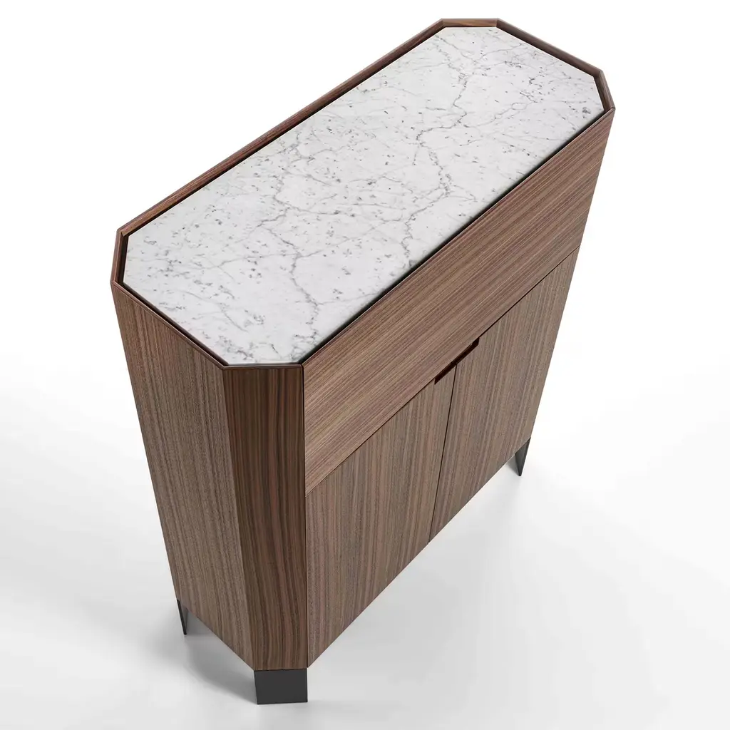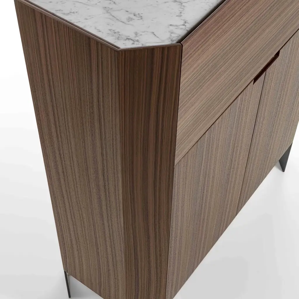 This remarkable bar cabinet in solid Canaletto walnut is distinguished by its characteristic warm tone and rich grain. A cabinetmaking gem brimming with geometric inspiration, the entire structure features a rigorously-sculpted profile that pools together the bronzed metal feet and the Carrara marble top, sealing the piece. Equipped with two hinged doors and a drop-leaf door.