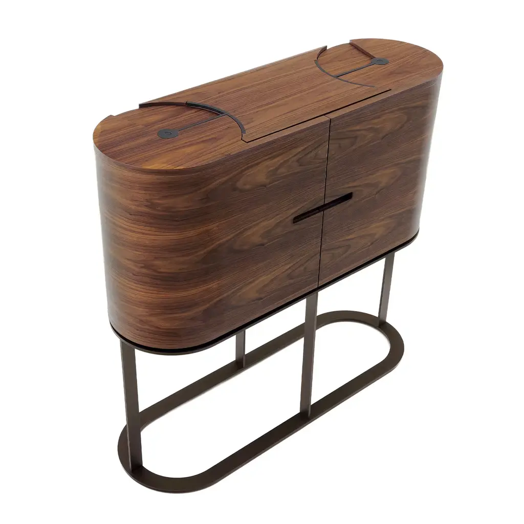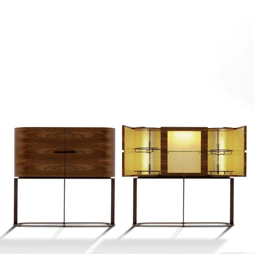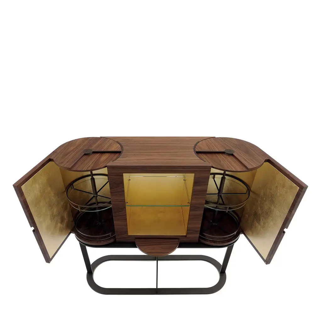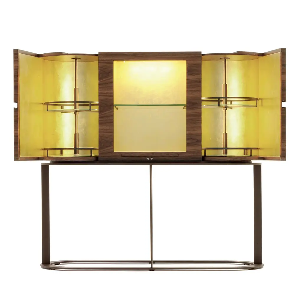 Utmost refinement merges with century-old traditional craftsmanship in this splendid piece of functional decor: a bar cabinet handmade of Canaletto walnut. Internally fashioned of white-lacquered Sycomore Frisé wood, it is comprised of a series of bronze-lacquered metal turning trays, adjustable in height and boasting crystal shelves and LED lights. The clean and sophisticated base is in bronze-lacquered metal.