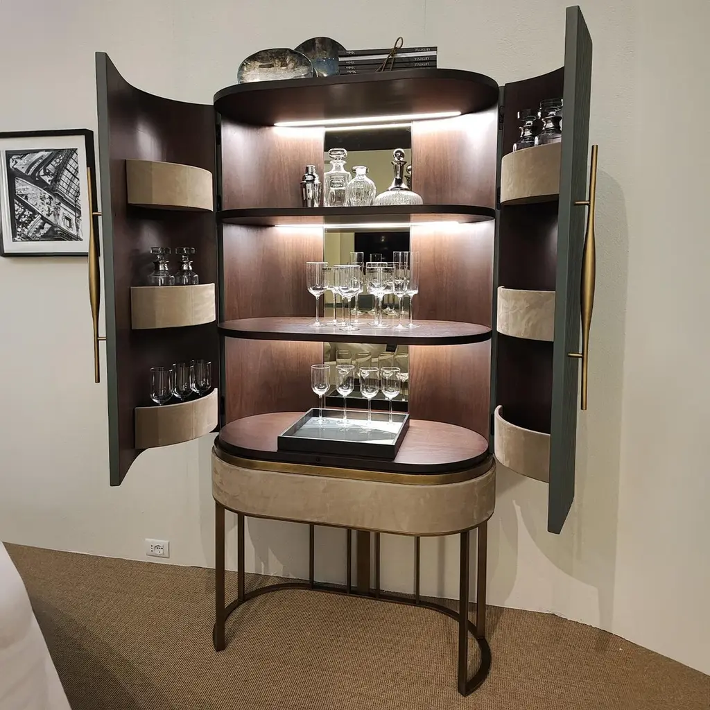 The bar cabinet is in ribbed wood in canaletto walnut and rests on a high metal base, which gives it harmony and proportion. Two important metal handles are characterized by the new copper finish that is repeated in the base. A band covered in nabuck embellishes and expands the possibility of customization.
