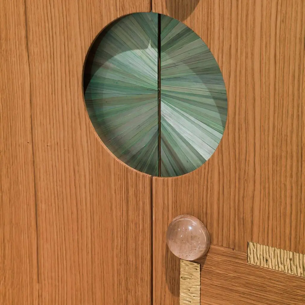 Handcrafted oak wood bar furniture with two doors. Outer side oak wood, natural color, and mat finish. Doors with oak wood contemporary inlay, four brass decorative elements, and two rock crystal details. Glossy lacquered finish in white color, mirror inserts, and glass shelves inside.