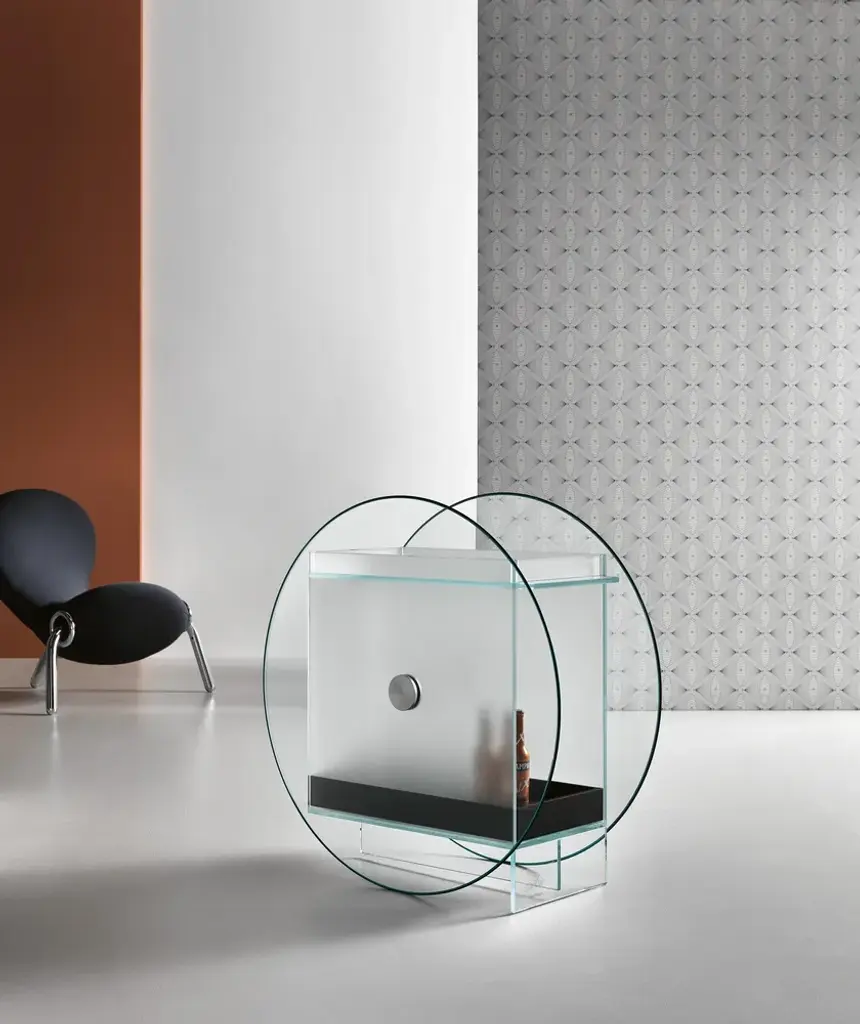 Presented in New York in 2014 to celebrate 10 years of collaboration with Karim Rashid, Kart will be one of the stand-outs of Tonelli design’s 2015 collection. Kart is a bar cabinet, which features large glass wheels that are its iconic bearing structure. Kart is a piece of furniture of great impact, thanks to its glass structure, which shows a glimpse of the objects that are stored inside.
