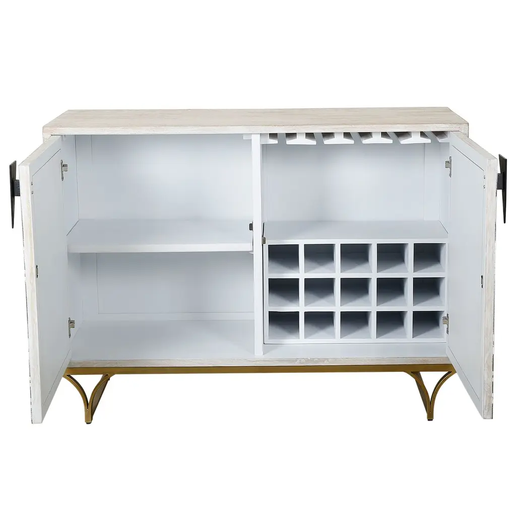 The Lee Bar Cabinet is a delightful fusion of modern design and functional elegance. Its exterior boasts a tasteful finish with captivating geometric patterns on the cabinet doors, created using exquisite inlays. The metal base adds a touch of sophistication to the piece. Inside, you'll find fixed shelving and convenient storage for wine bottles and glassware. The combination of these elements, from the finish to the exquisite inlays and practical storage, makes the Lee Bar Cabinet a charming addition to your living space.