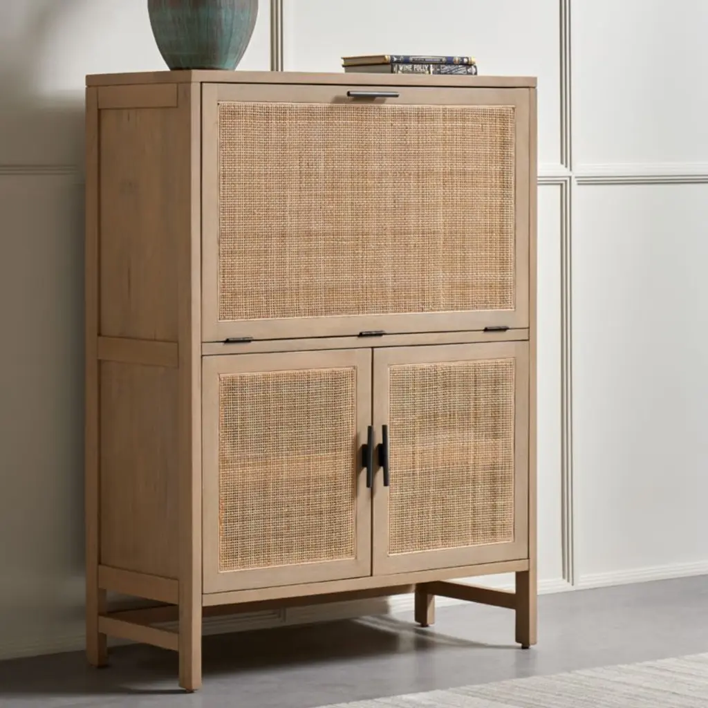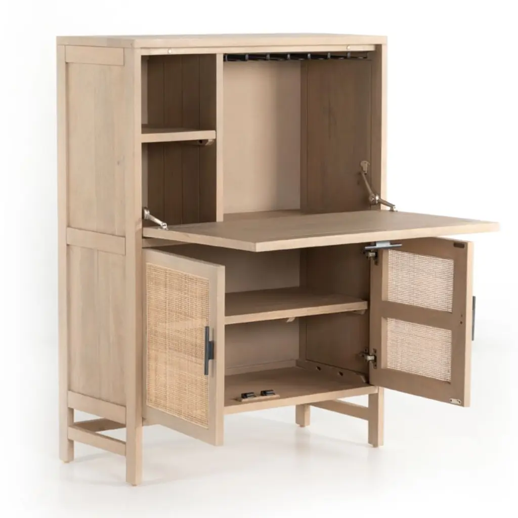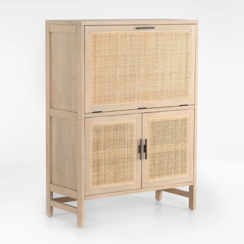 Linear meets coastal in Libby. Framed in natural-finished mango wood, the bar cabinet gets a breezy boost from cane-fronted doors. Long vertical pulls and an open trestle base enhance the geometric silhouette, while the cane's relaxed weave delivers attention-getting texture. A drop-down front serves as an impromptu work surface and opens to a generous interior, outfitted with stemware racks and two cubbies for storing bottles and cocktail glasses. Below, a set of doors provides a veiled glimpse of a fixed shelf for storing additional bar supplies, serving pieces and appetizer plates. The Libby natural mango wood bar cabinet with storage is a Crate & Barrel exclusive.