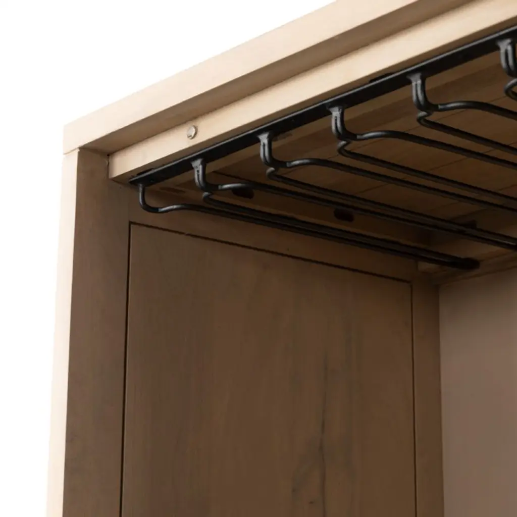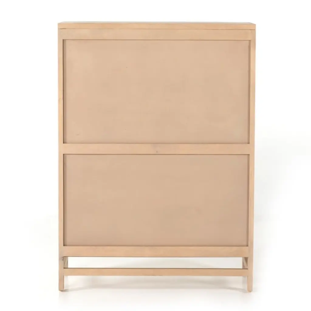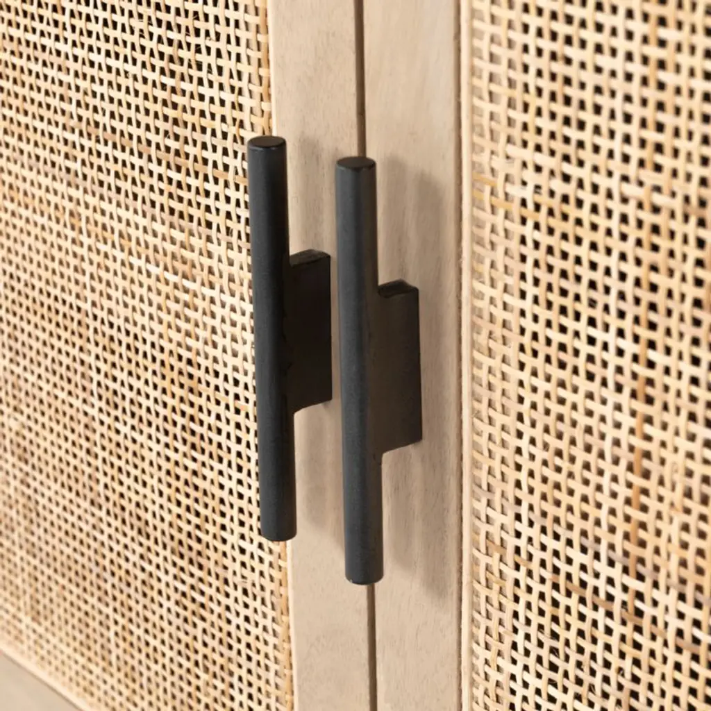 Linear meets coastal in Libby. Framed in natural-finished mango wood, the bar cabinet gets a breezy boost from cane-fronted doors. Long vertical pulls and an open trestle base enhance the geometric silhouette, while the cane's relaxed weave delivers attention-getting texture. A drop-down front serves as an impromptu work surface and opens to a generous interior, outfitted with stemware racks and two cubbies for storing bottles and cocktail glasses. Below, a set of doors provides a veiled glimpse of a fixed shelf for storing additional bar supplies, serving pieces and appetizer plates. The Libby natural mango wood bar cabinet with storage is a Crate & Barrel exclusive.