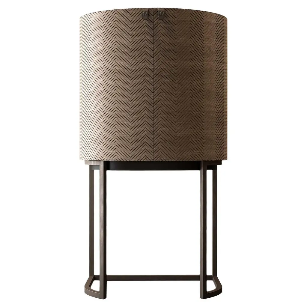 From an exclusive collection of luxury living and dining furnishings, the Light Walnut Curved Bar Cabinet exudes contemporary chic vibes. On a minimalist metal base, the cabinet doors in walnut feature a unique zig-zag engraving. The doors open to reveal two shelves, a bottom drawer and three glass storage spaces, allowing you to make a lasting impression.