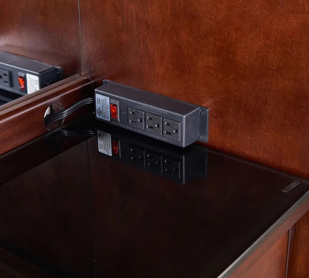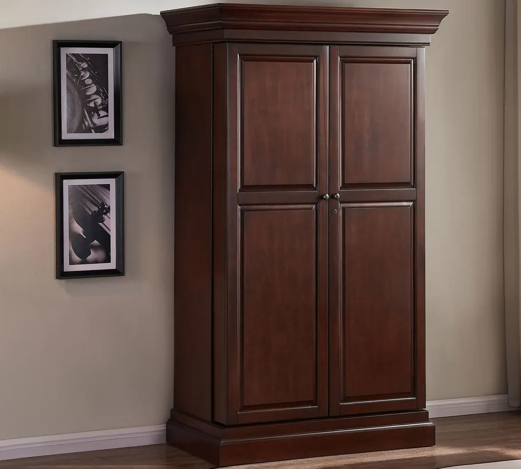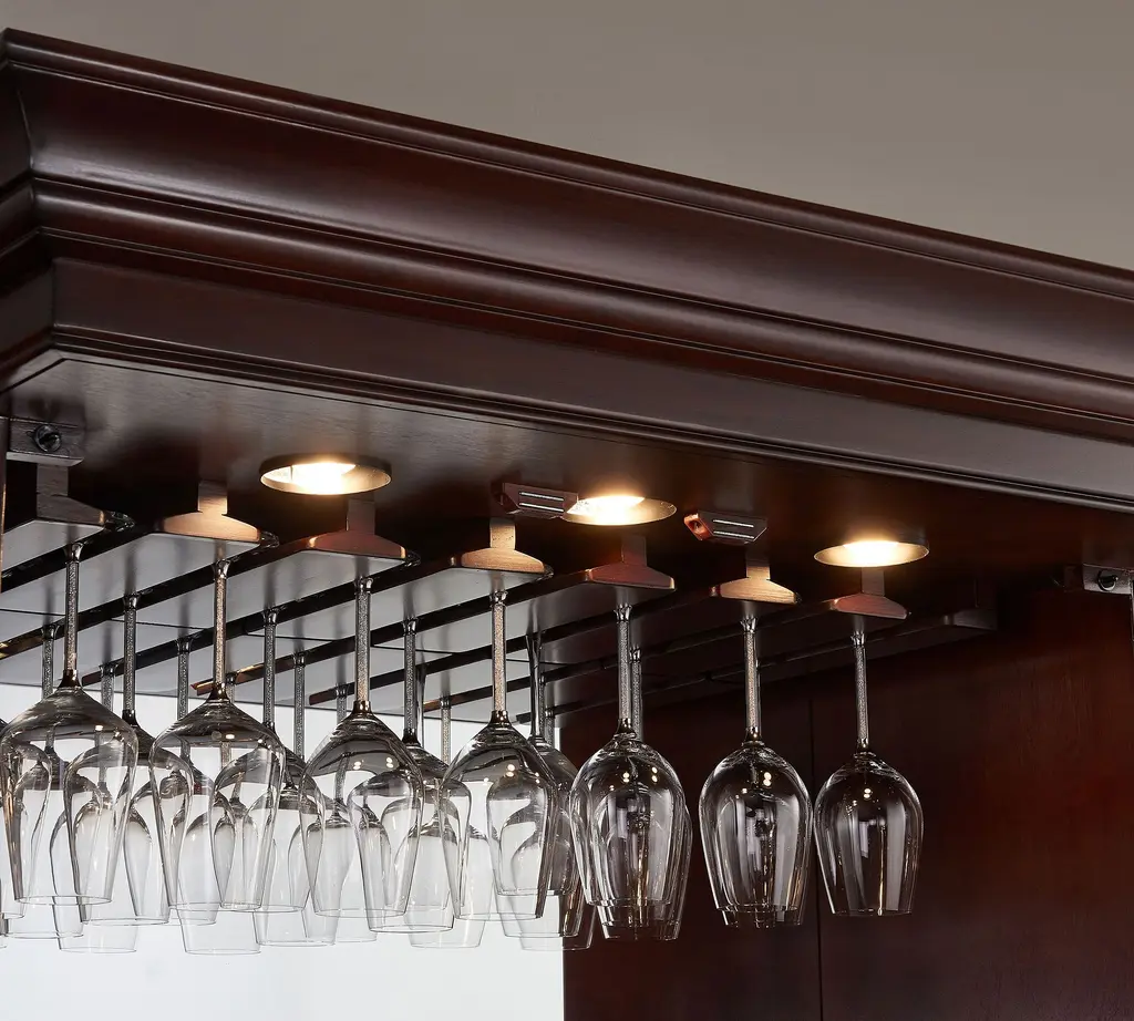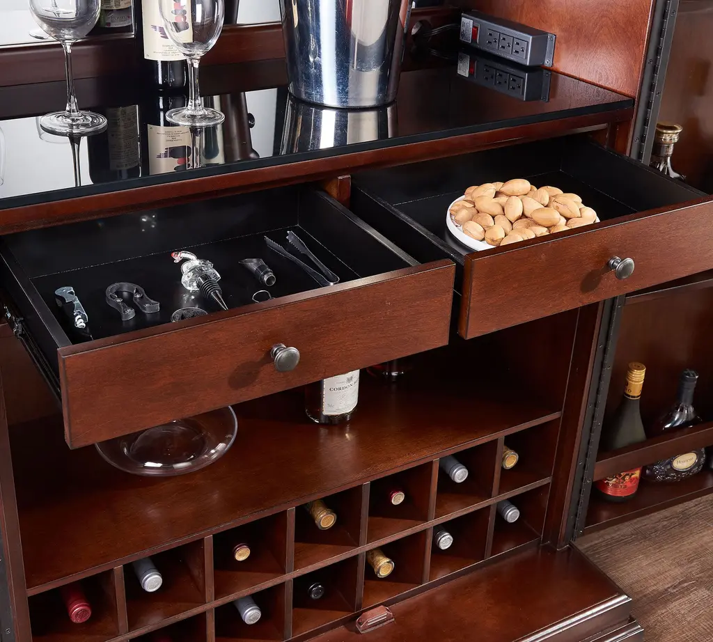 Impressive in stature as well as function, the Melinda Bar Cabinet is made for grand-scale entertaining. It offers a magnificent amount of storage for stemware, bottles, small appliances and more. It features an electrical outlet for mixers, immersion blenders or chargers, and a removable glass workstation allows you to prepare signature cocktails, then take it to the sink for easy cleanup. Glass holders at the top of the unit keep stemware clean and dust-free, and cubbies at the base keep wine bottles safe and protected. Each door has built in shelving for more storage, and two roomy drawers in the center hold bar tools, towels, coasters and more. As a final stroke of genius, ambient lighting activates whenever a door is opened, and turns off when the doors are closed.