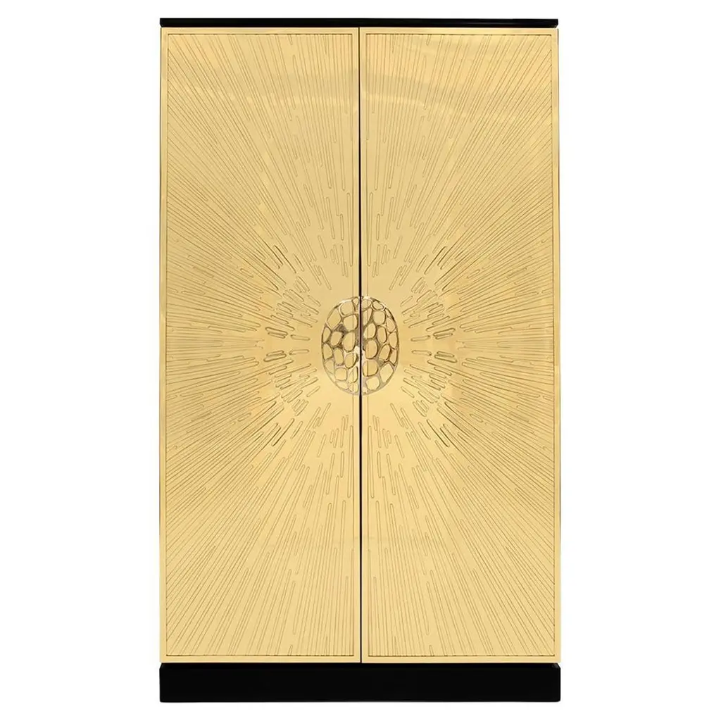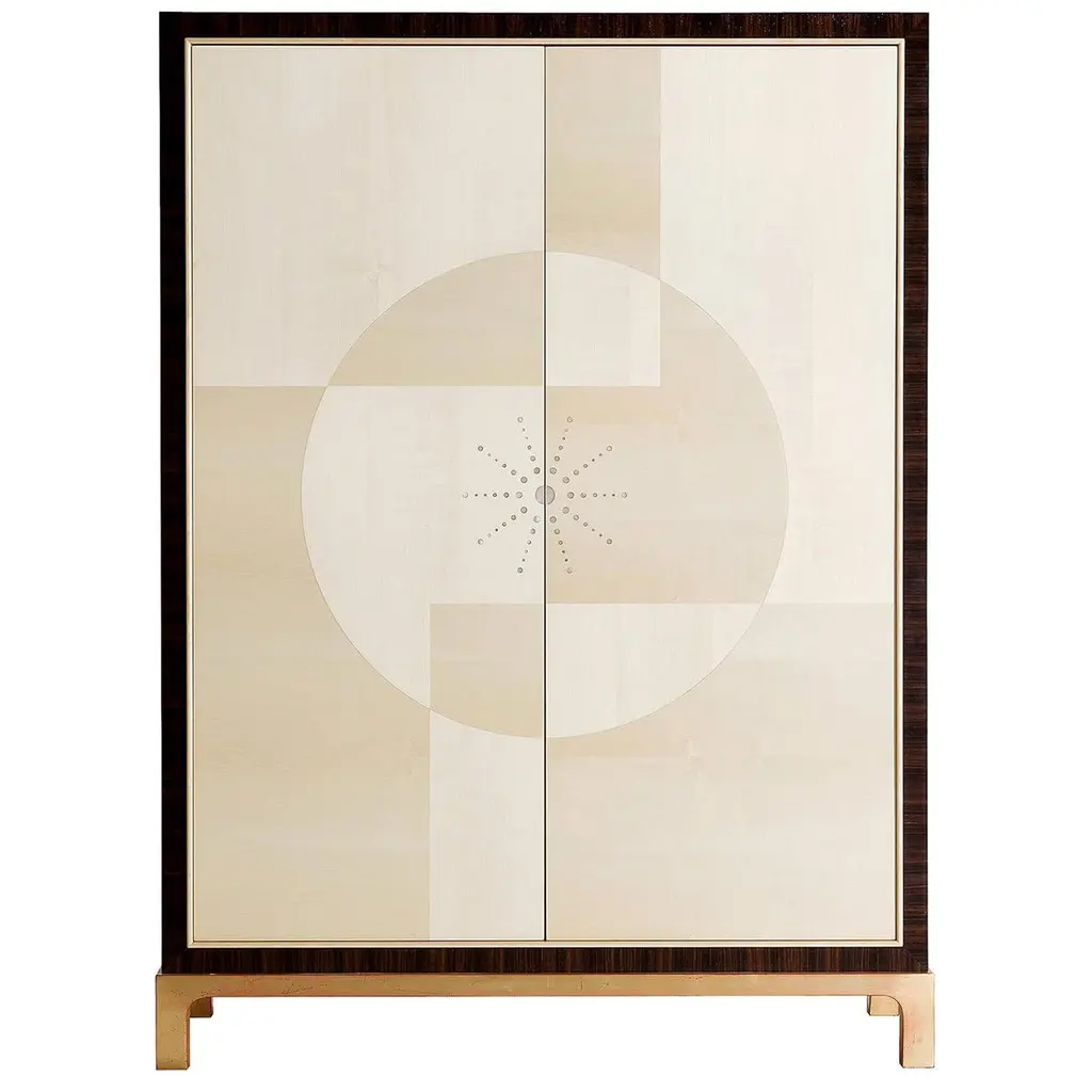 The case in American black walnut is finished in Windsor black with a gold interior. Aztec gold detailing surrounds the tiza gesso door fronts and drawer. Both the doors and the drawer have agate handles. Interior lighting is provided. A touch-sensor button is located under the wood shelf on the far right side.
