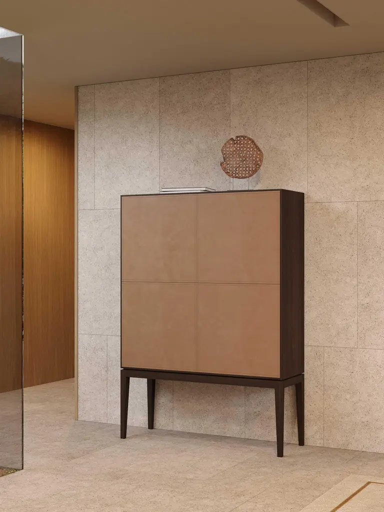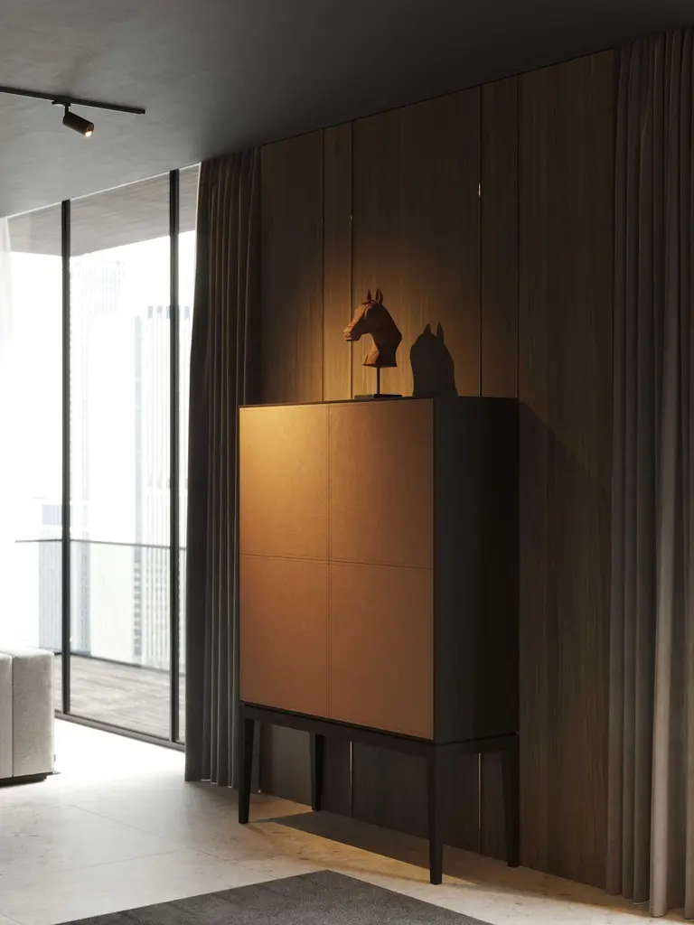 The Heritage collection is based on the transition from the beginning of the Stylish Club brand to what it represents today: luxury, elegance and exclusivity. It is inspired by a heritage of the classic, which continues to stand out in every detail of this collection. It represents pride in the legacy on which the Stylish Club was built on, and a prelude to what this brand is today.Made with the most delicate fabrics and meticulous attention to detail, the Heritage bar unit is an iconic piece from the Stylish Club brand. A piece created to enhance the decor of your space. Luxury lives in this iconic piece. The leather upholstered doors represent the gracefulness and difference that the stylish brand signs in its pieces. Uniquely and exclusively to confer a city and mysterious atmosphere. Dark brown oak is a very resistant and versatile material, ideal for a convivial and dining space. In addition to ensuring these moments, it combines harmoniously in a rustic and modern design style.As the product can be personalised, the image of the presentation is merely illustrative.NotesLacquered metal or other metals - Price on requestClass 1 fabrics include synthetic leather; Natural leather finishing (Class 2) - Price on request.