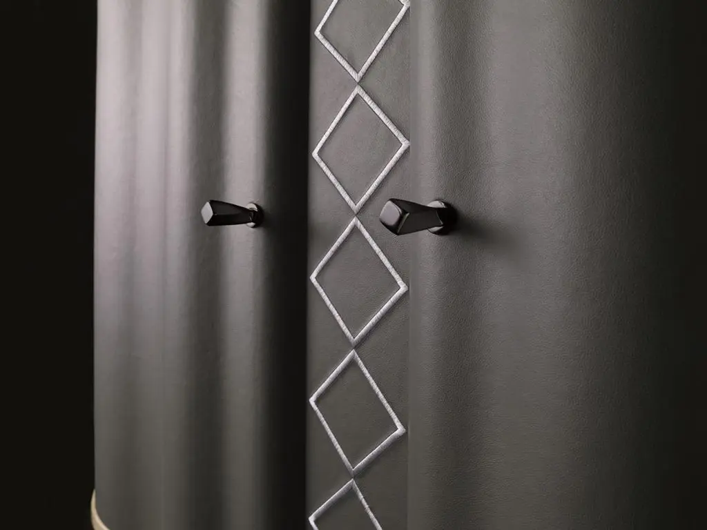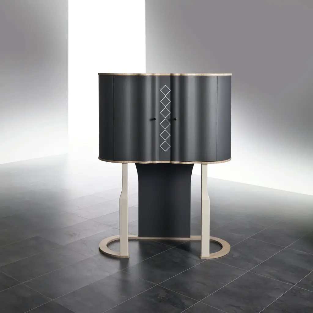 Mobile bar with a particular curved shape. Partially upholstered in leather with embroidered details. The structure is in Pama and the doors covered in leather.