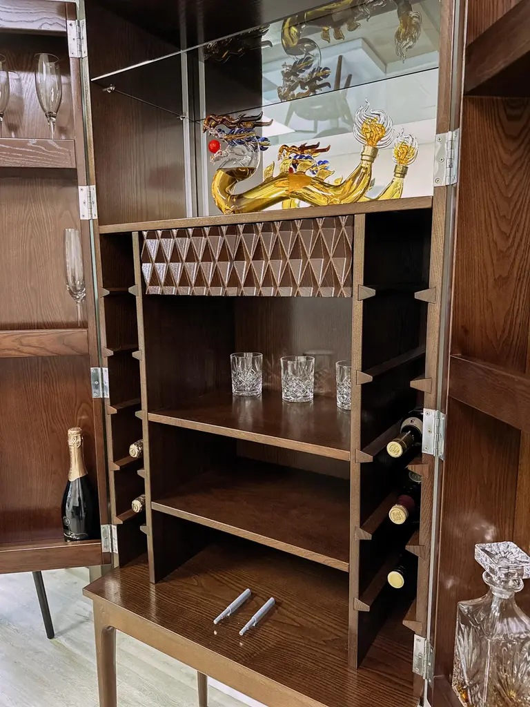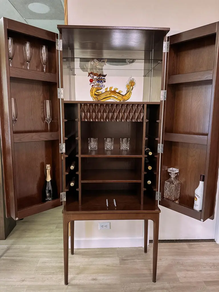 Our custom designed drink cabinet is perfect to store a variety of beverages and glassware. With double doors, our drink cabinet has a glass mirror built into the back to offer unique reflective offerings perfect to serve your guests. New – Brand-new, unused item, not previously owned. Shows absolutely no signs of wear. Dimensions H 75 in. x W 29.5 in. x D 18.5 in. DATE OF MANUFACTURE 2021 The finest natural hard wood – ASH