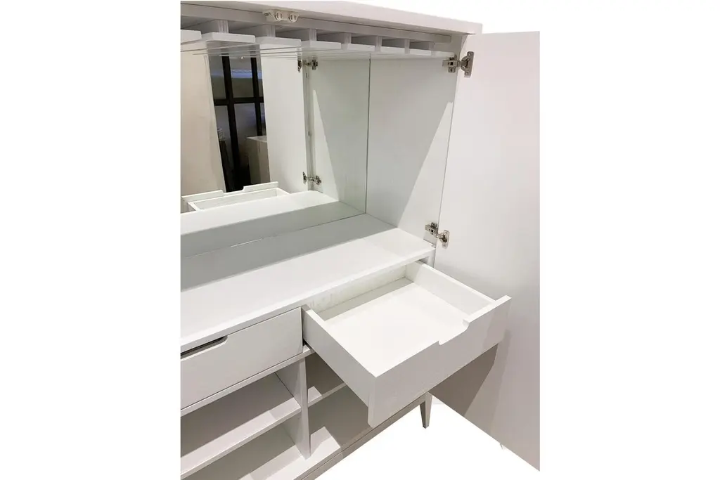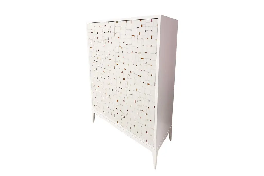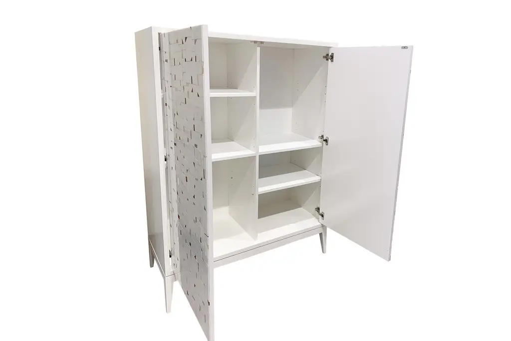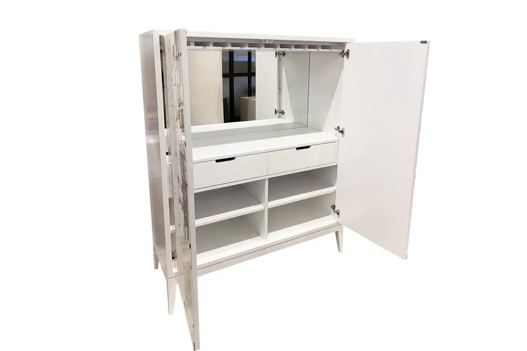 The Milano Terrazzo 2-door bar cabinet by Ercole Home is a 2 door touch latch bar cabinet that is outfitted with two pull out drawers, four interior shelves for storage space, and a wine glass holding rack on top. Perfect for anyone who loves hosting, this piece has a exterior wood finish in a bright painted white and a terrazzo mix of glass covering the face of the doors with specs of red/beige/terrazzo/ivories/ and whites. Inside the bar is a mirrored backing that will compliment the painted white finish. Custom sizes and finishes are available. You can add drawers and compartments in varying sizes to the interior as well.Made in New York City.