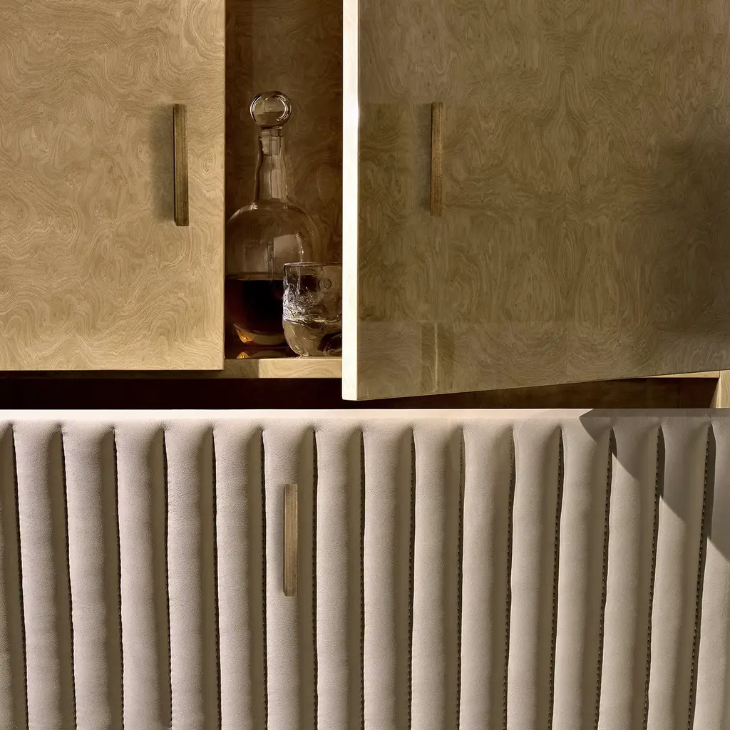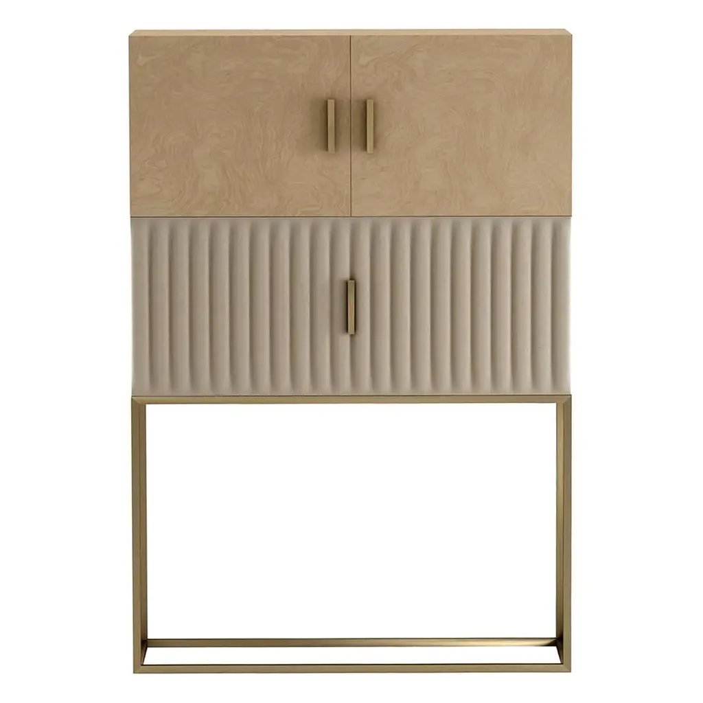 Standing tall on an open brass frame, this vintage-style bar cabinet has a sophisticated and refined look. The structure is made entirely of wood with a myrtle burl veneer and a brushed gloss finish and features a raised platform top with two sections. The upper compartment has two wooden doors embellished with linear brass handles. The front panel of the lower section is upholstered with grosgrain leather and flips open with a brass handle to double down as surface for the mini-bar or showcase a curated bottle collection.