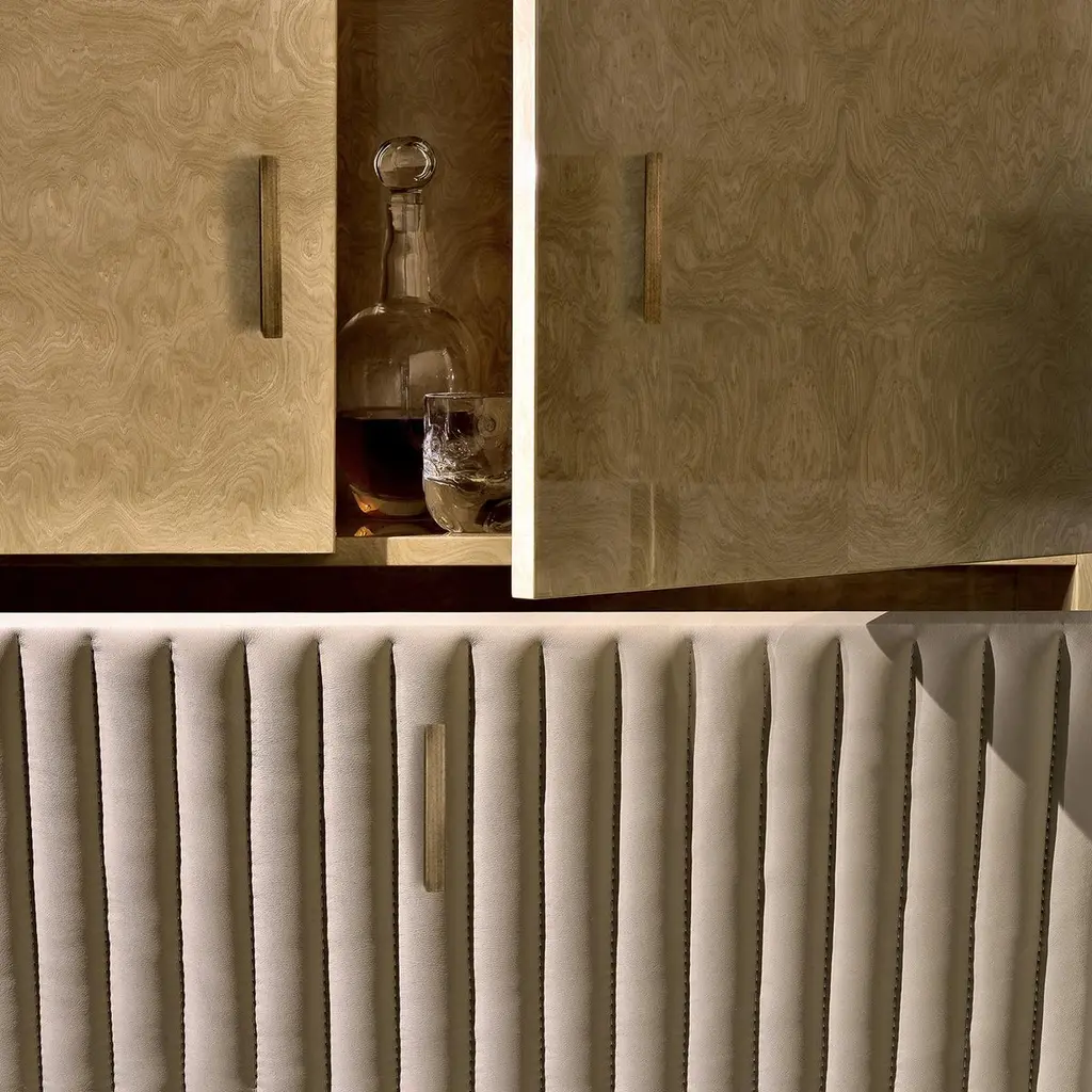 Standing tall on an open brass frame, this vintage-style bar cabinet has a sophisticated and refined look. The structure is made entirely of wood with a myrtle burl veneer and a brushed gloss finish and features a raised platform top with two sections. The upper compartment has two wooden doors embellished with linear brass handles. The front panel of the lower section is upholstered with grosgrain leather and flips open with a brass handle to double down as surface for the mini-bar or showcase a curated bottle collection.